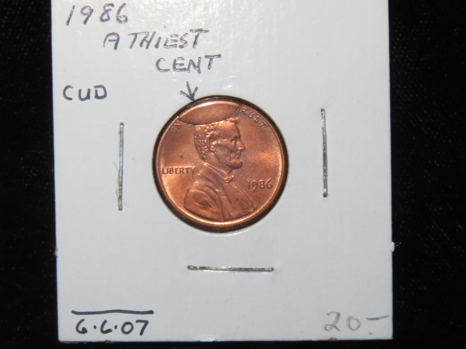 1986 United States of America Lincoln Penny, “Atheist Cent”, Rim Cud- A cud on a coin is a damaged area resembling a blob on the surface of a coin. The cud is raised above the field, obliterating the device or inscription where it appears. Cuds result from die cracks or die breaks that have become severe. They can also form from die chips were part of the die surface has become damaged and broken away. In this example, the word God is covered, thus “Atheist”