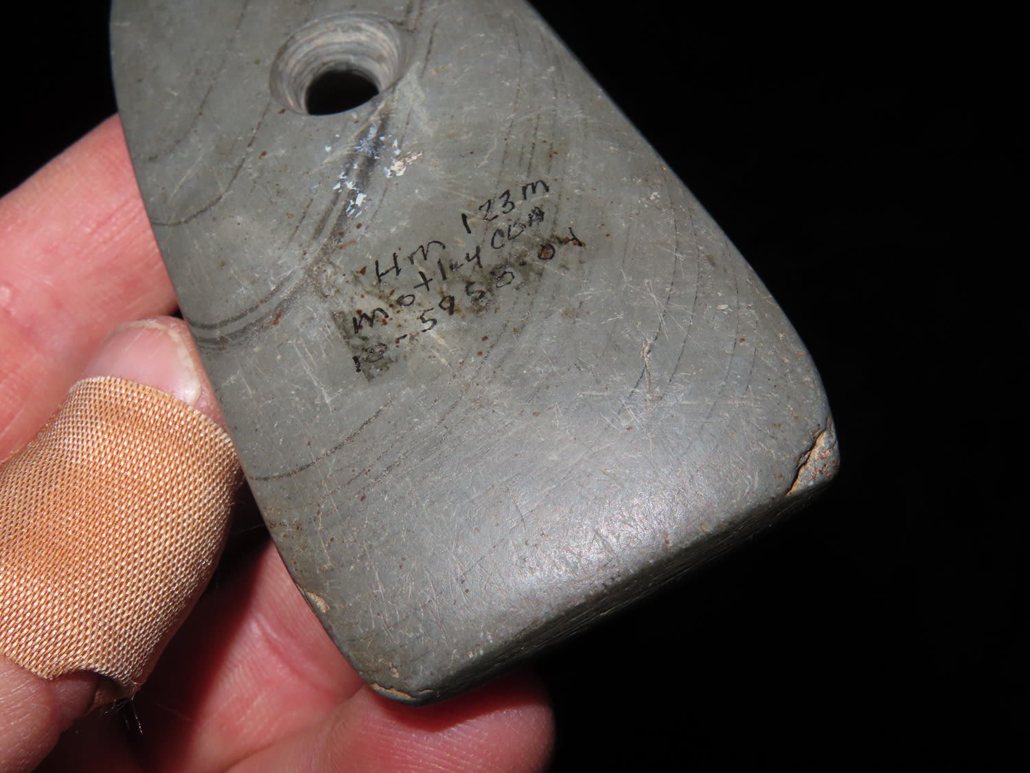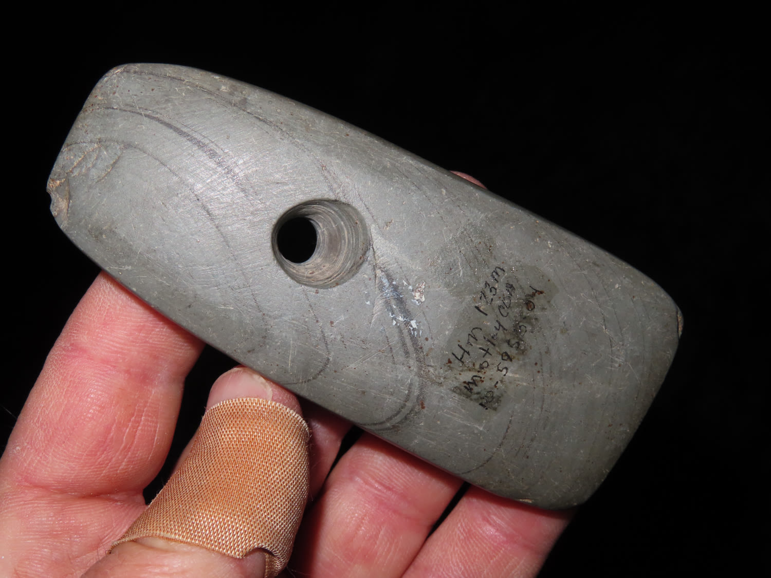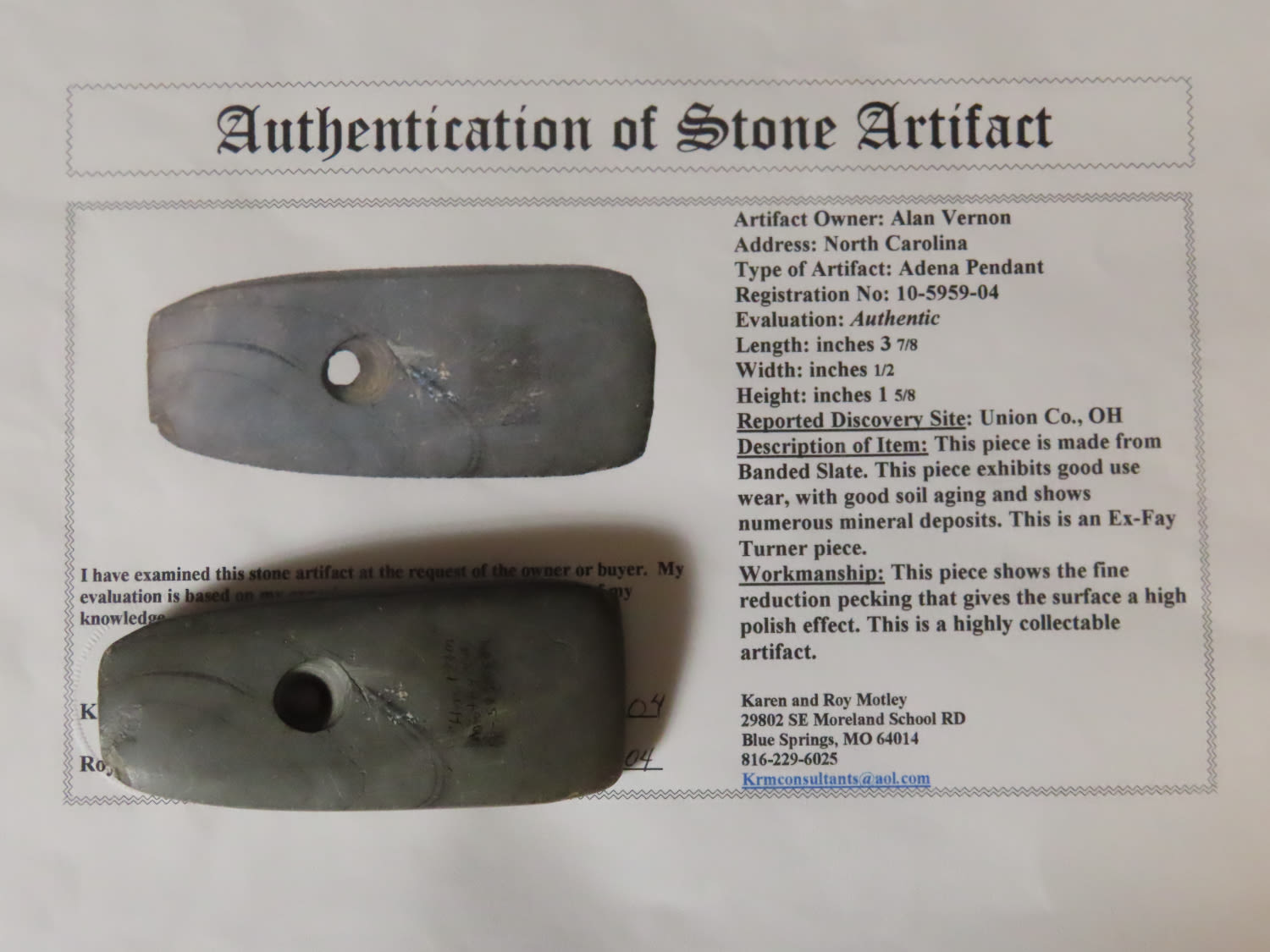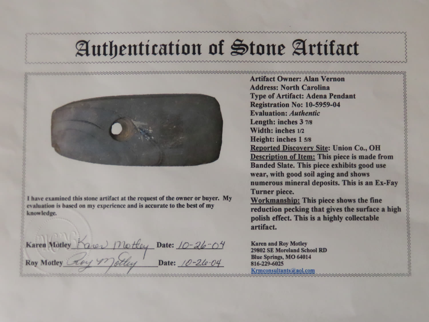 3 7/8″ Adena Pendant, Motley COA, found in Union Co., North Carolina, Ex Alan Vernon Collection