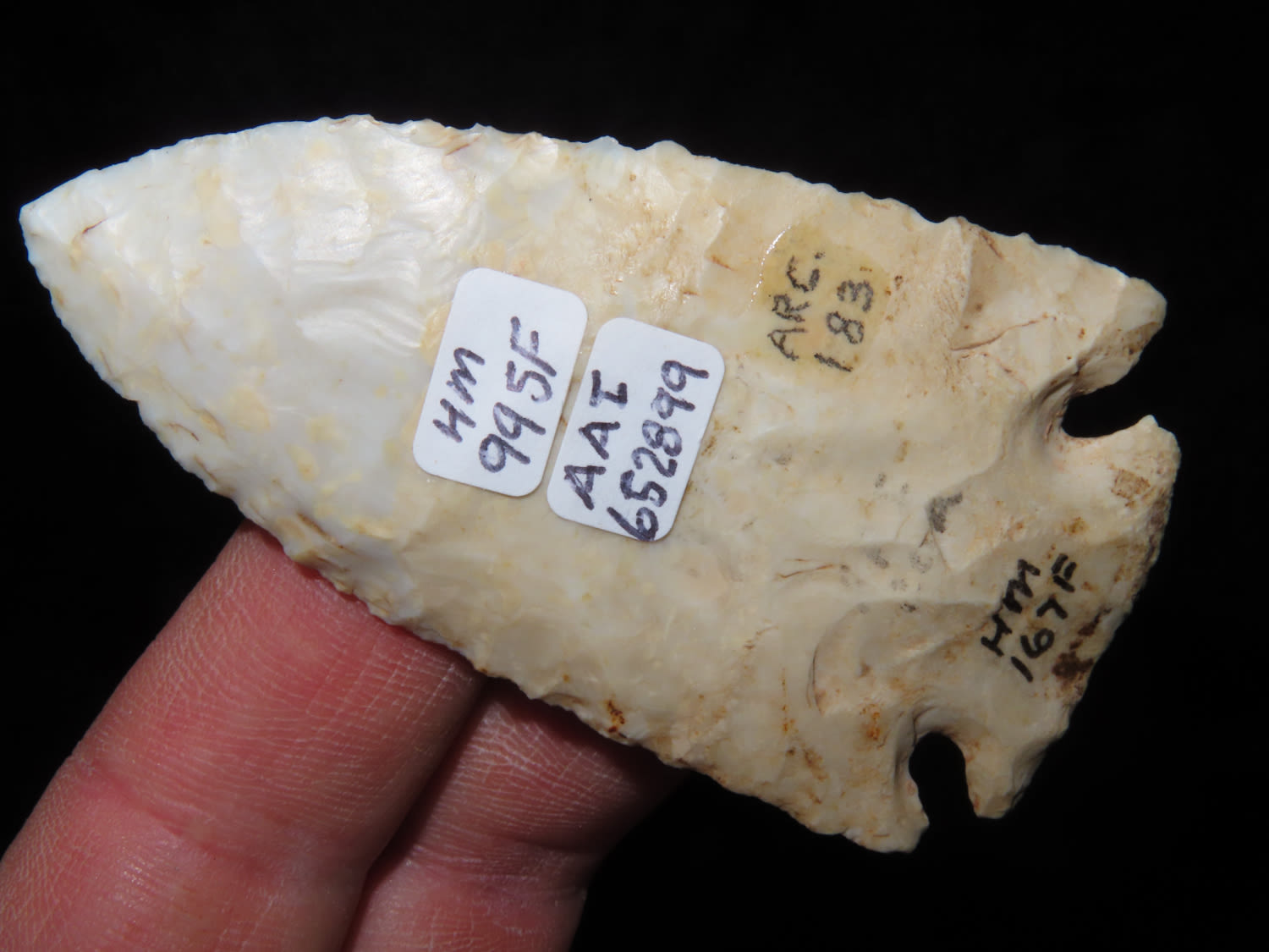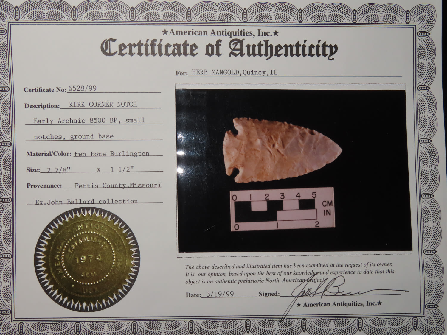 2 7/8″ Kirk Corner Notch, Berner COA, found in Pettis Co., Missouri, Ex Herb Mangold Collection, Ex John Ballard Collection