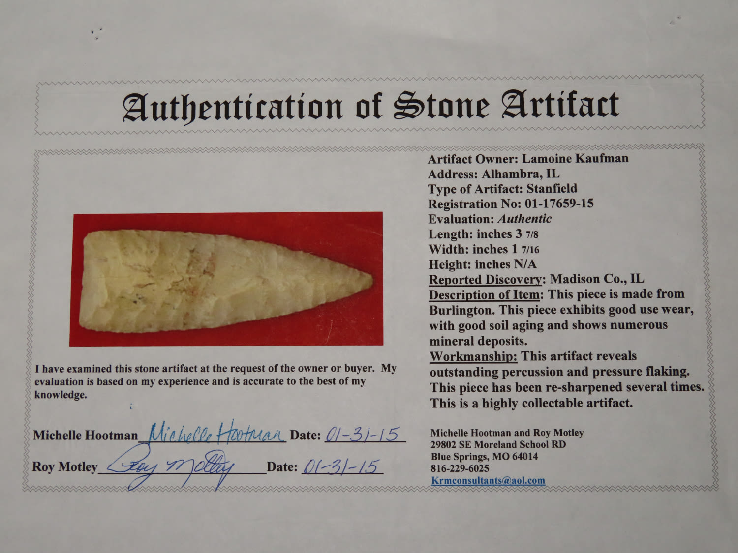 3 7/8" Stanfield, Motley COA, found in Madison Co., Illinois, Ex Lamoine Kaufman Collection