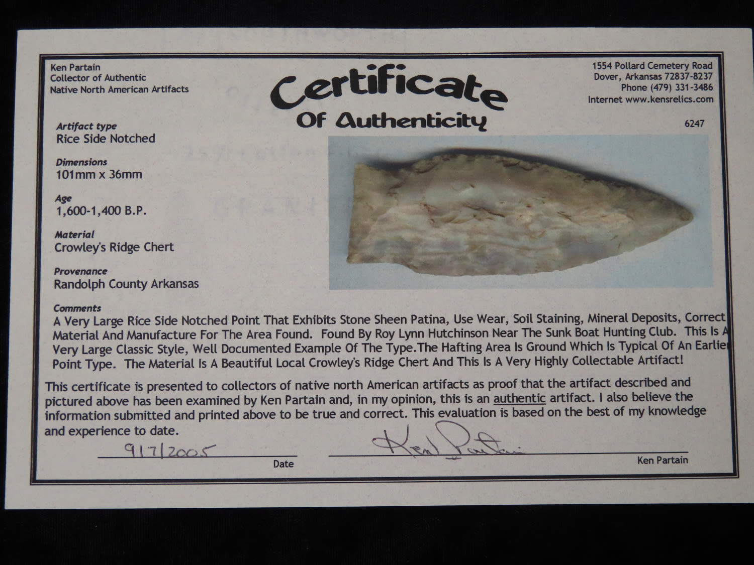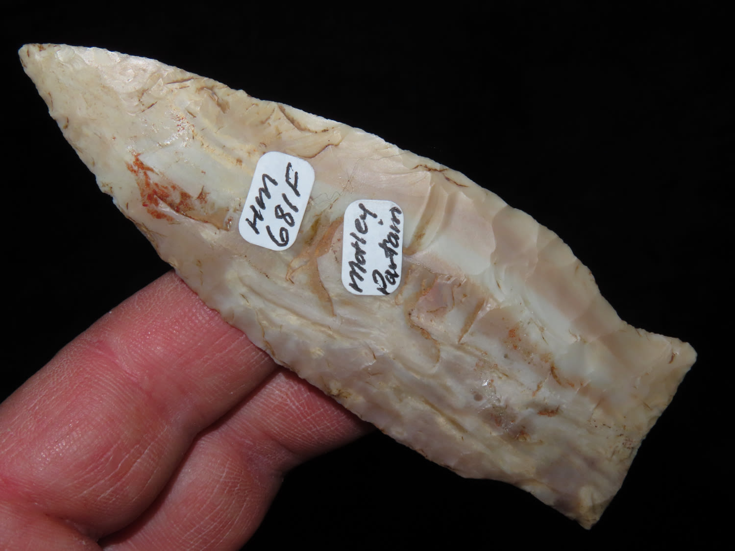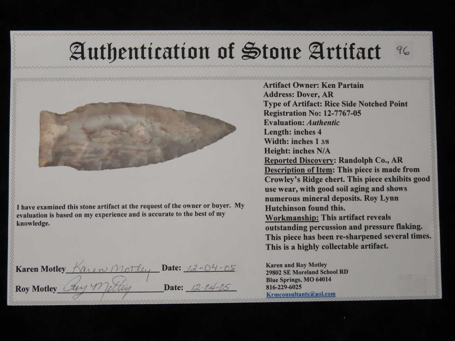 4″ Rice Side Notched Point, 2x COA- Partain/Motley- Made of Crowley’s Ridge Chert, found in Randolph Co., Arkansas by Roy Lynn Hutchison, Ex Ken Partain Collection