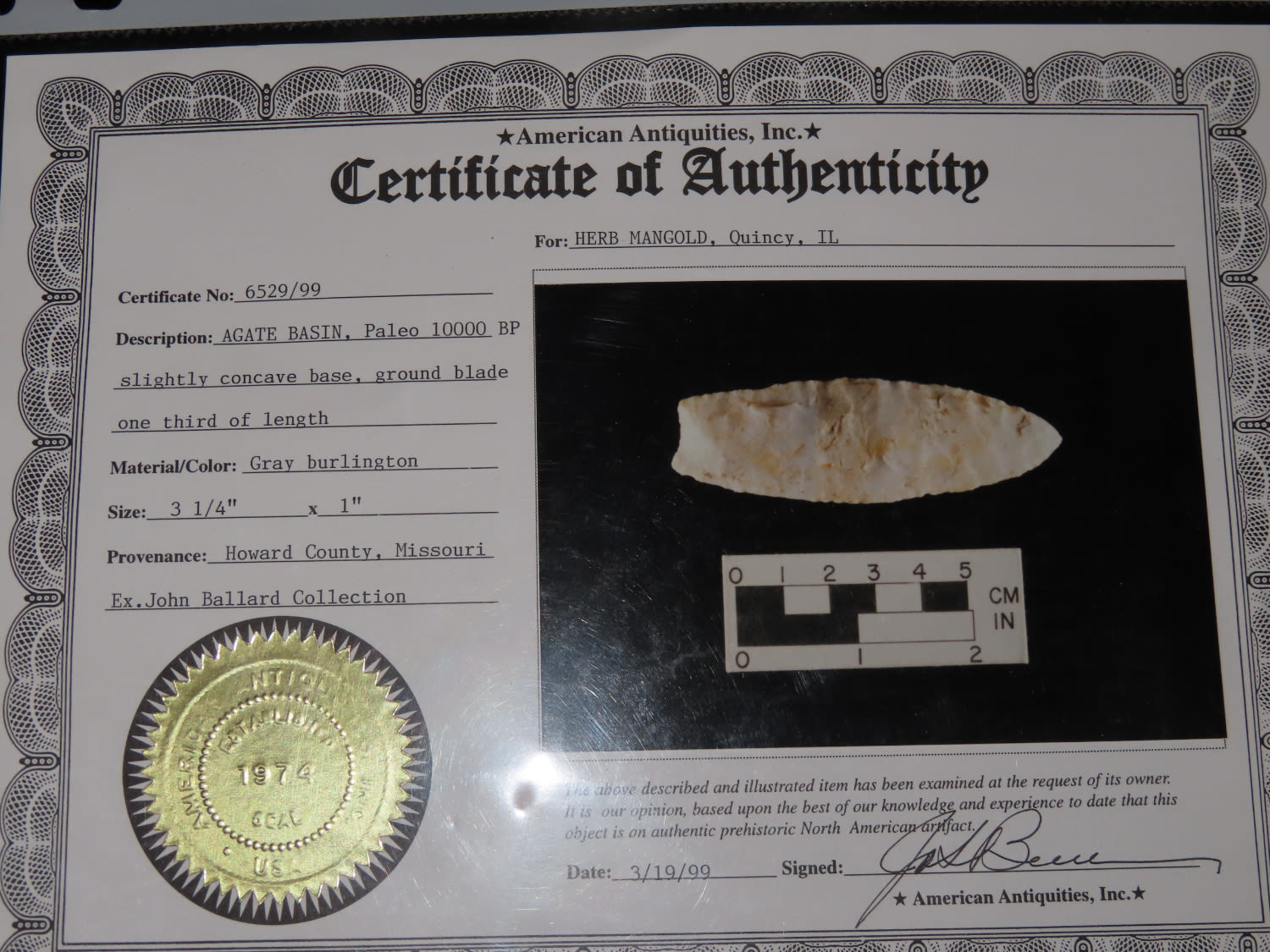 3 1/4" Agate Basin, Berner COA, found in Howard Co., Missouri, Ex John Ballard Collection, Ex Herb Mangold