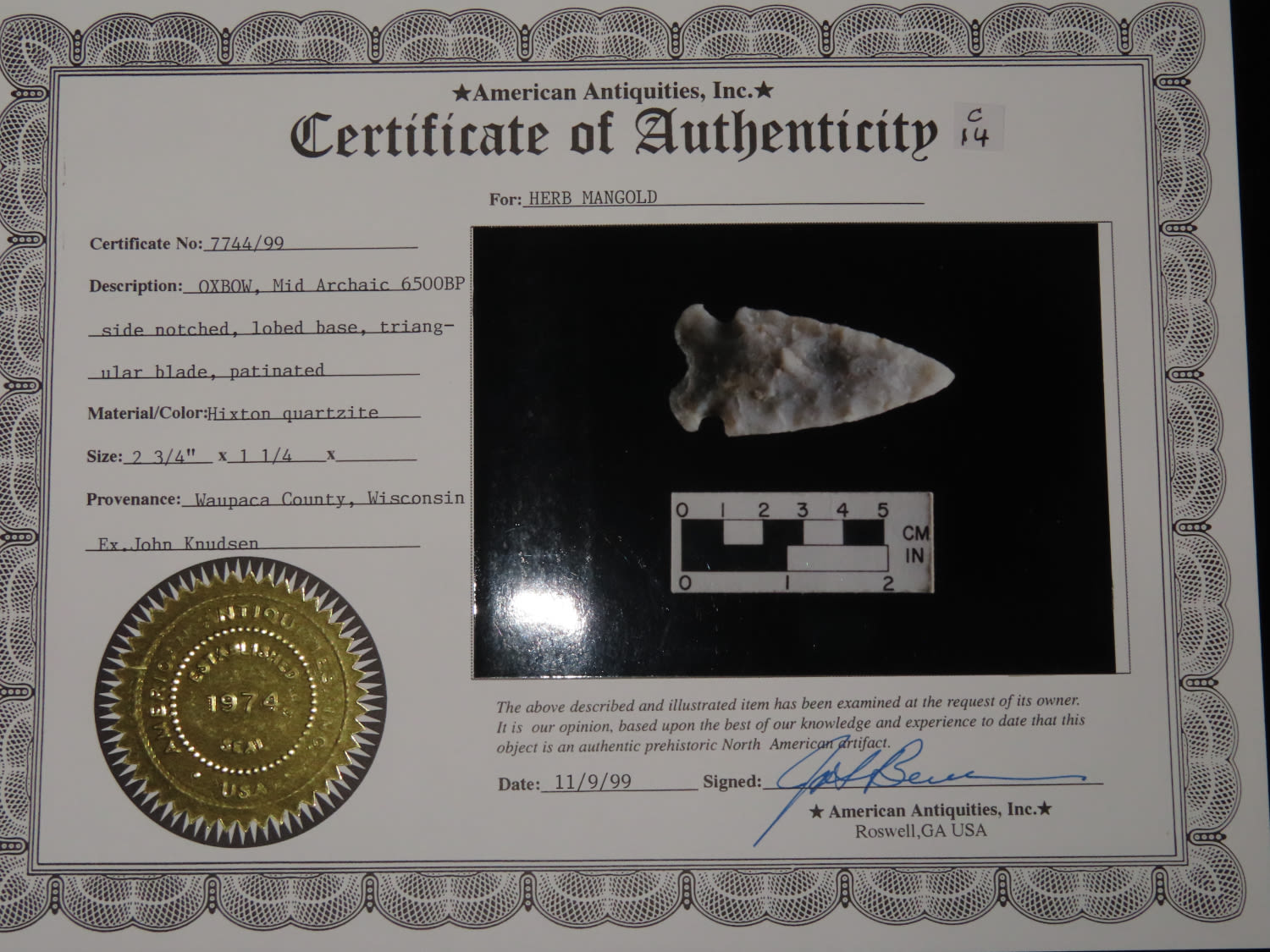 2 3/4″ Oxbow, Berner COA, made of Hixton Quartzite, found in Waupaca Co., Wisconsin Ex John Knudsen, Ex Herb Mangold Collections