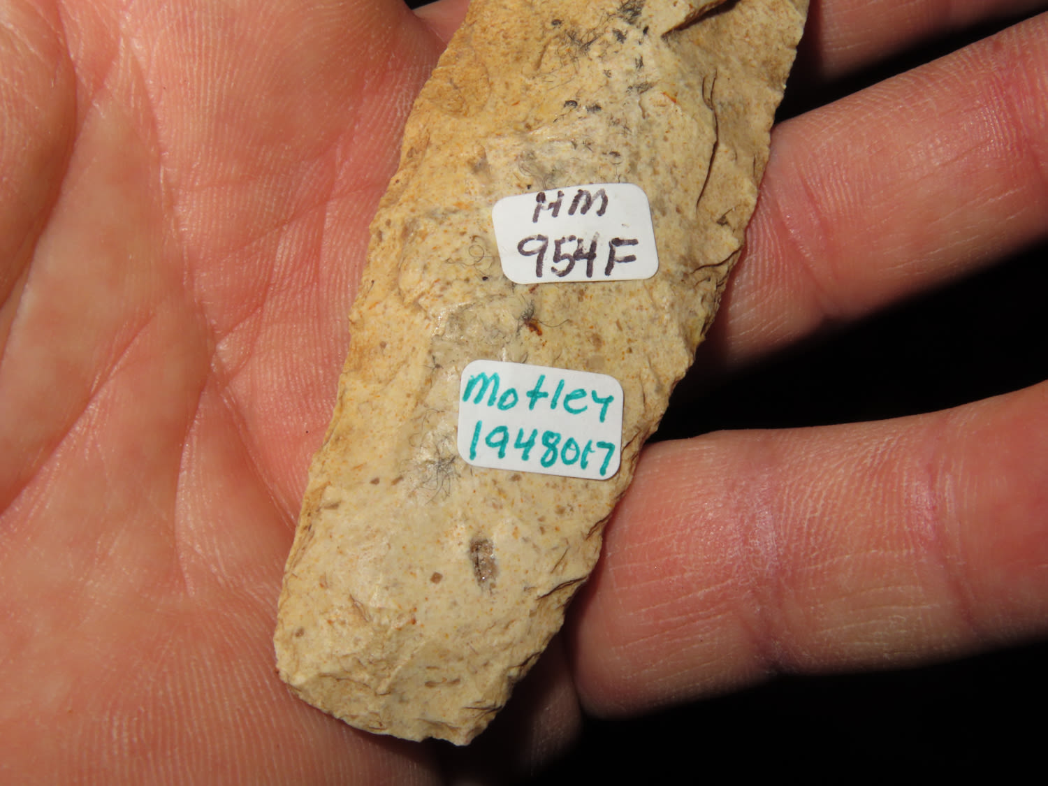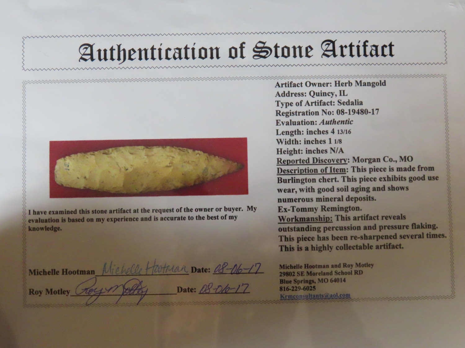4 13/16″ Sedalia, Motley COA, found in Morgan Co., Missouri, Ex Tommy Remington, Ex Herb Mangold