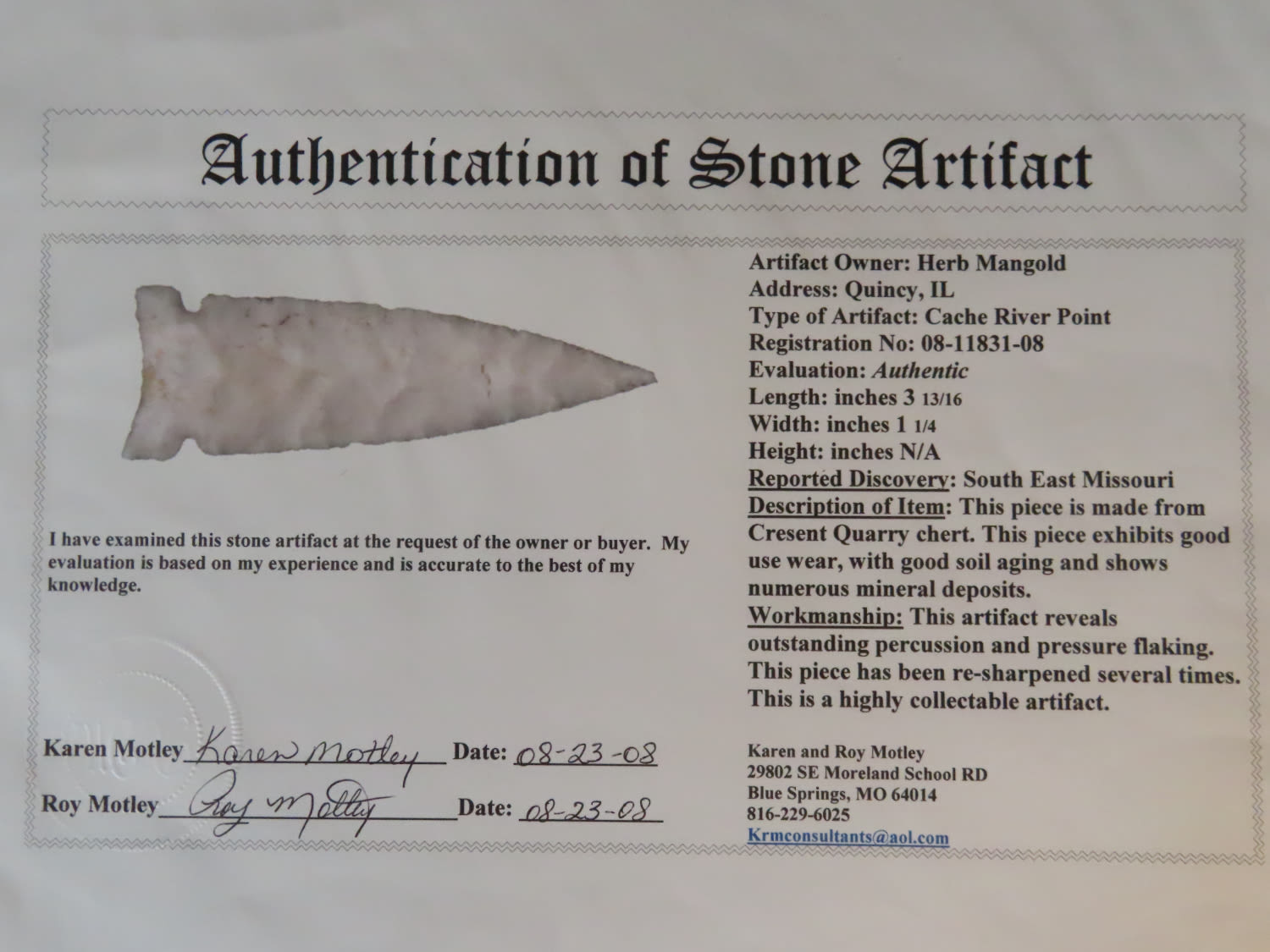 3 13/16″ Cache River Point, Motley COA, found in SE Missouri, Ex Herb Mangold Collection