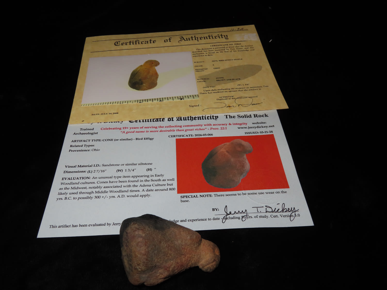 2 7/16″ Bird Effigy Pestle, 2x COA-Dickey/Davis, found in Ohio