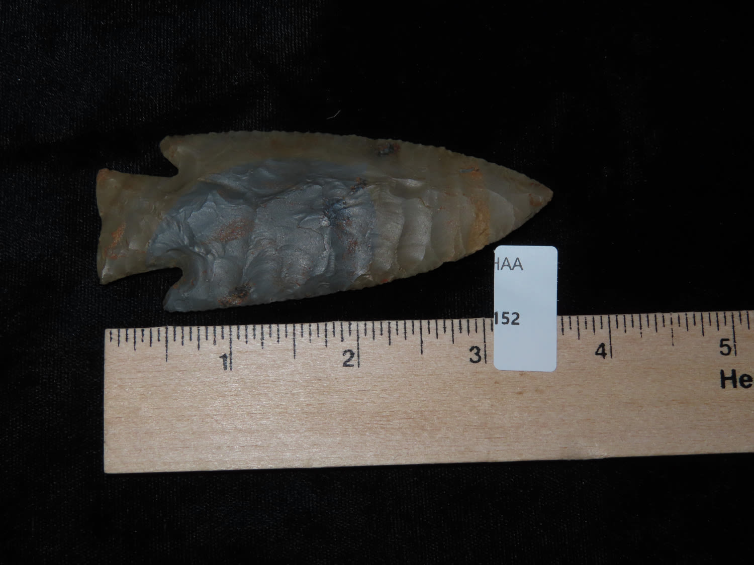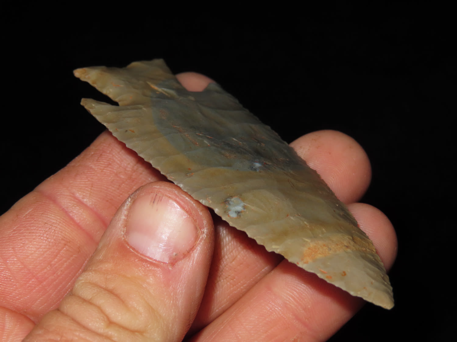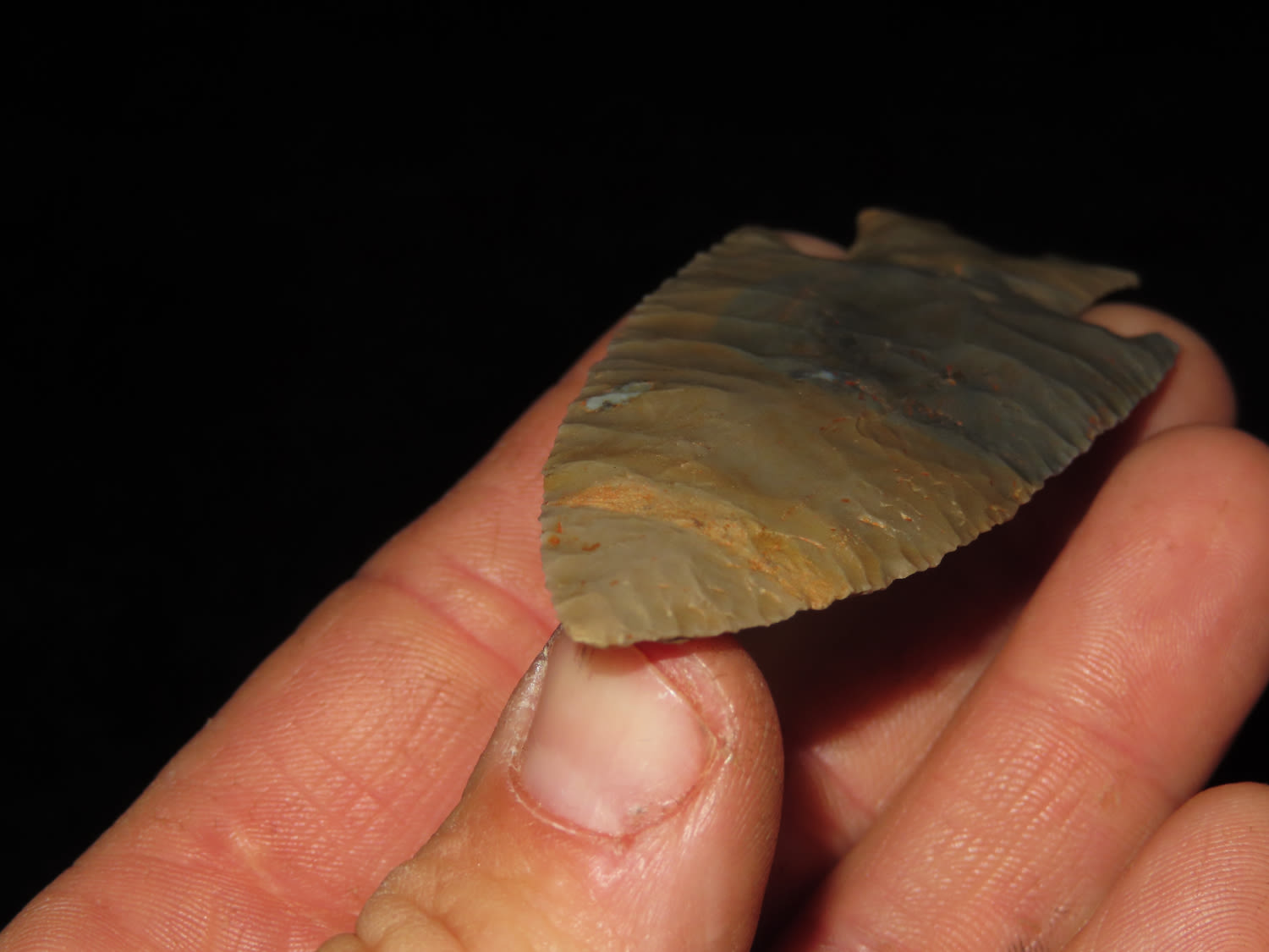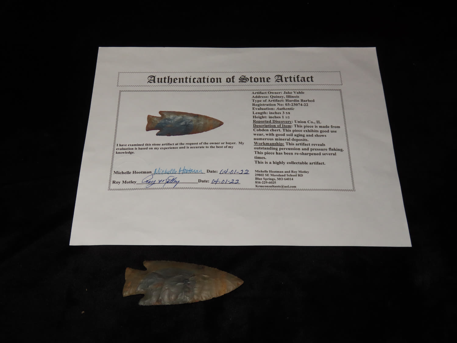 3 5/8″ Hardin Barbed, Motley COA, found in Union Co., Illinois-Made of Super Colorful Cobden Chert