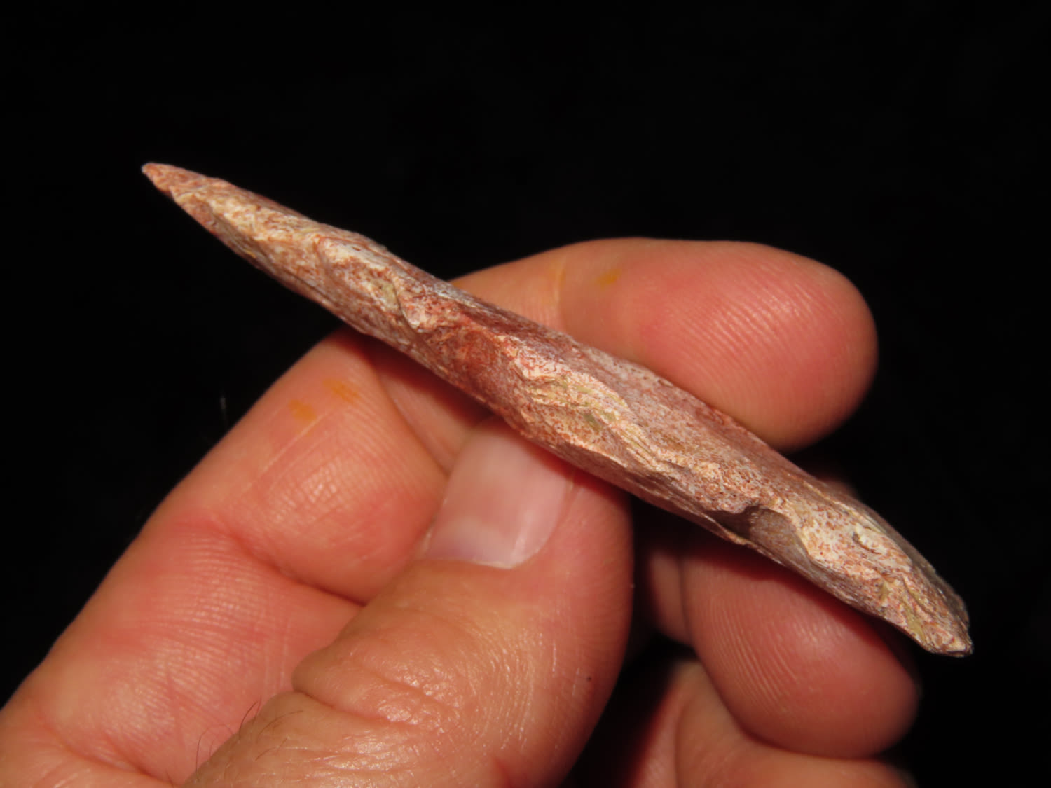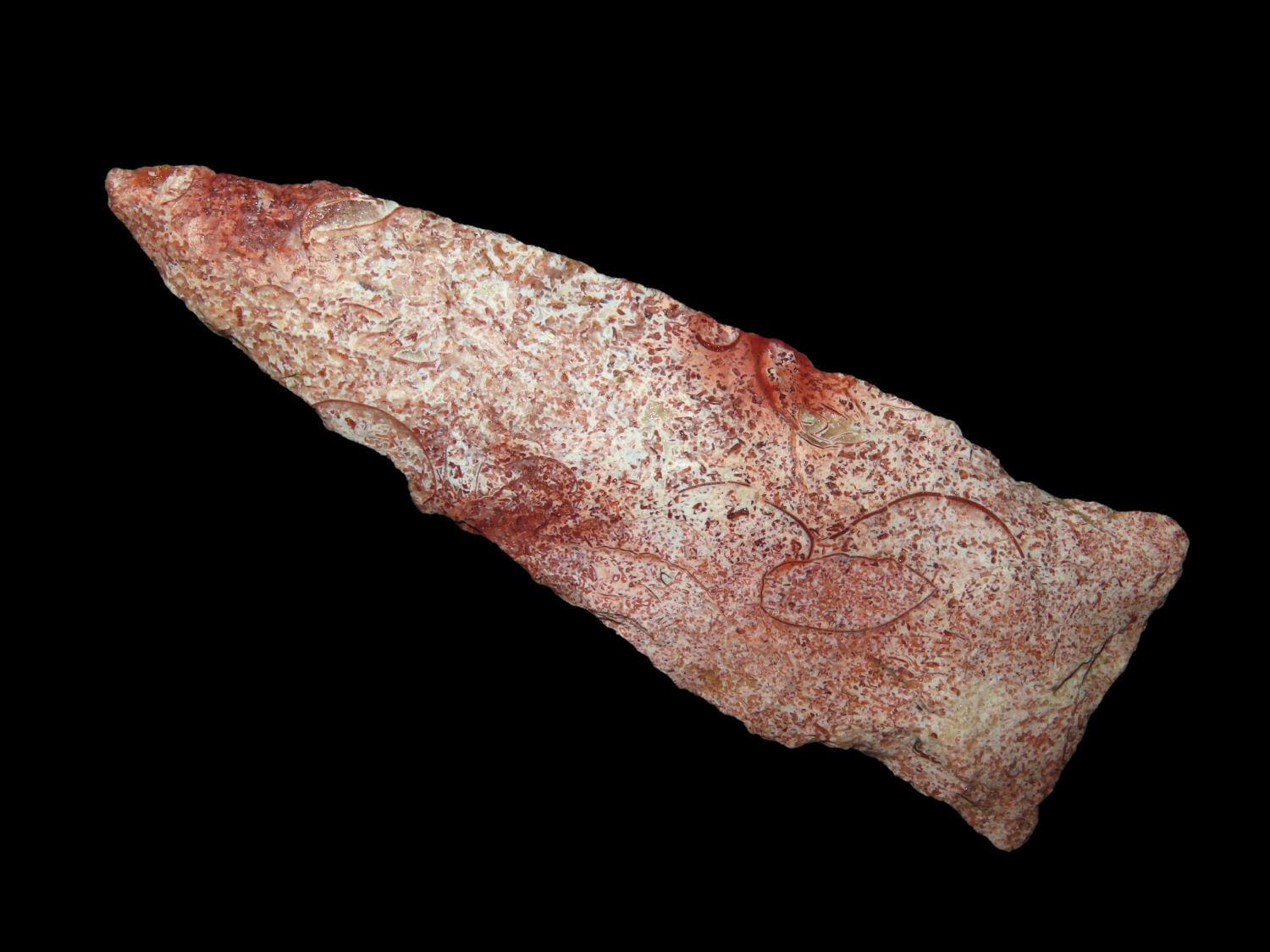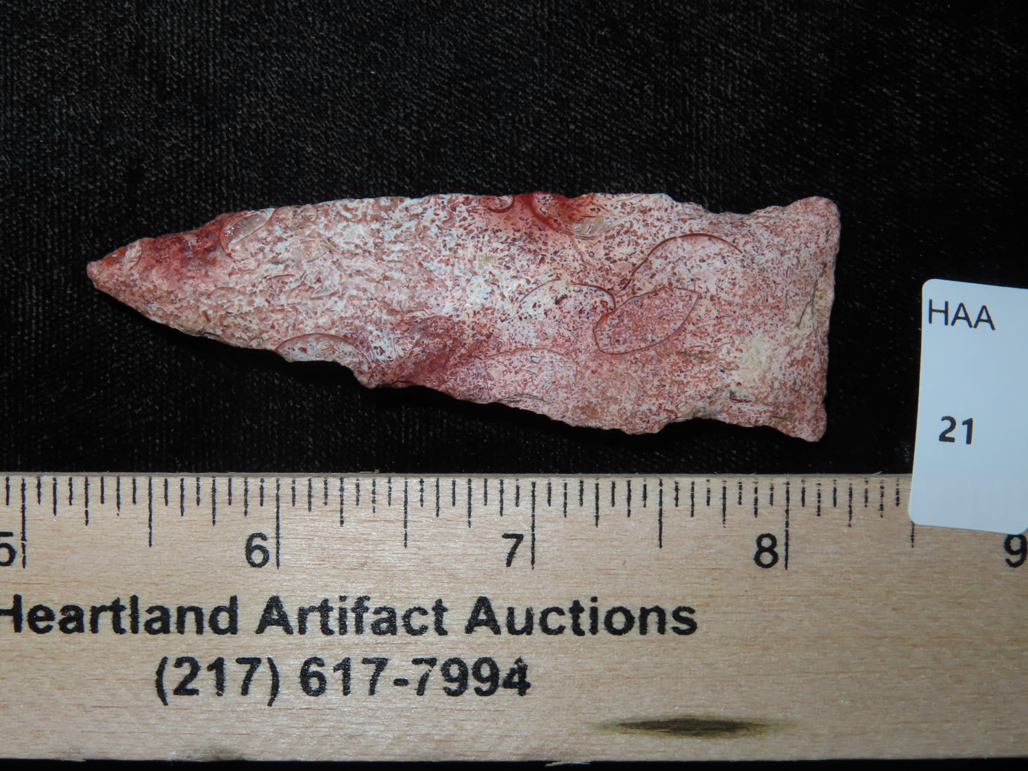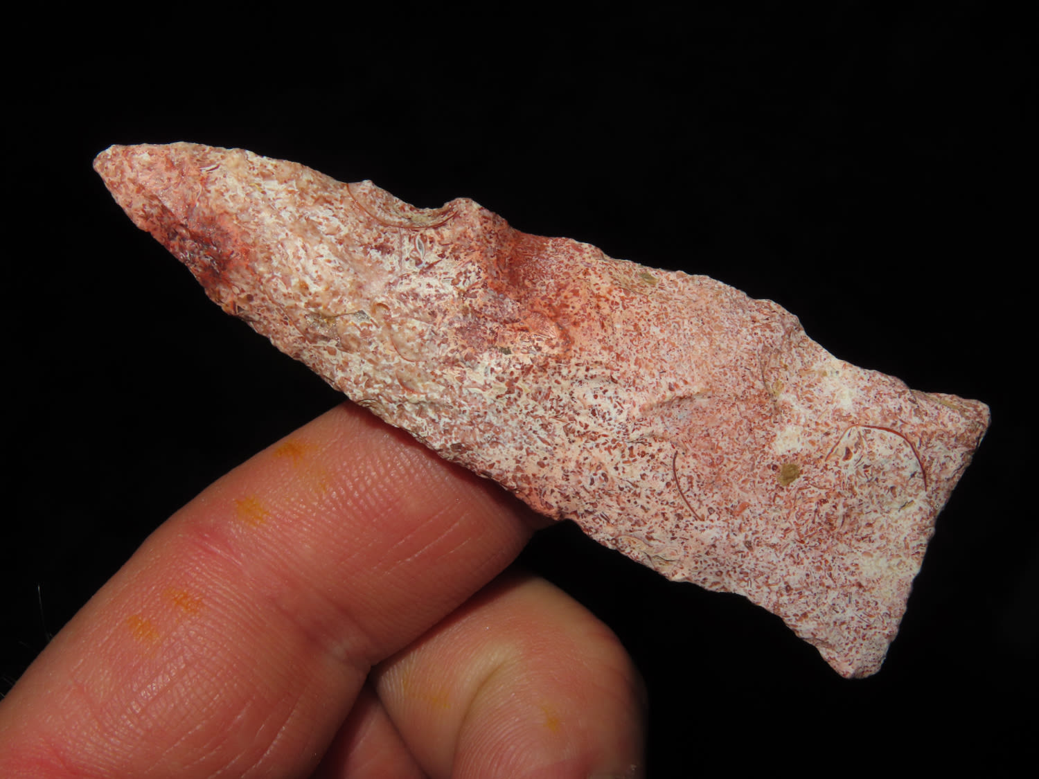 2.15/16″ Super Colorful Rice Side Notch, Lewis Co MO, Ex Jake Vahle Coll. These are points out of Jake’s smalls frame which he found intriguing over the years.