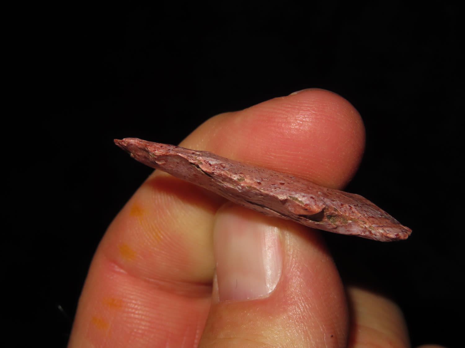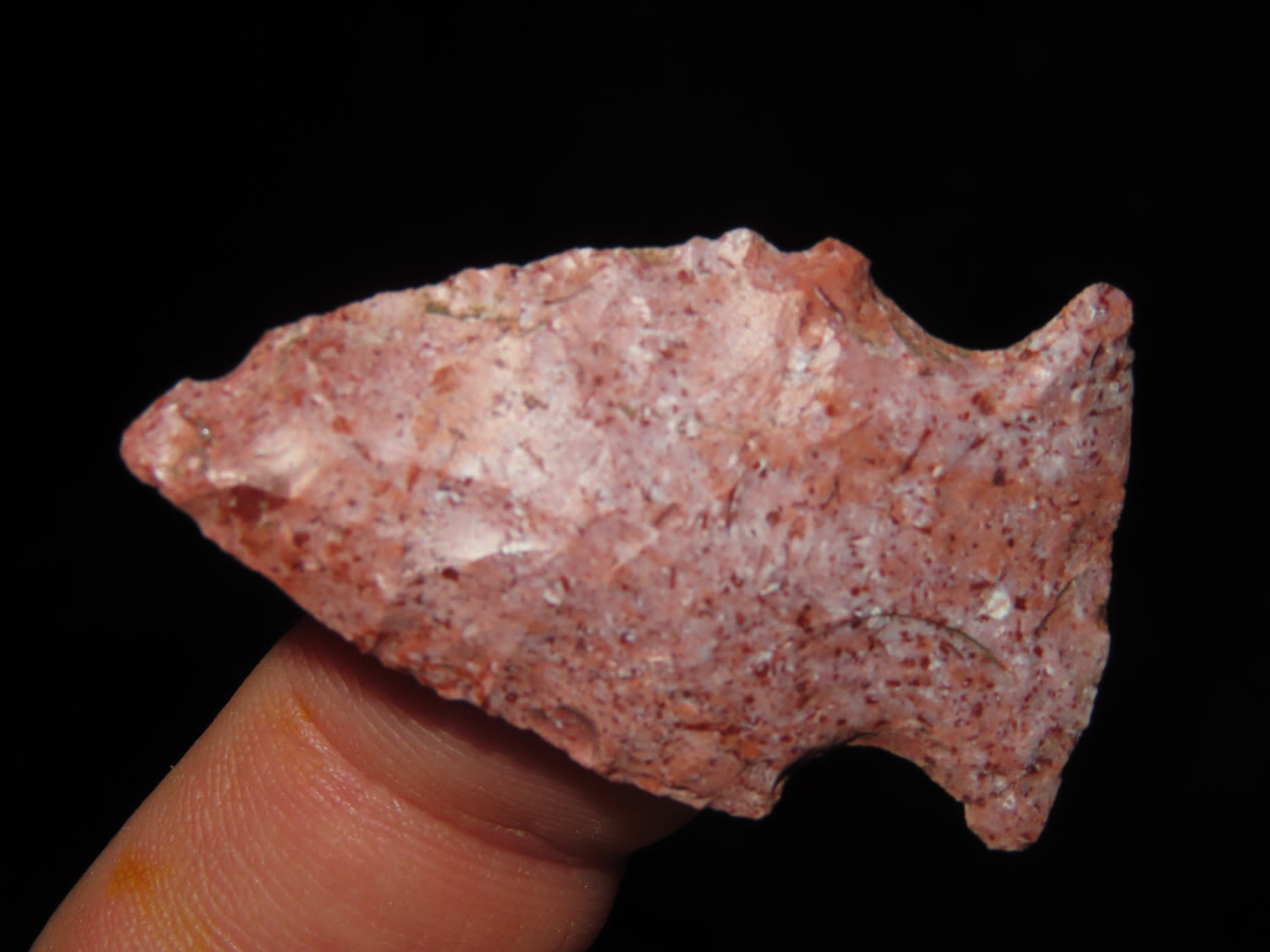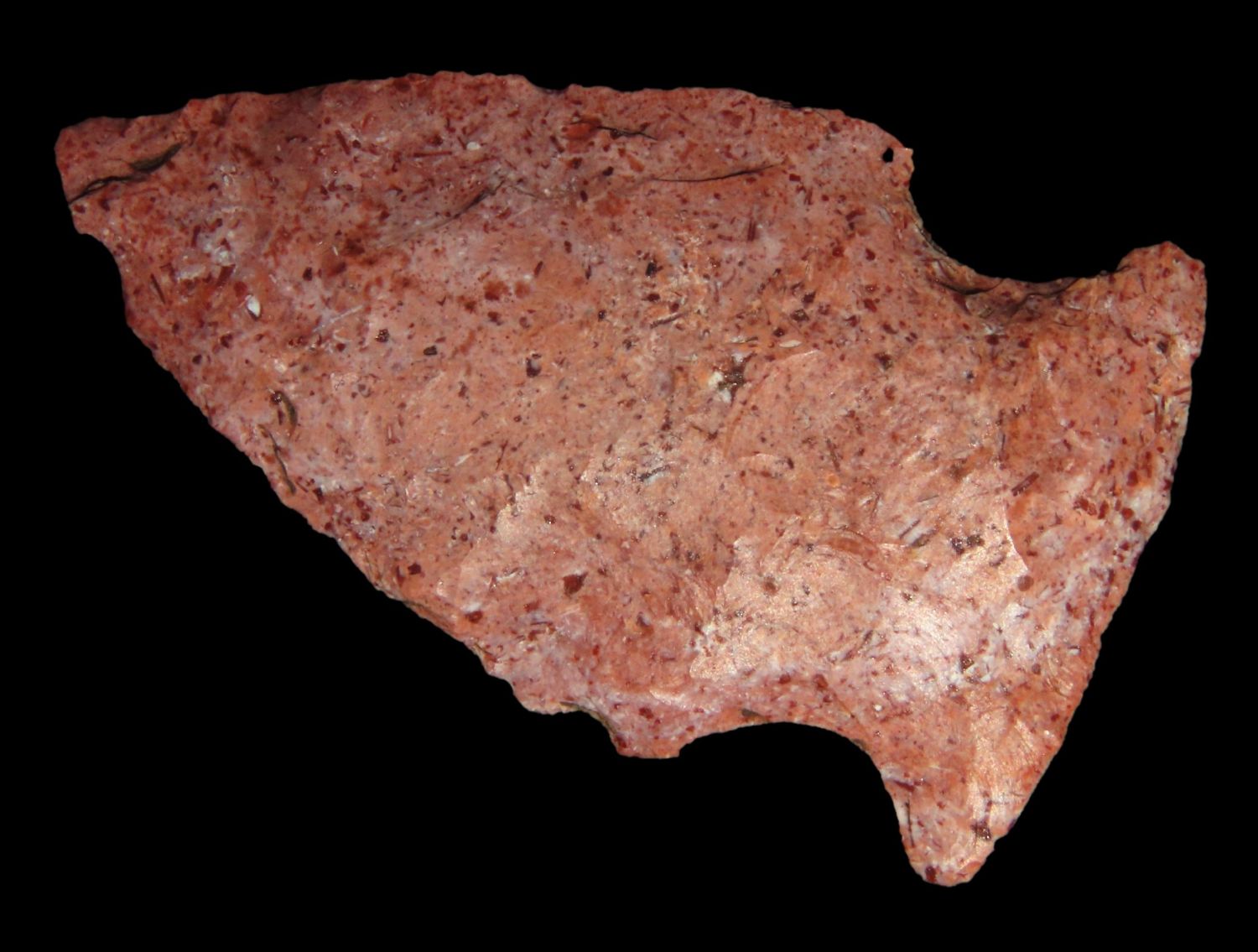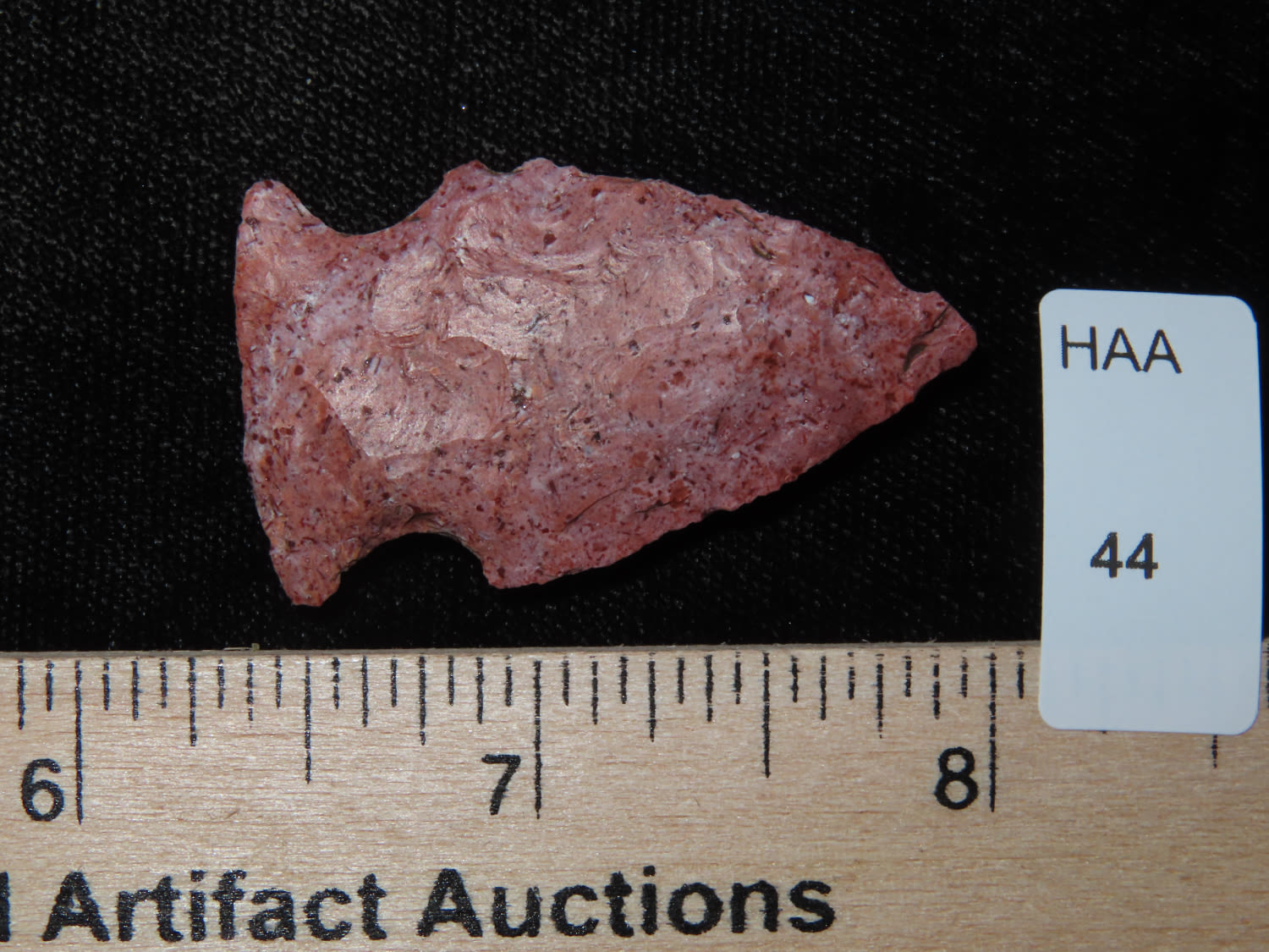 1.5/8″ Hopewell Point made from bright red heated Burlington chert. Ex Jake Vahle Coll. These are points out of Jake’s smalls frame which he found intriguing over the years.