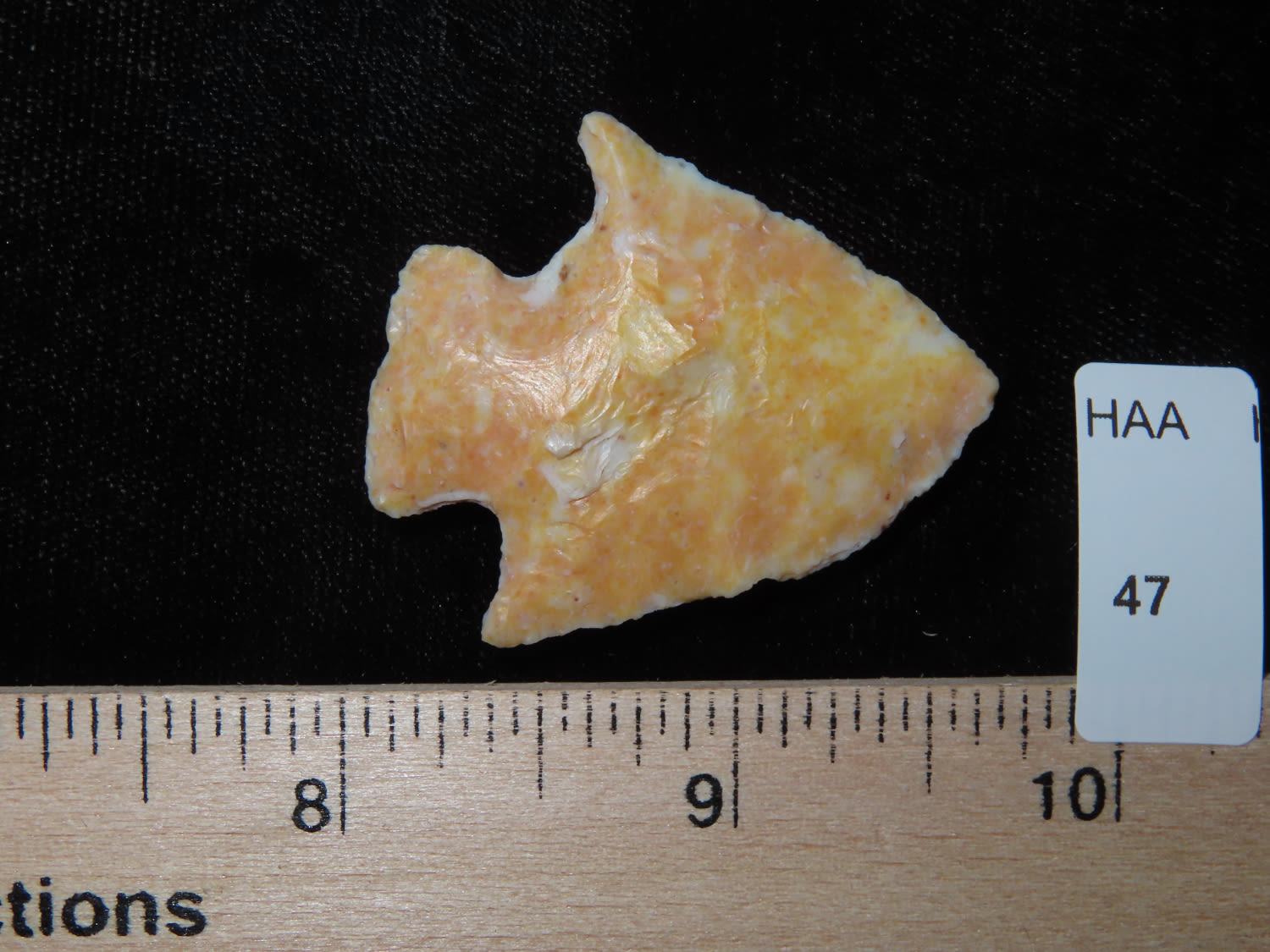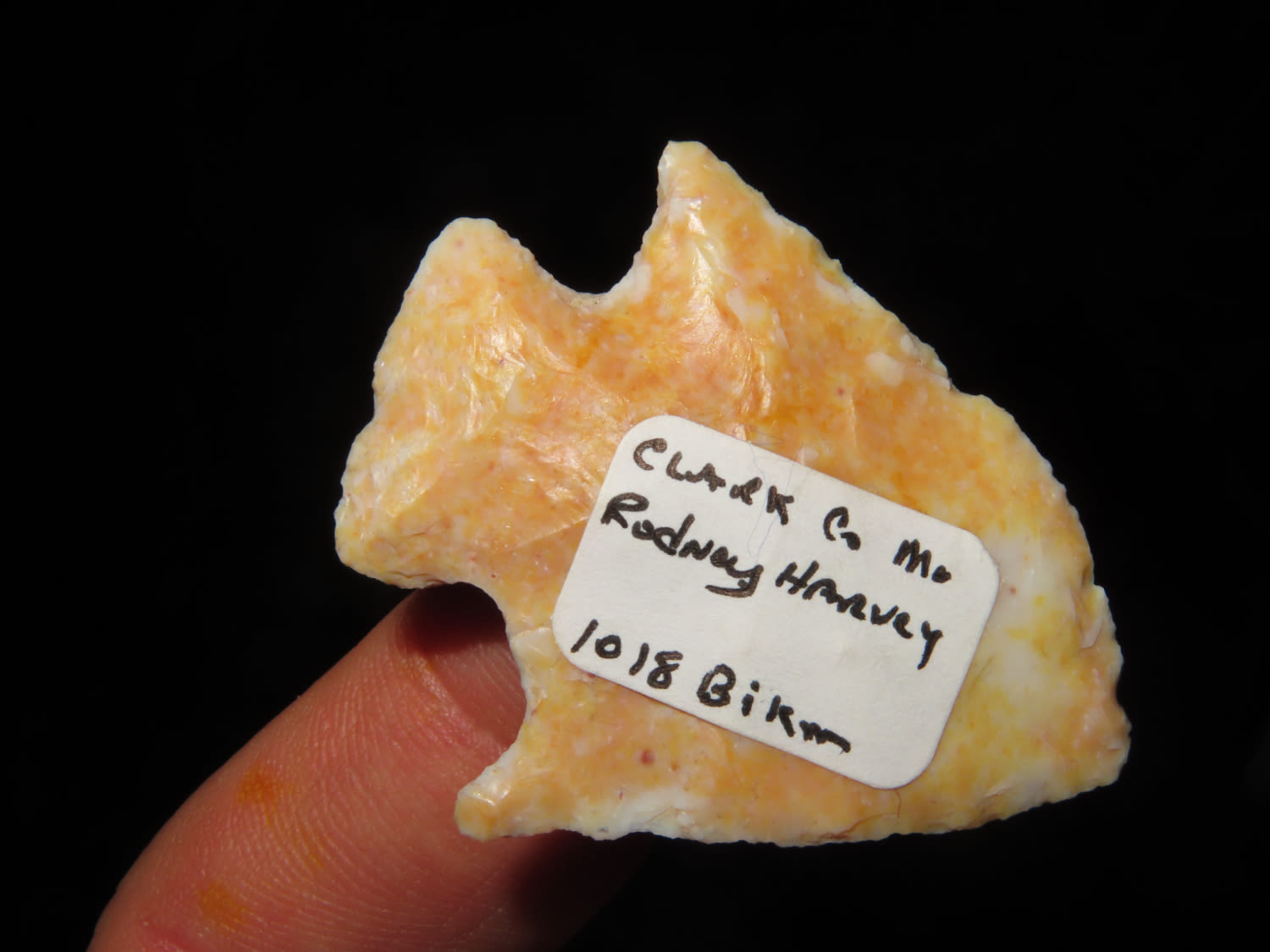 1.5/8″ Creek Found Woodland Point, Found by Rodney Harvey, Clark Co MO, Ex Dennis DeRosear. Ex Jake Vahle Coll. These are points out of Jake’s smalls frame which he found intriguing over the years.