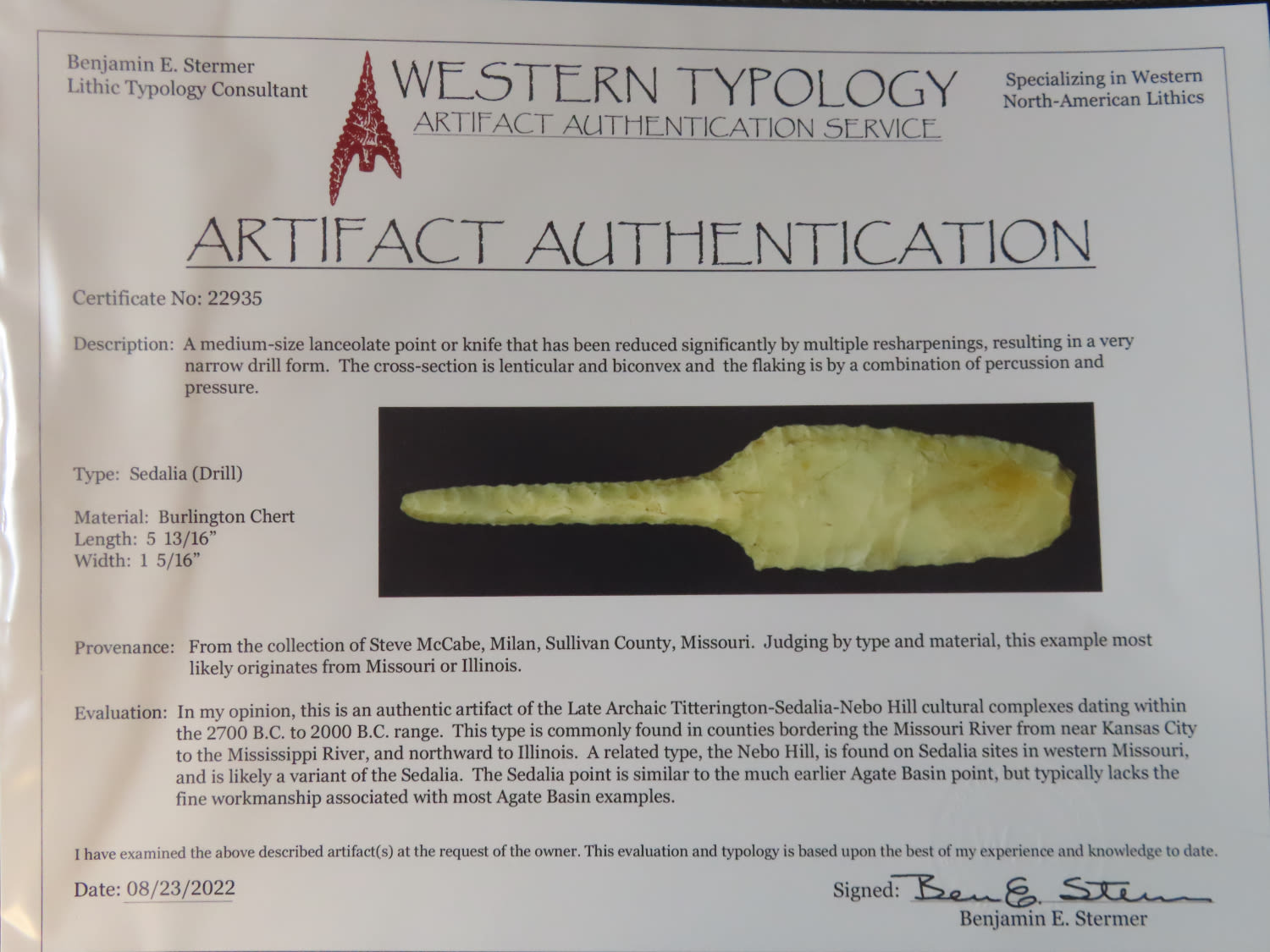 5 13/16″ Sedalia Drill, Stermer COA, Ex Steve McCabe, Sullivan Co., Missouri