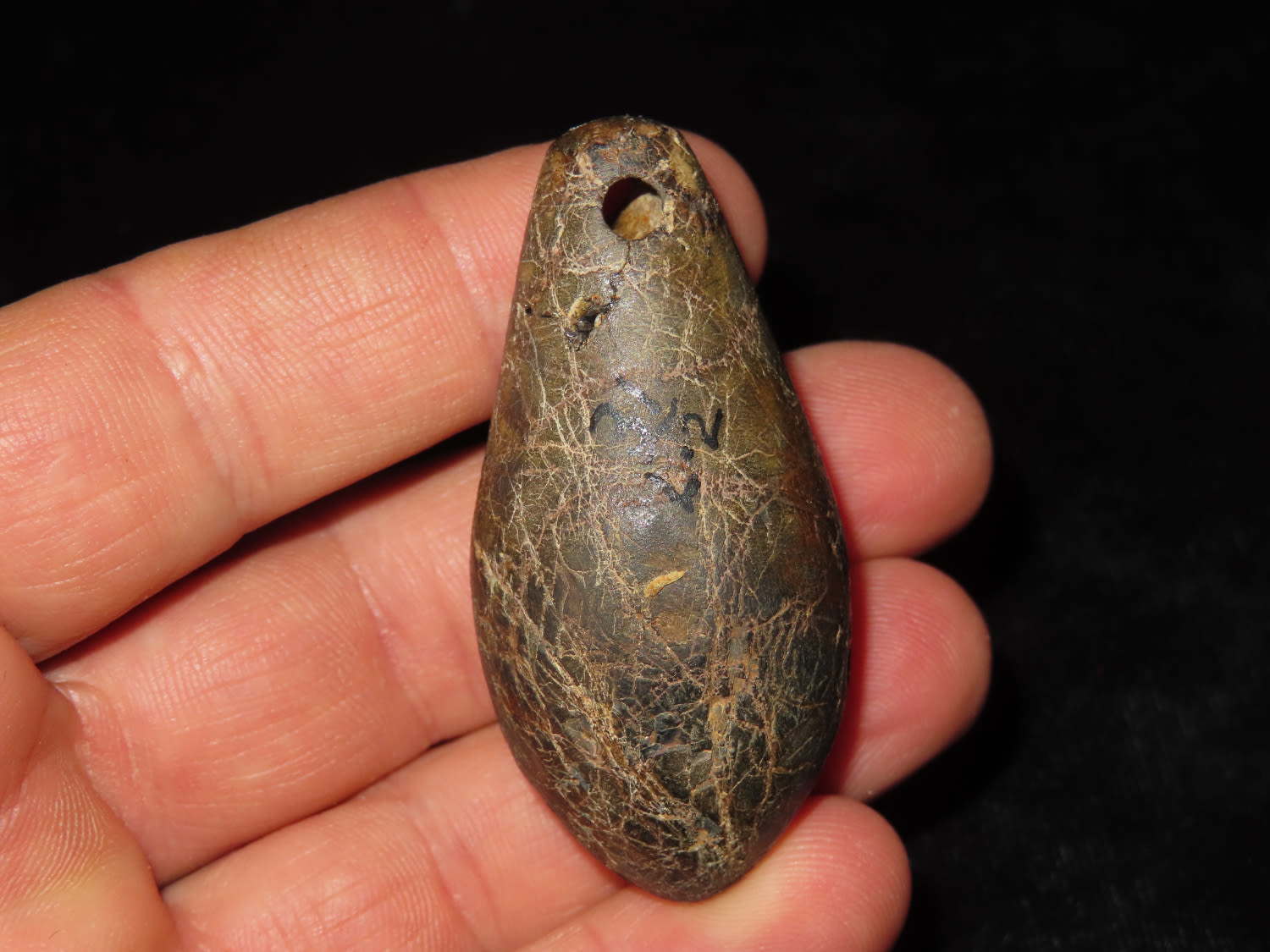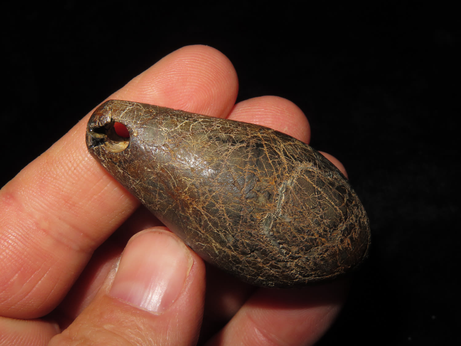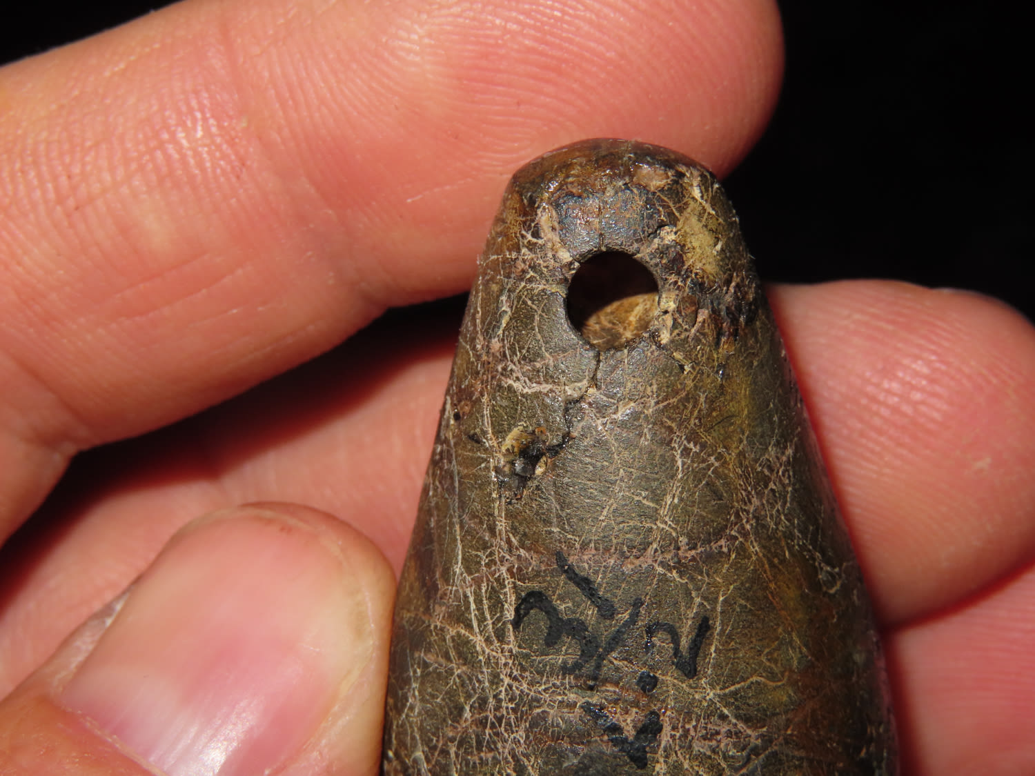 2.1/4″ Hematite Plummet, Missouri, Ex Rick Koening, Ex Jake Vahle. Broken and Glued near the hole.