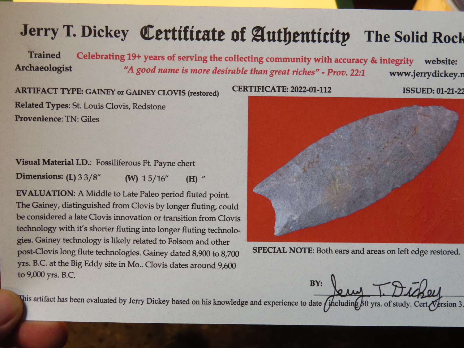 3 3/8″ Gainey or Gainey Clovis, Dickey COA, found in Giles Co., Tennessee ***RESTORED***