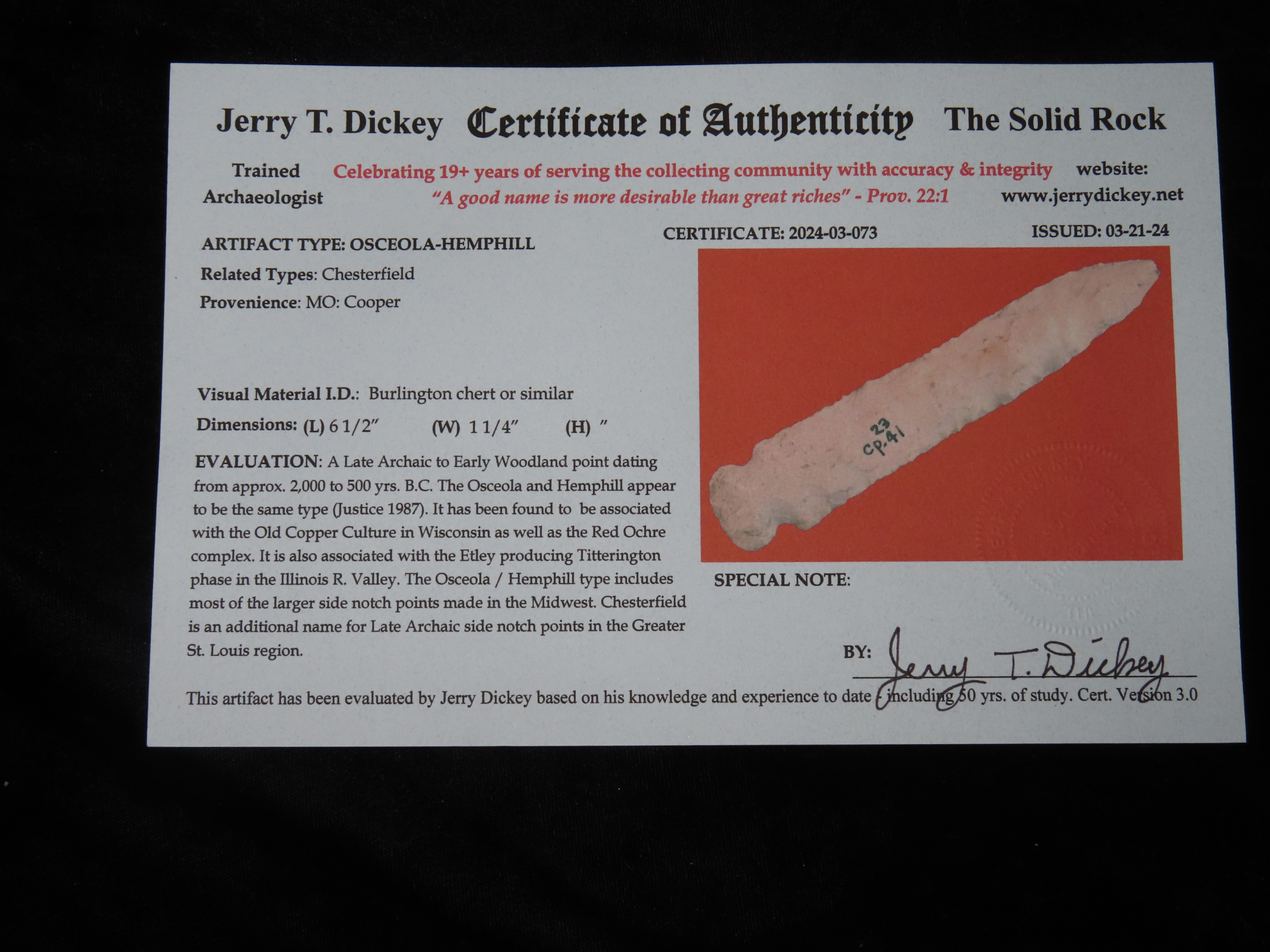 6 1/2″ Osceola-Hemphill, Dickey COA, found in Cooper Co., Missouri
