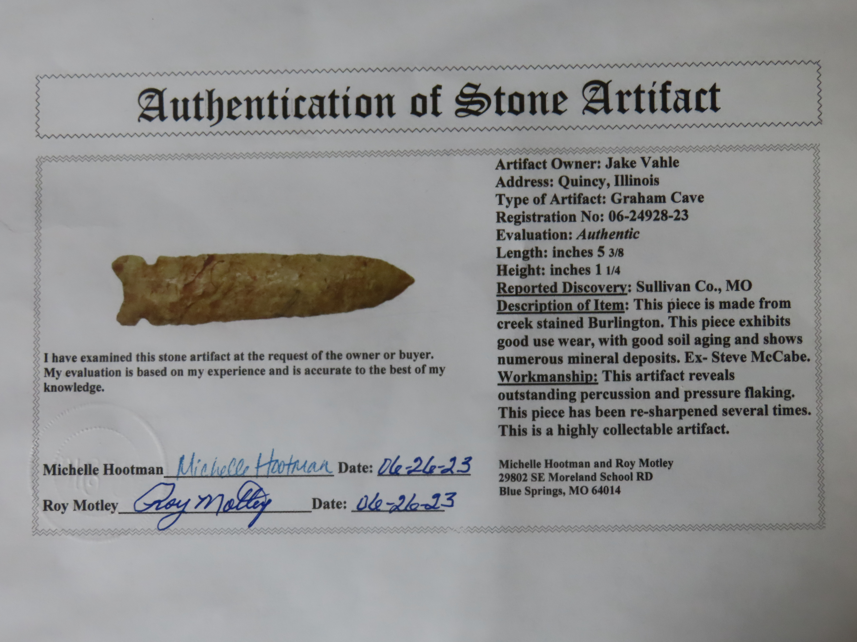 5 3/8″ Graham Cave, Motley COA, Ex Steve McCabe, Sullivan Co., Missouri