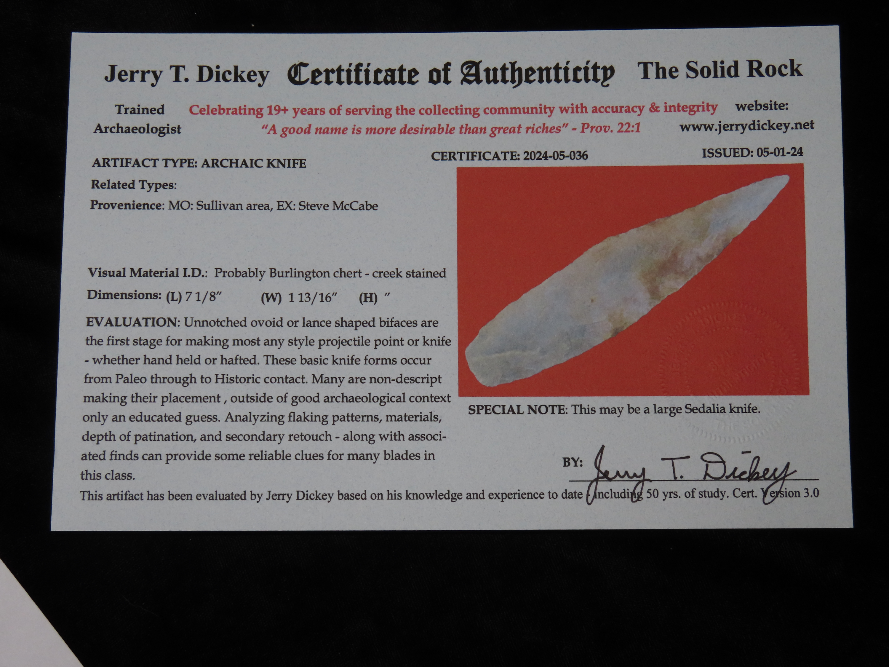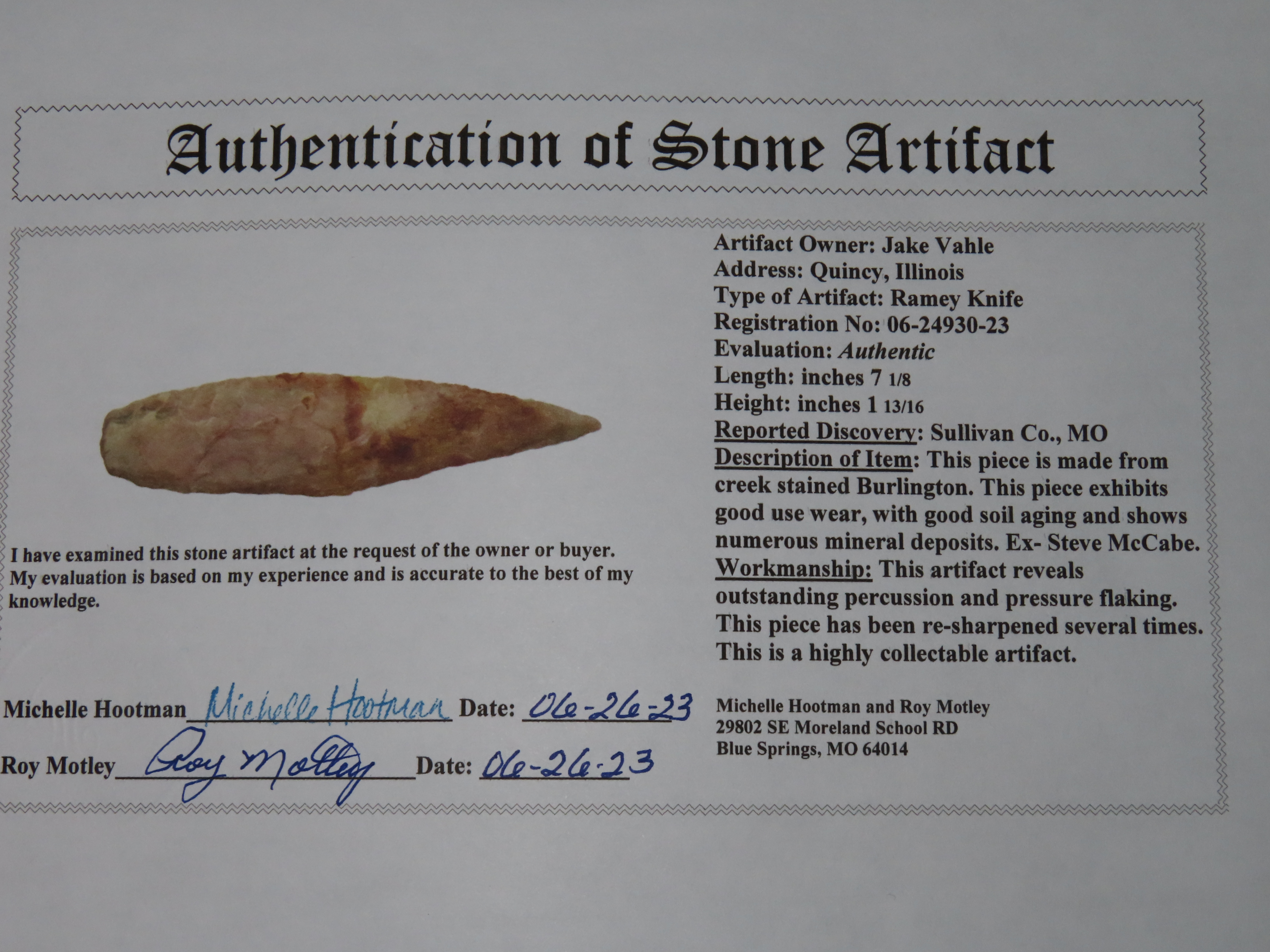 7 1/8″ Archaic Knife/Ramey Knife, 2x COA- Dickey/Motley, Ex Steve McCabe, Sullivan Co., Missouri