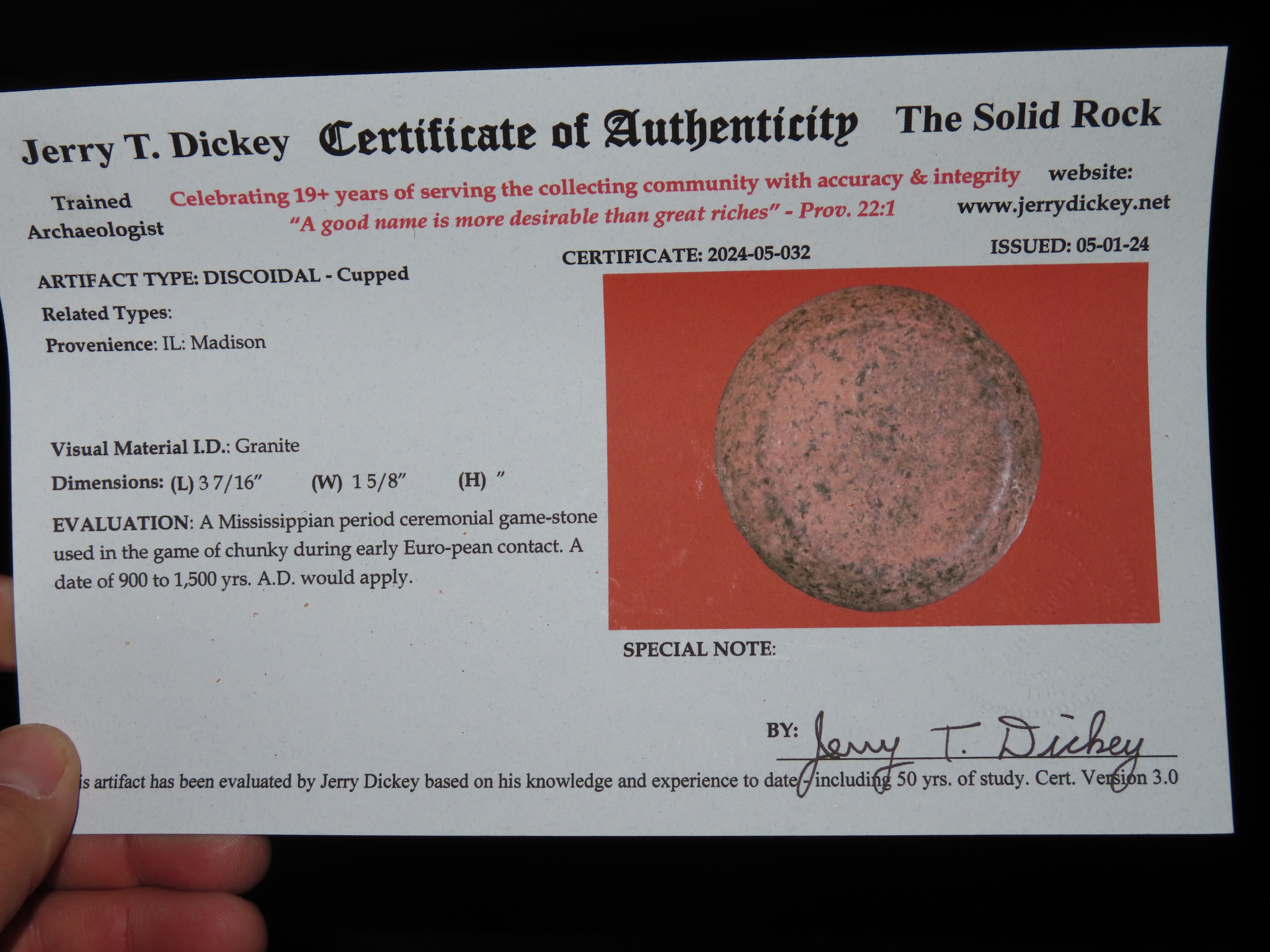 3 7/16″ Cupped Discoidal, Dickey COA, found in Madison Co., Illinois
