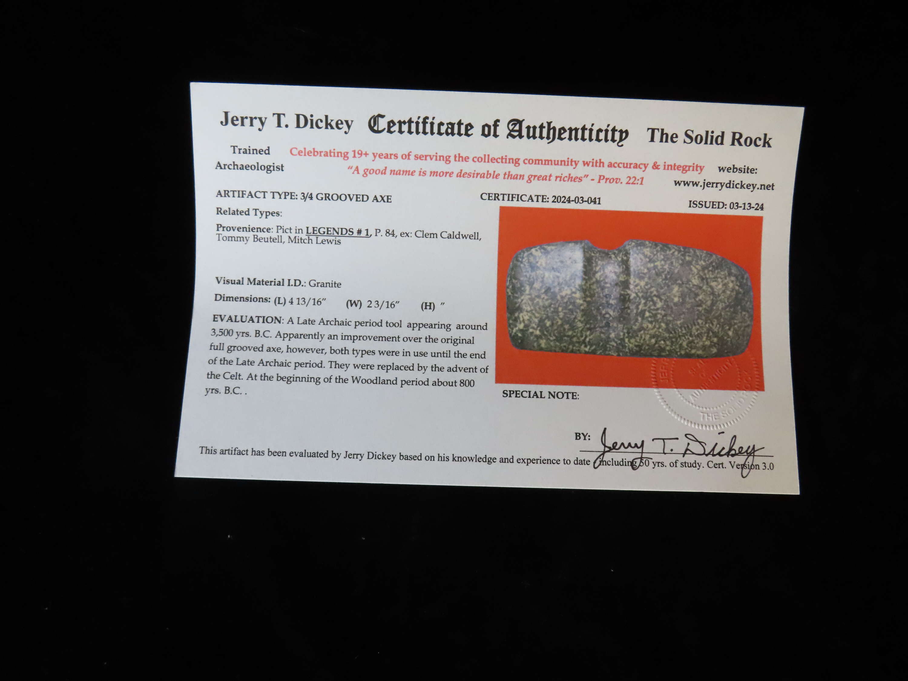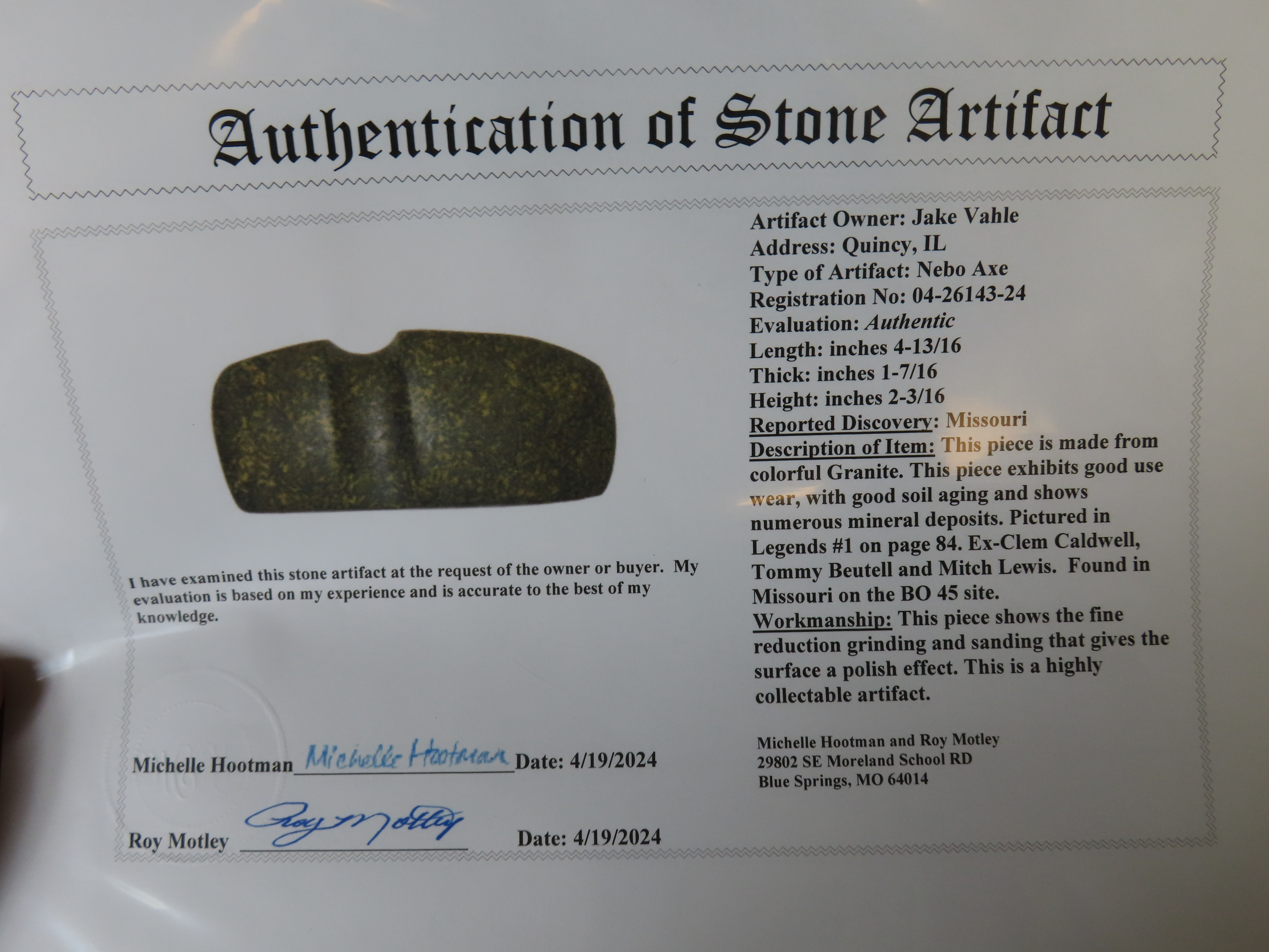 4 13/16″ 3/4 Groove Nebo Axe, 2xCOA-Dickey/Motley, found at the BO 45 Site, Missouri, Ex Clem Caldwell, Ex Tommy Beutell, Ex Mitch Lewis, Ex Jake Vahle- pictured in Legends #1, page 84(in background)