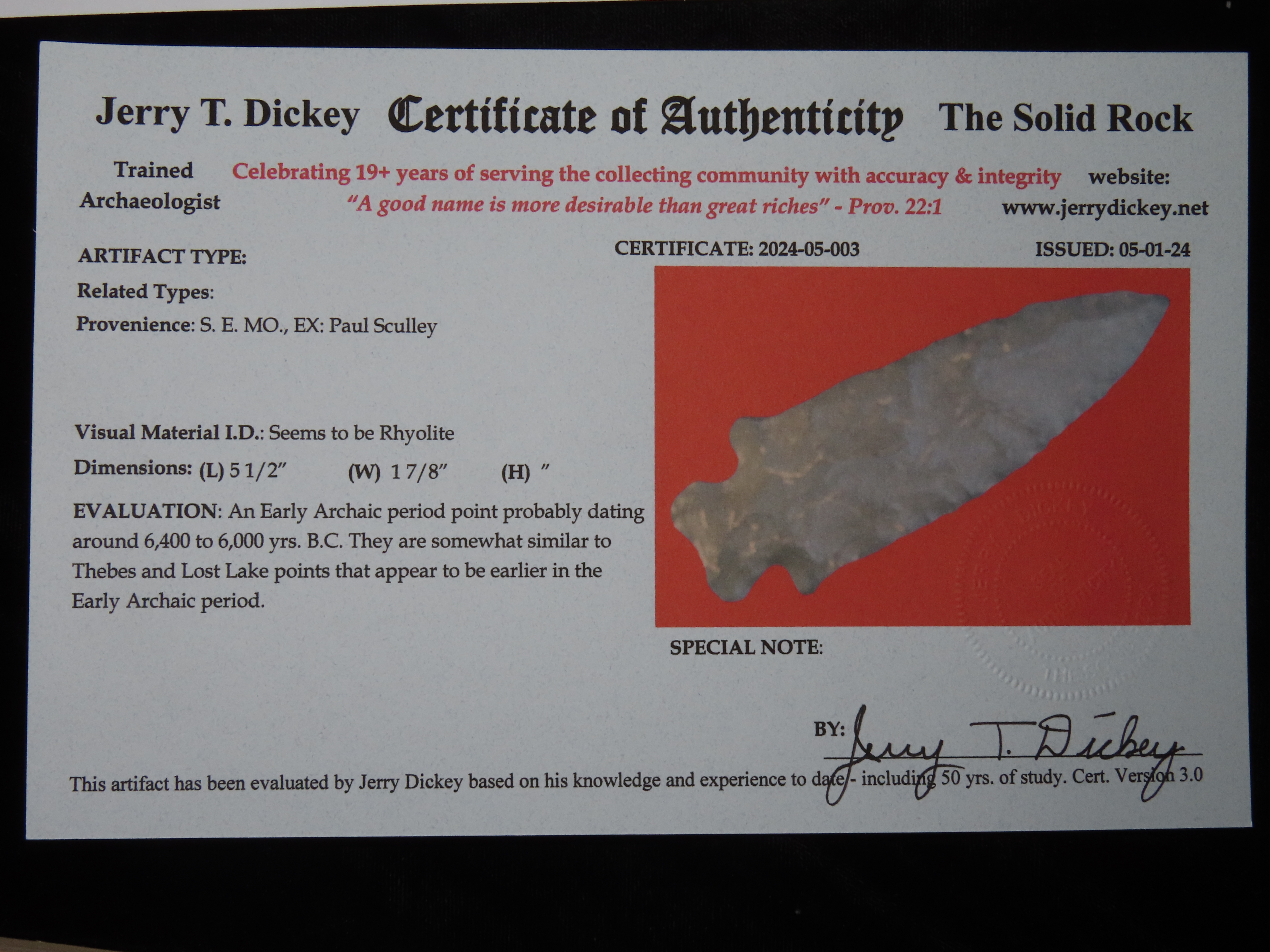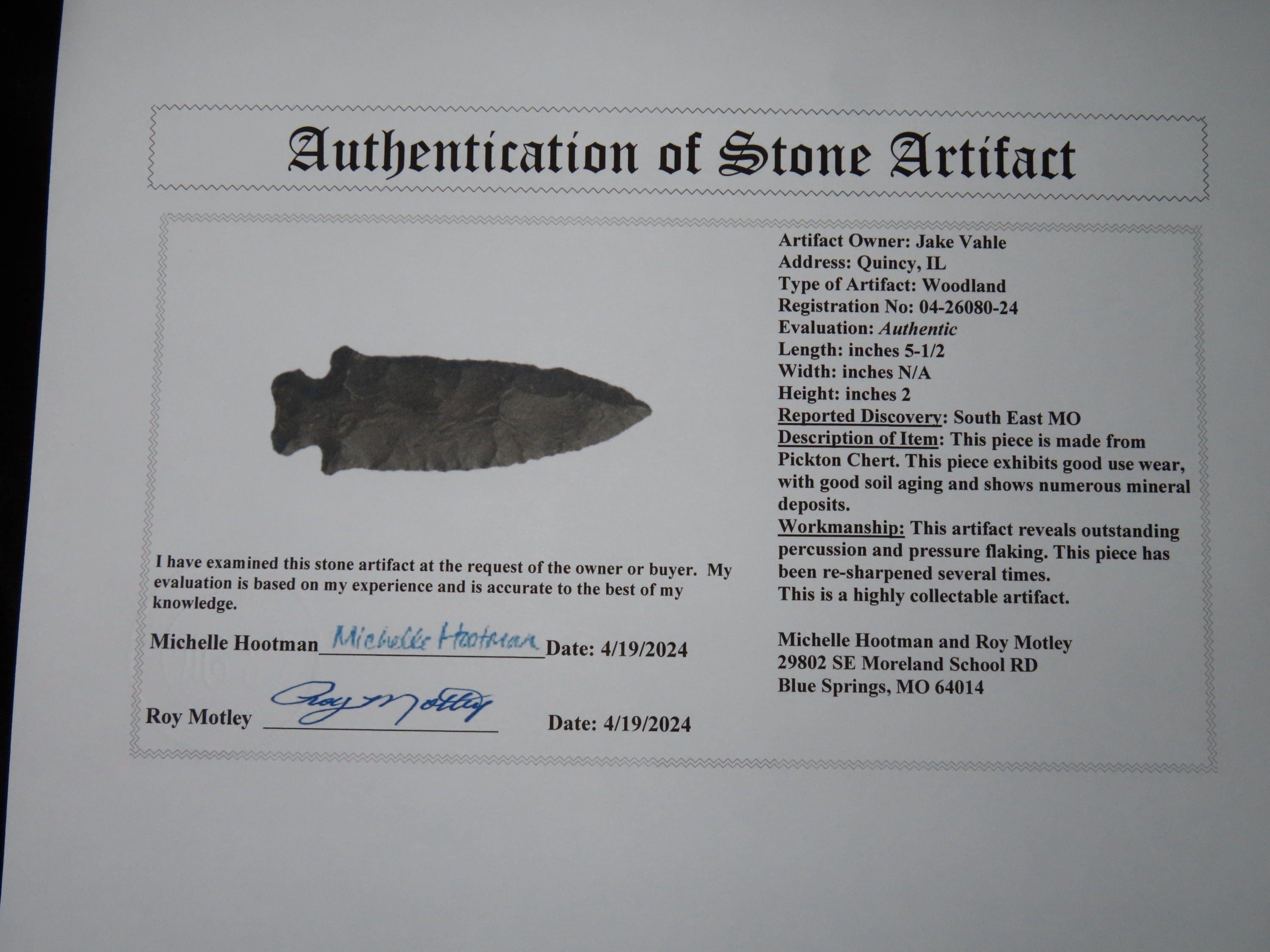 5 1/2″ Well Made Woodland Point, 2x COA- Dickey/Motley, found in Southeast Missouri, Ex Paul Sculley Collection, Ex Jake Vahle Collection