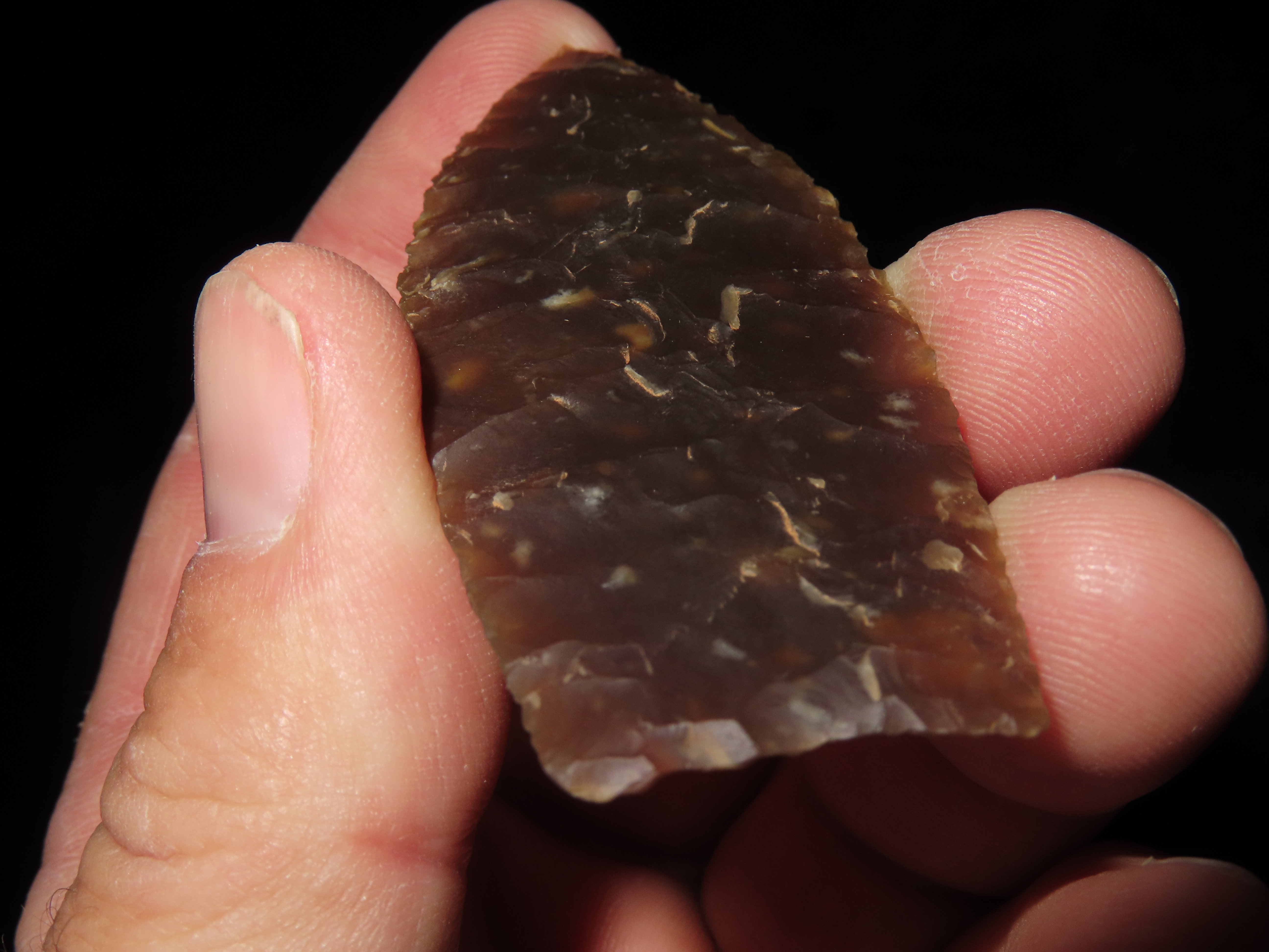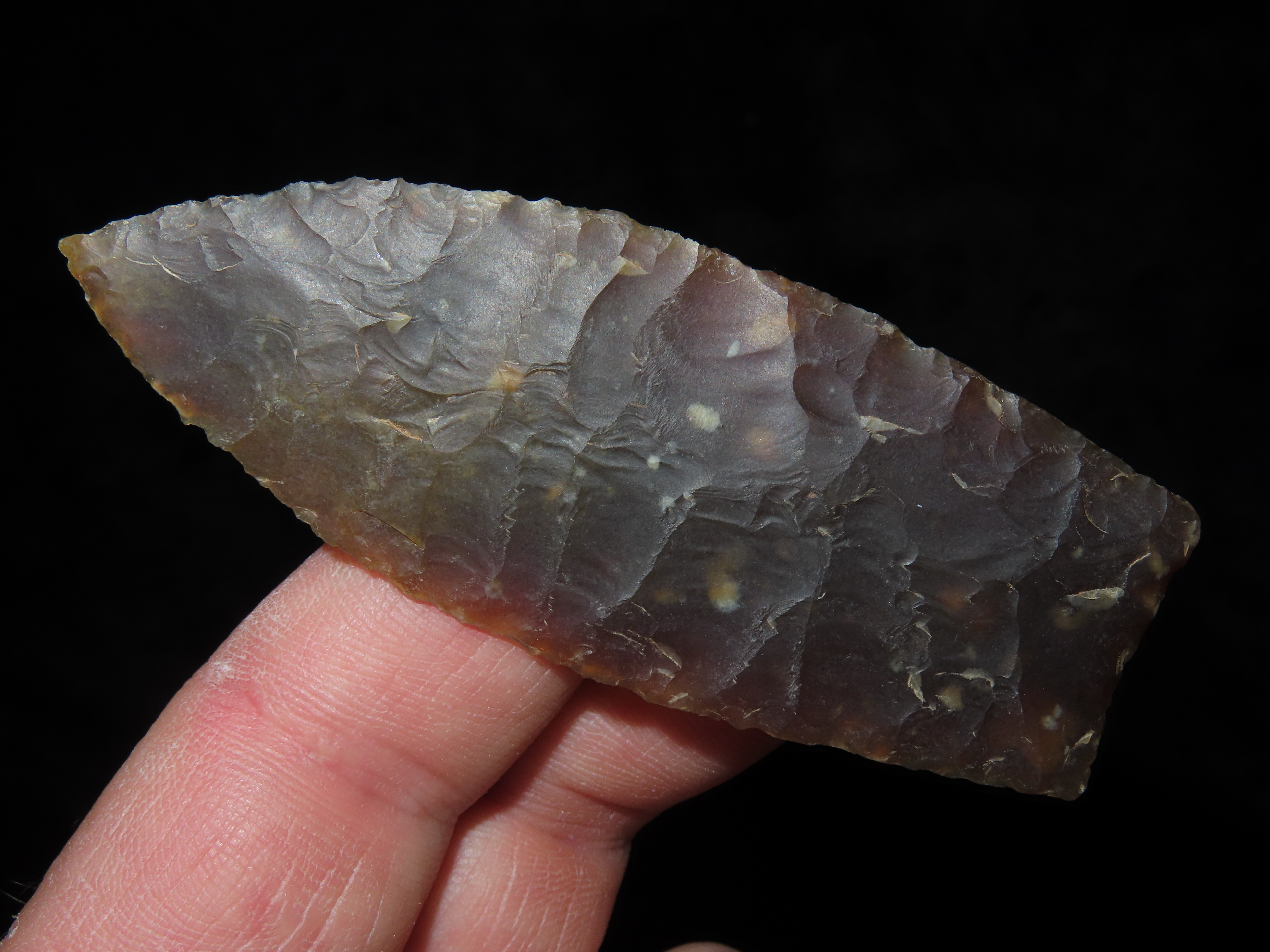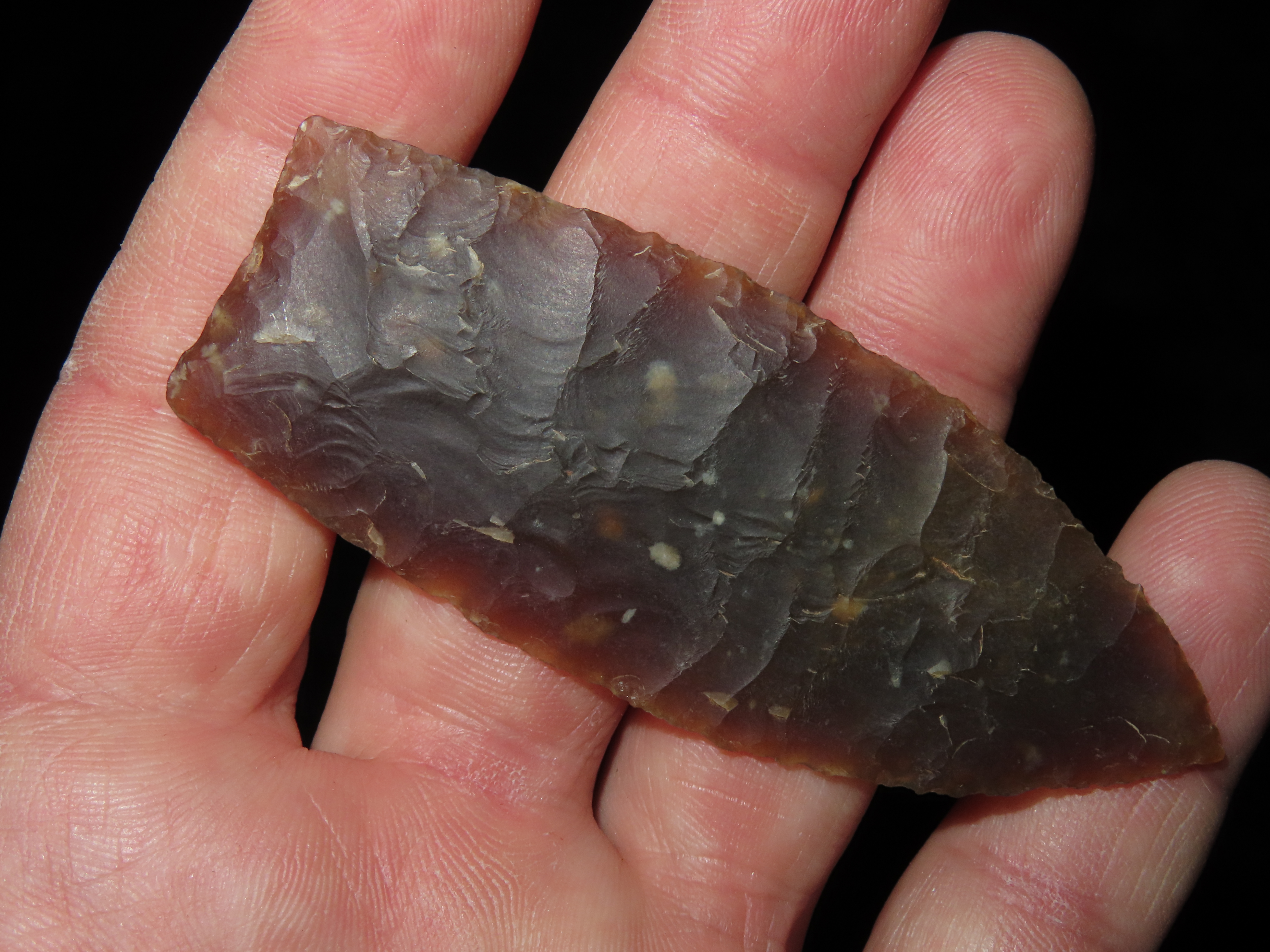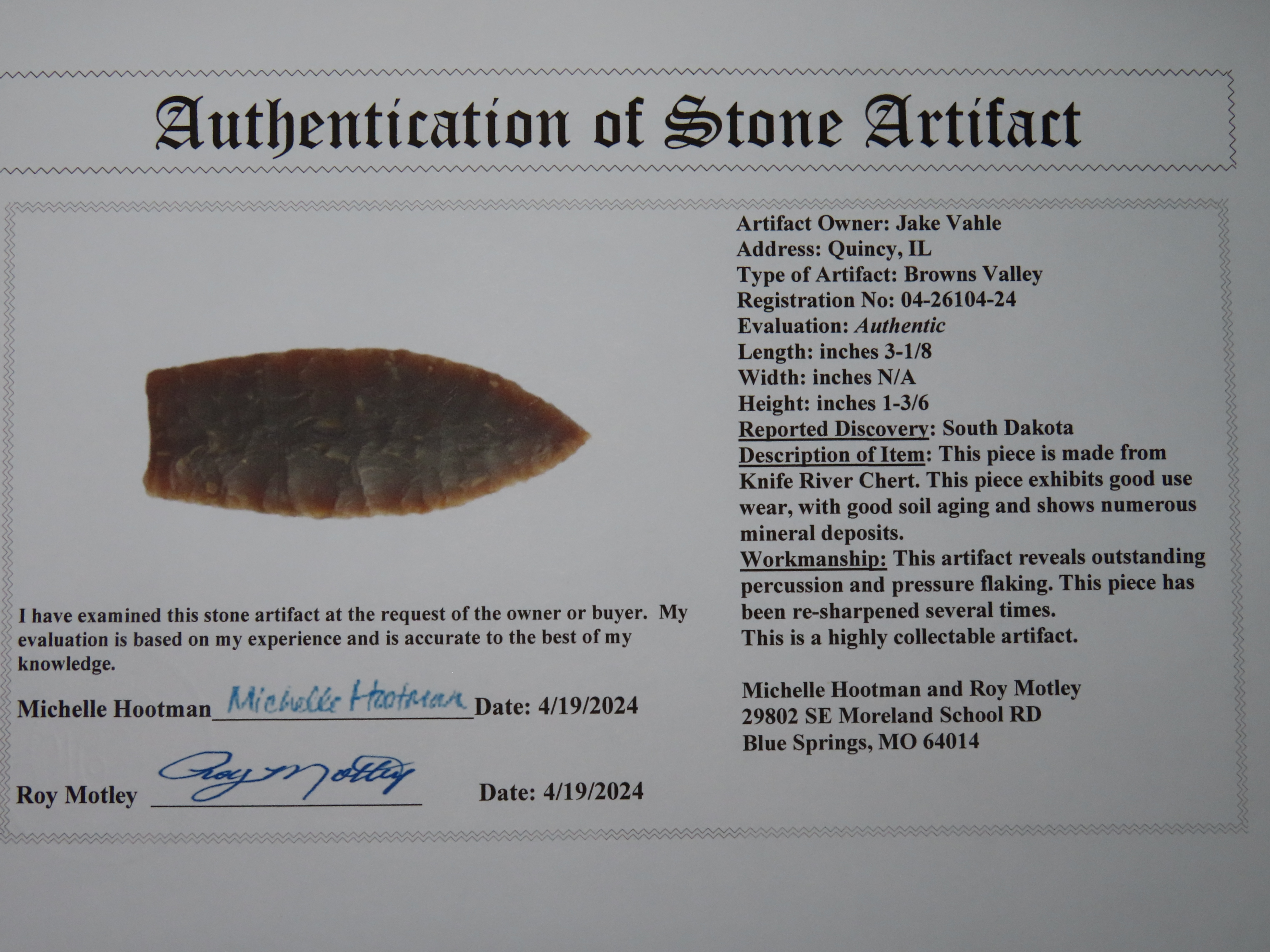 3 1/8″ Browns Valley, Motley COA, found in South Dakota, made of Knife River Chert, Ex Jake Vahle Collection