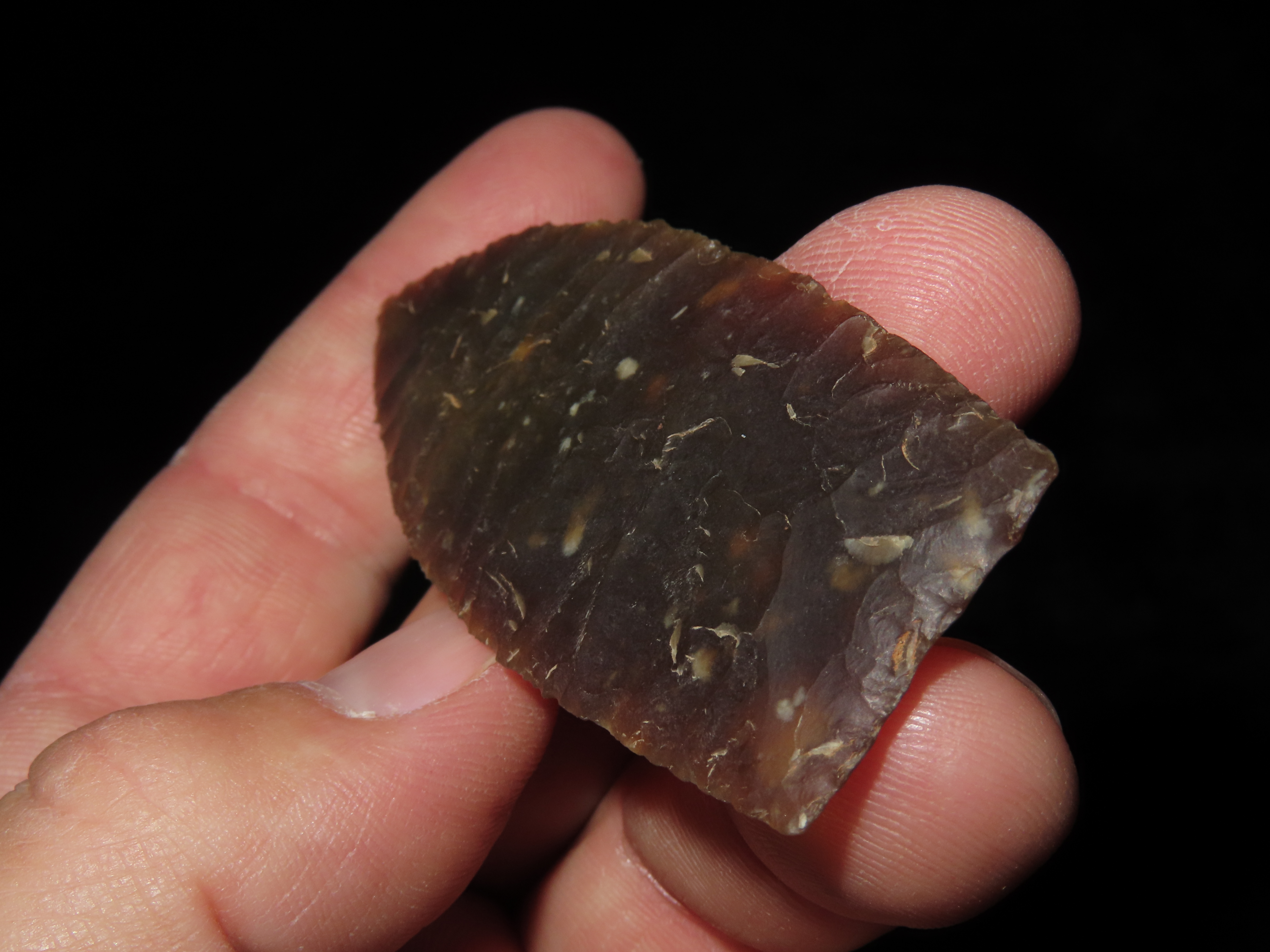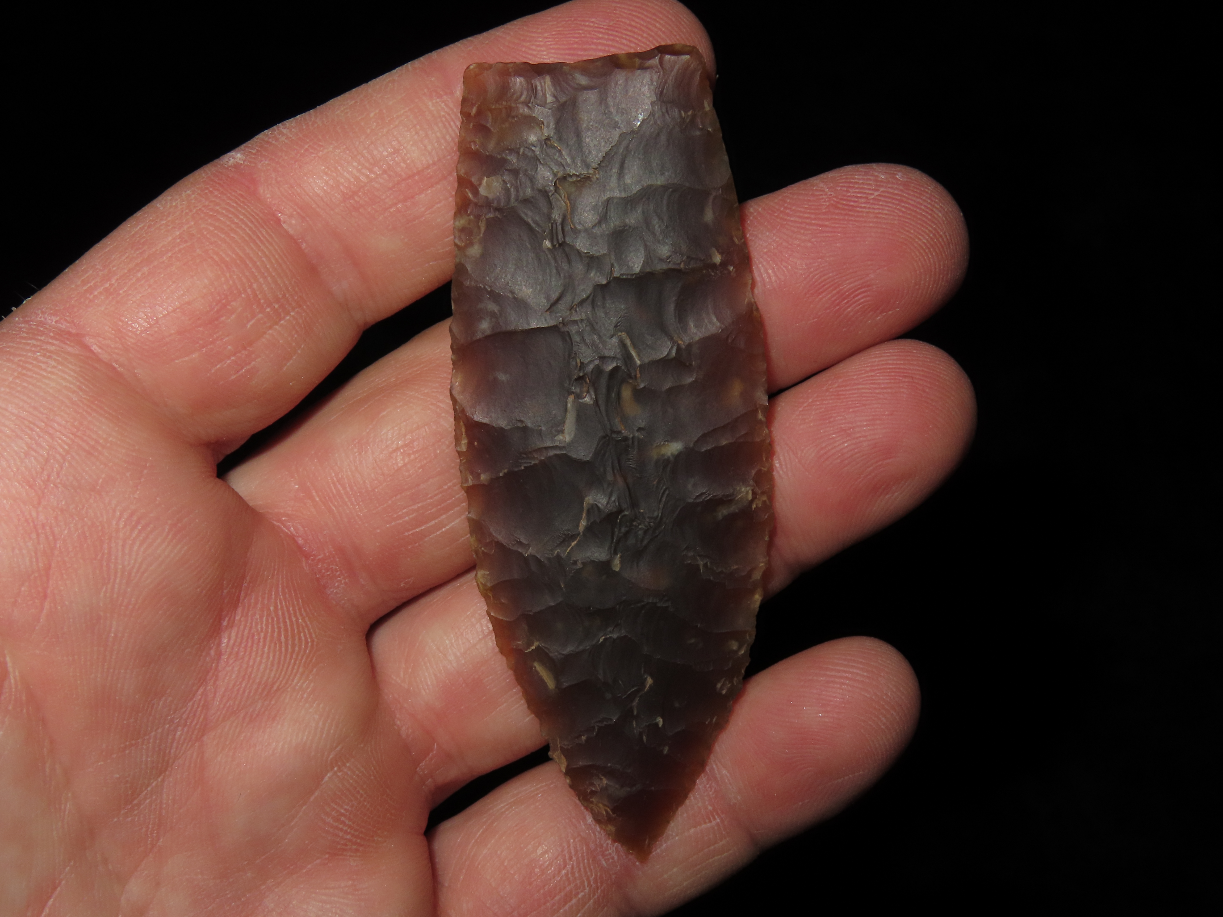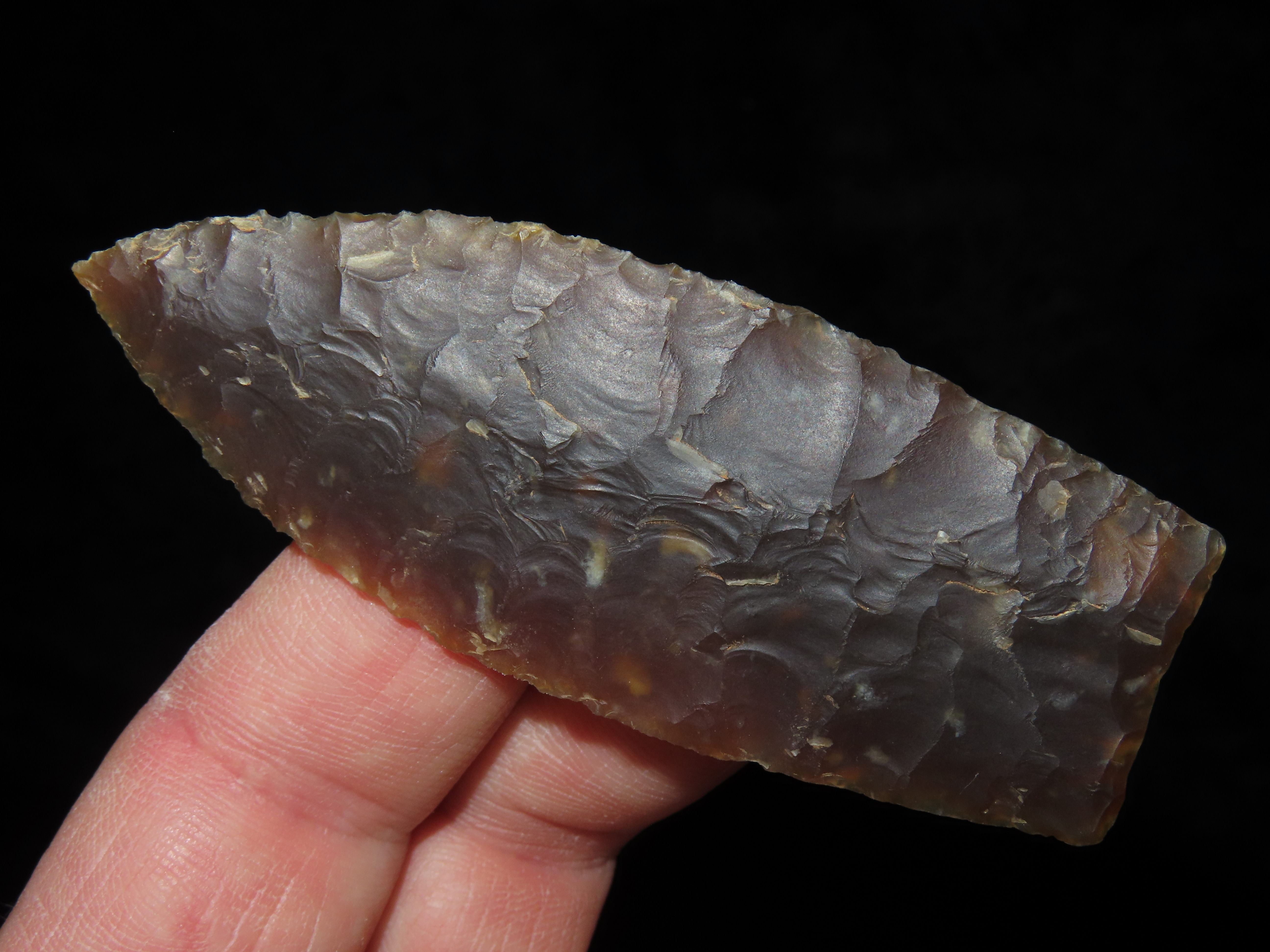 3 1/8″ Browns Valley, Motley COA, found in South Dakota, made of Knife River Chert, Ex Jake Vahle Collection