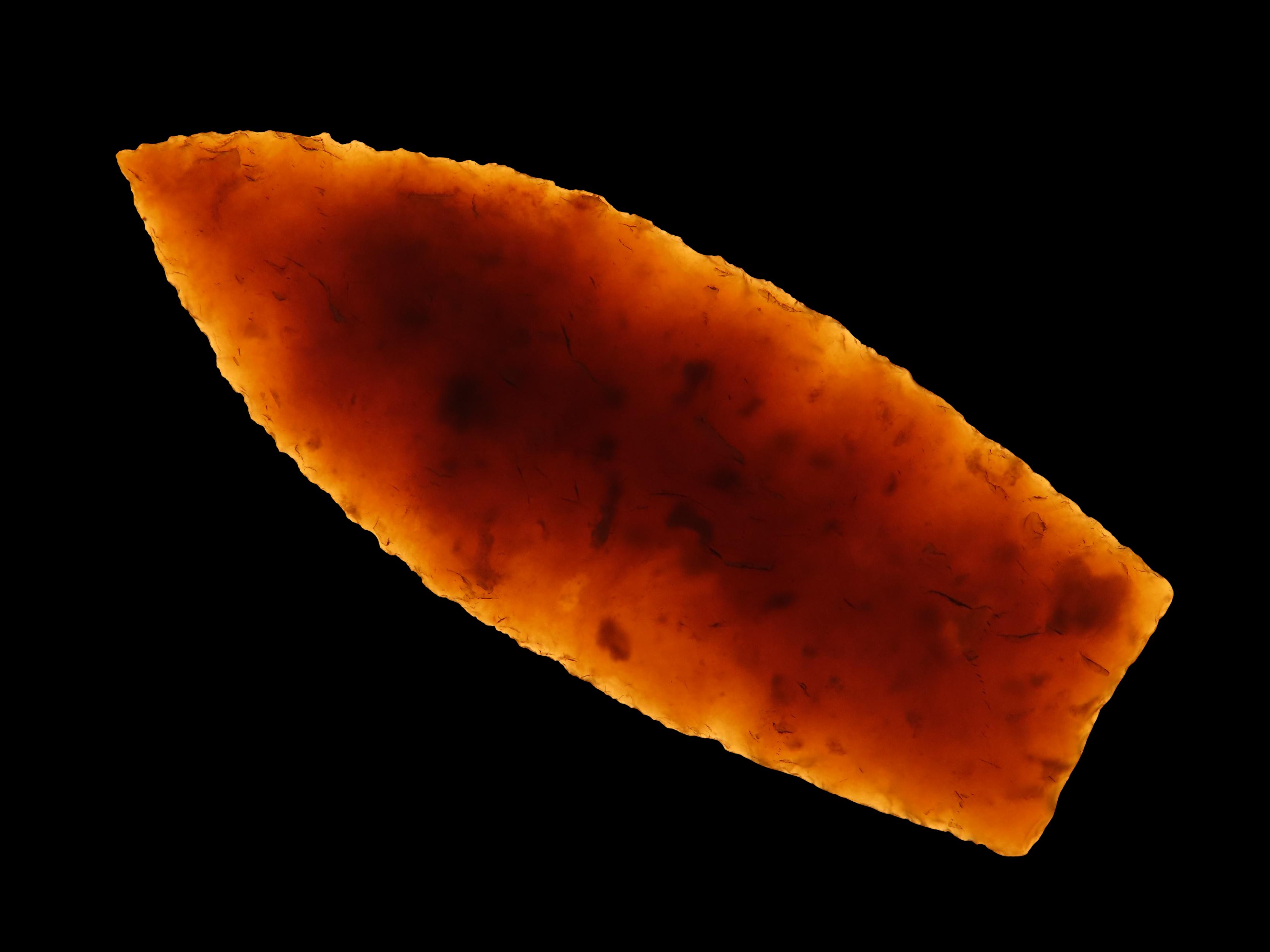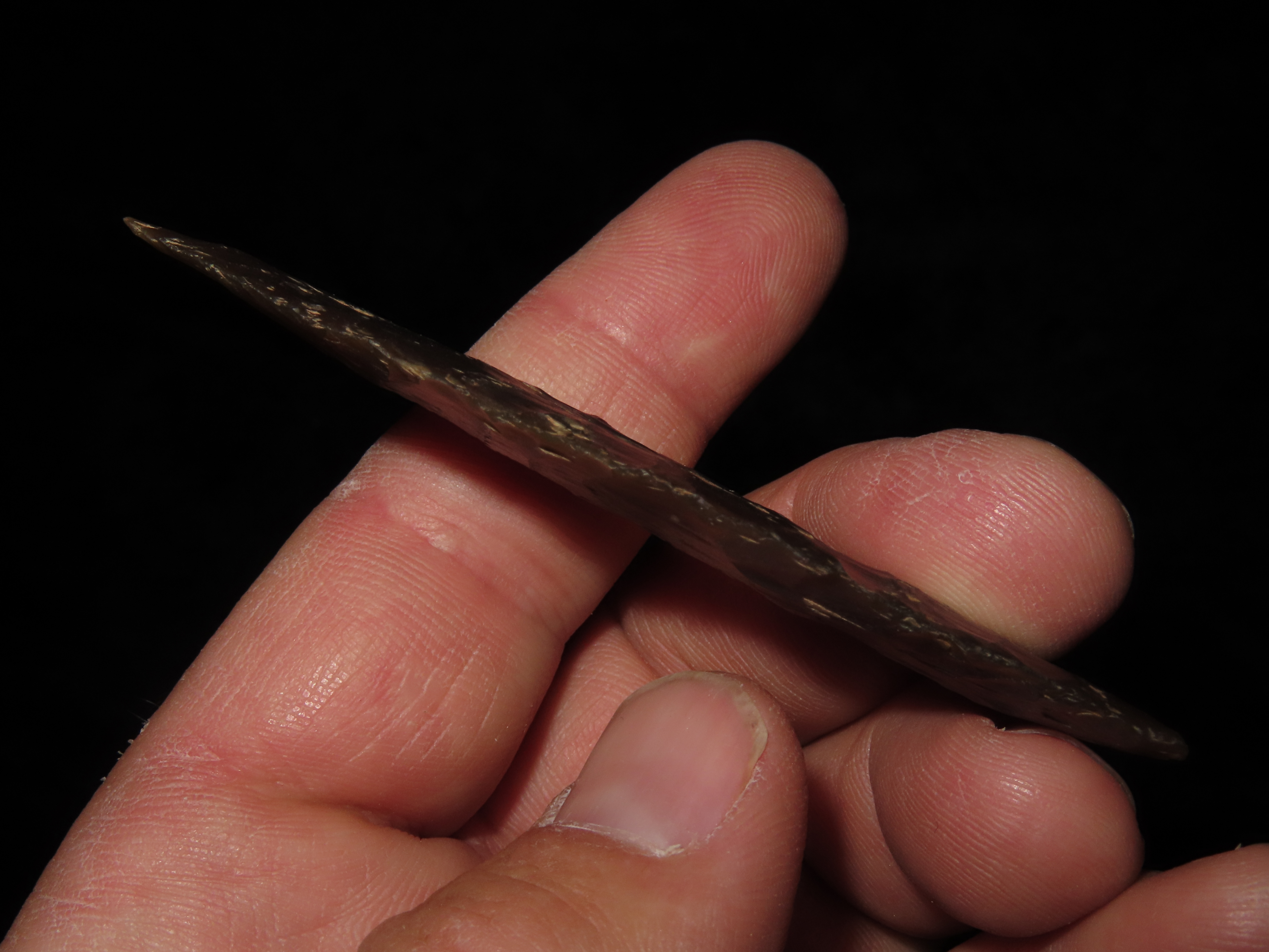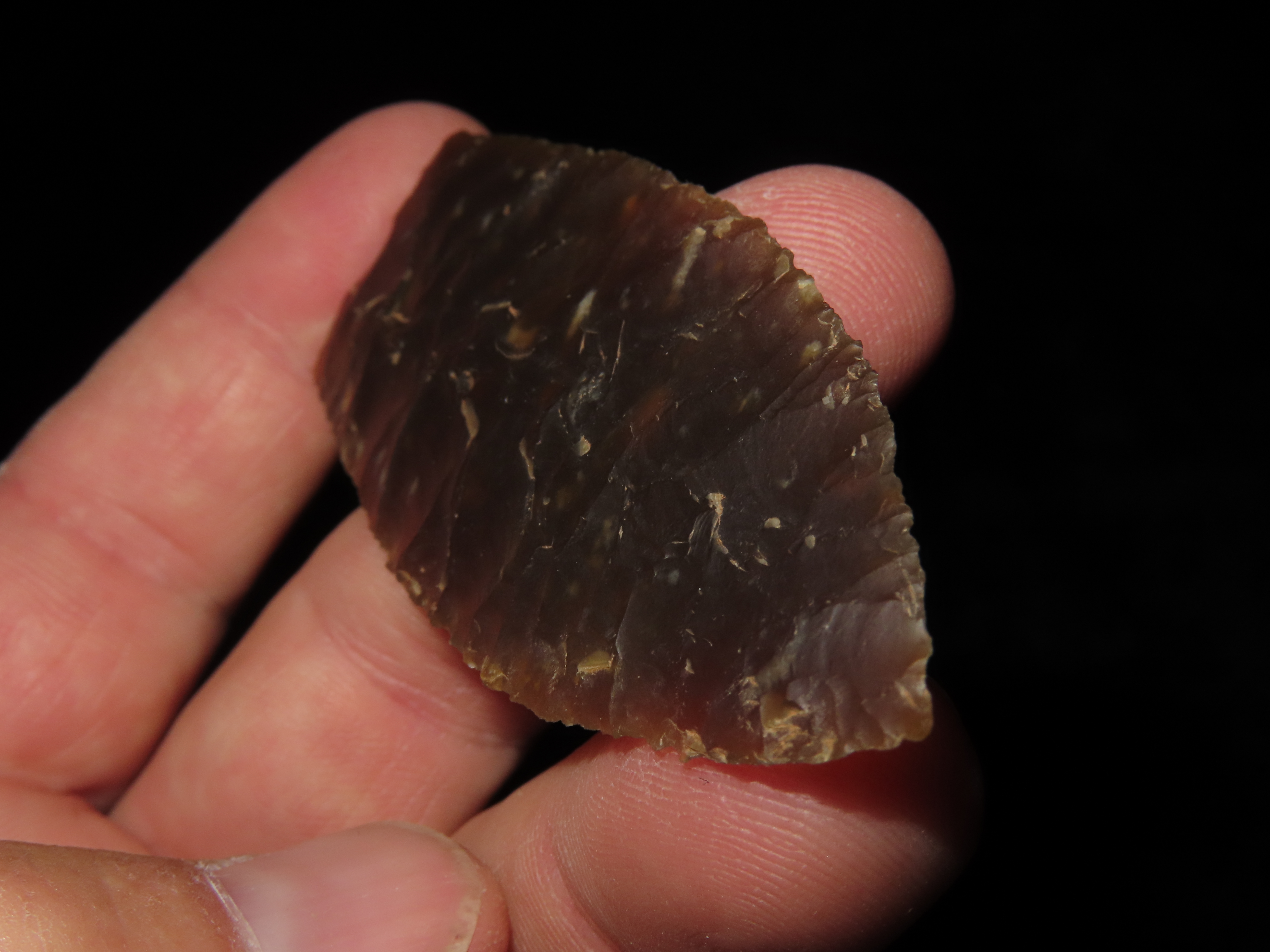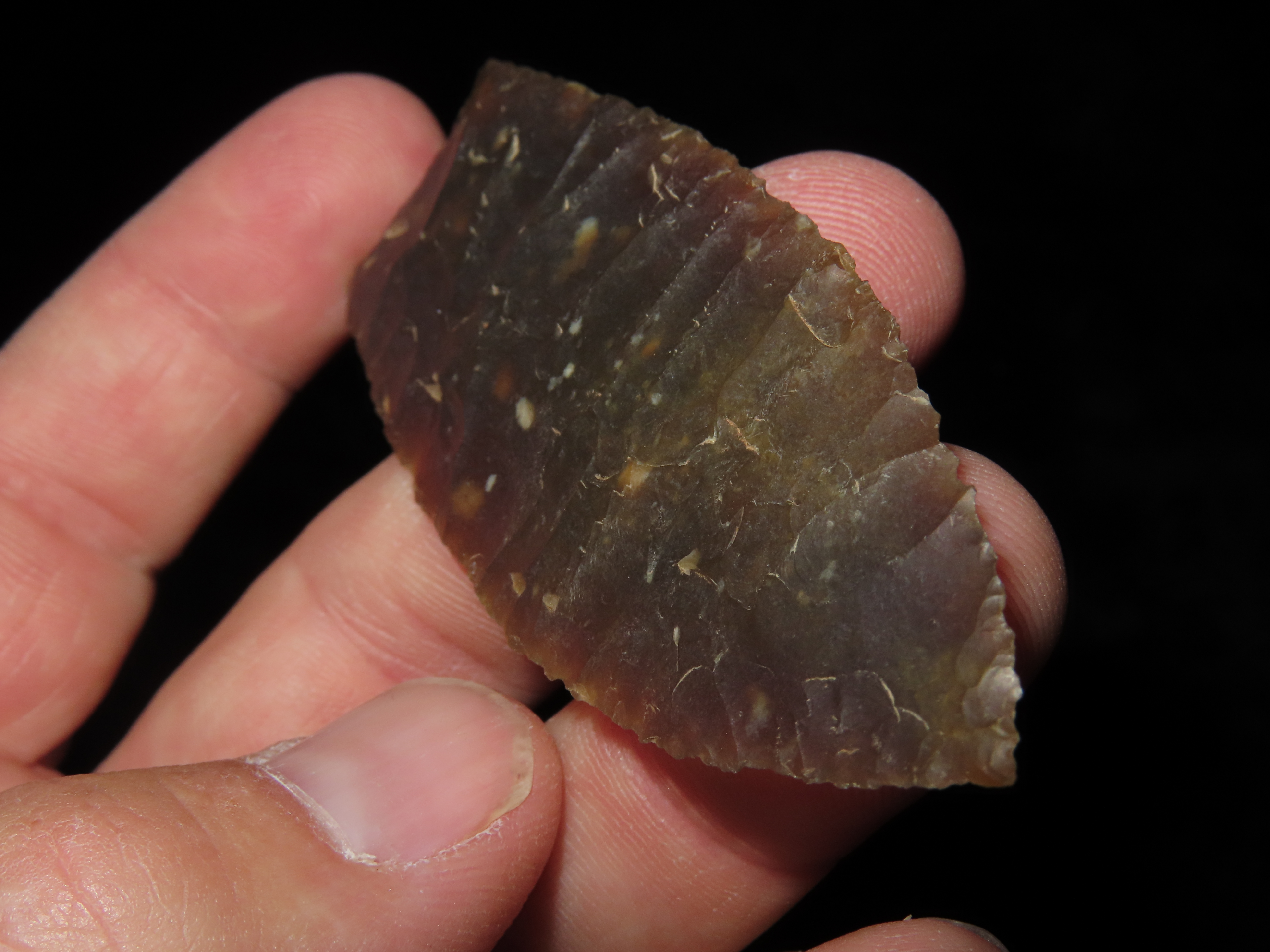 3 1/8″ Browns Valley, Motley COA, found in South Dakota, made of Knife River Chert, Ex Jake Vahle Collection
