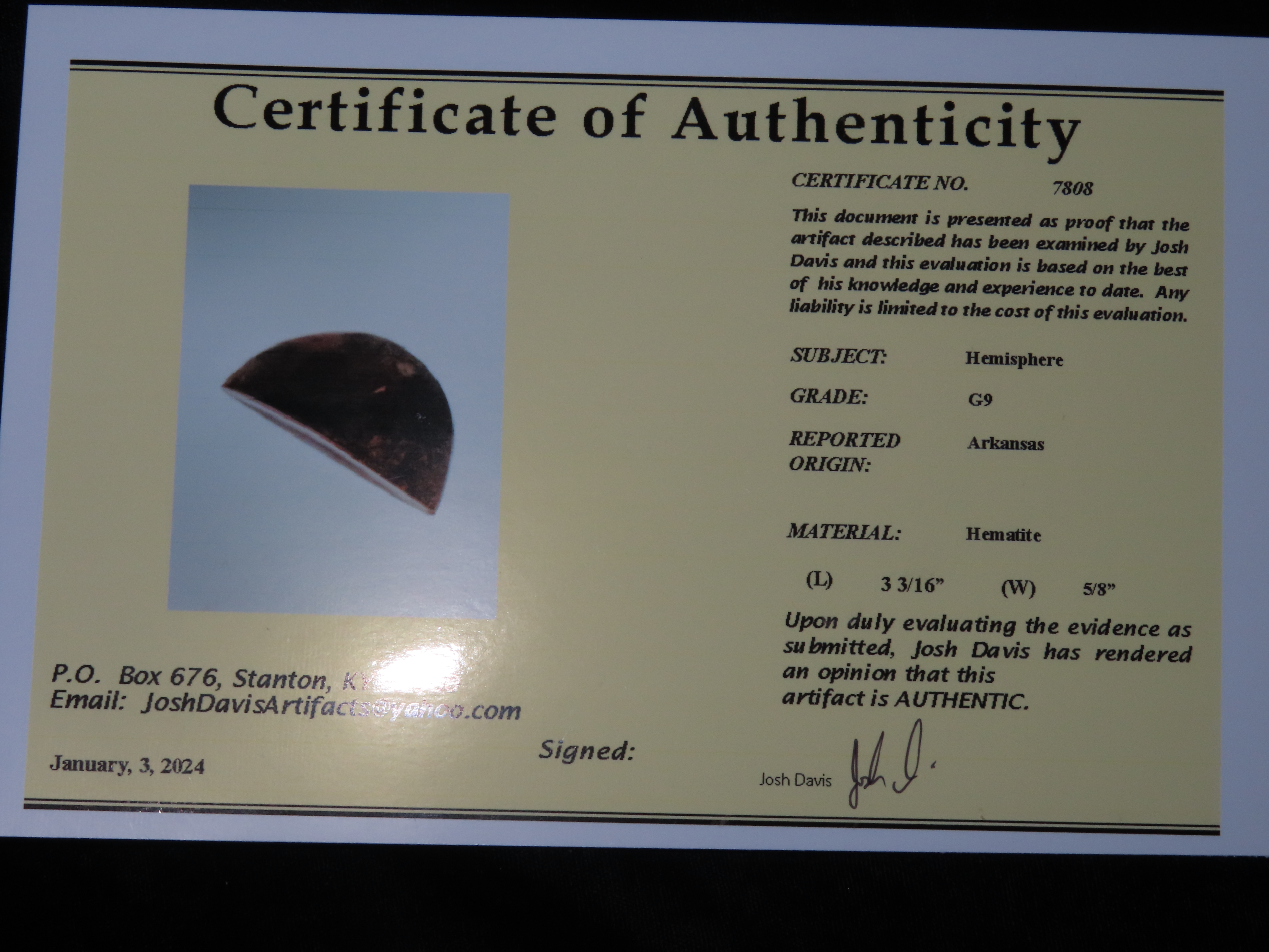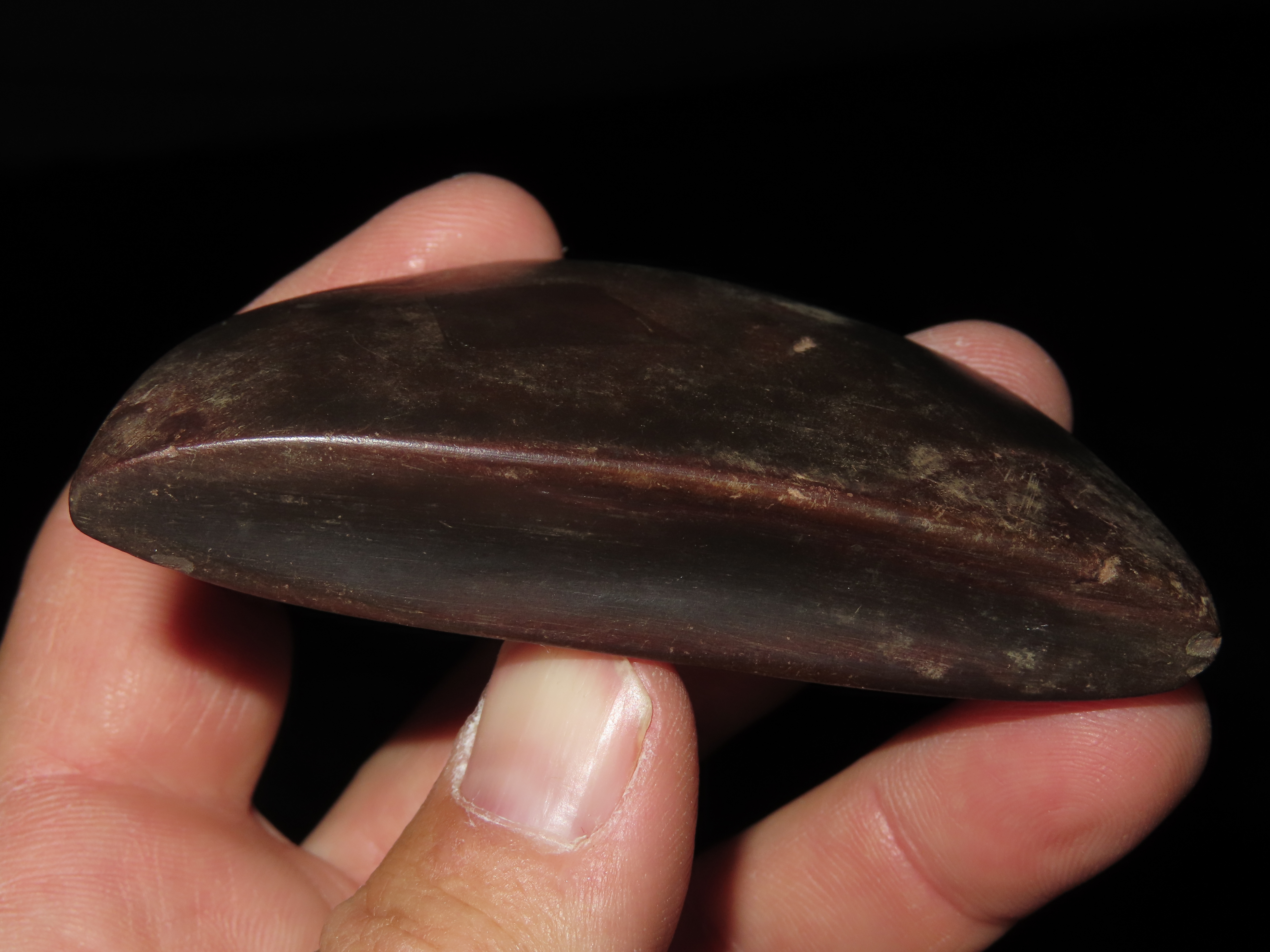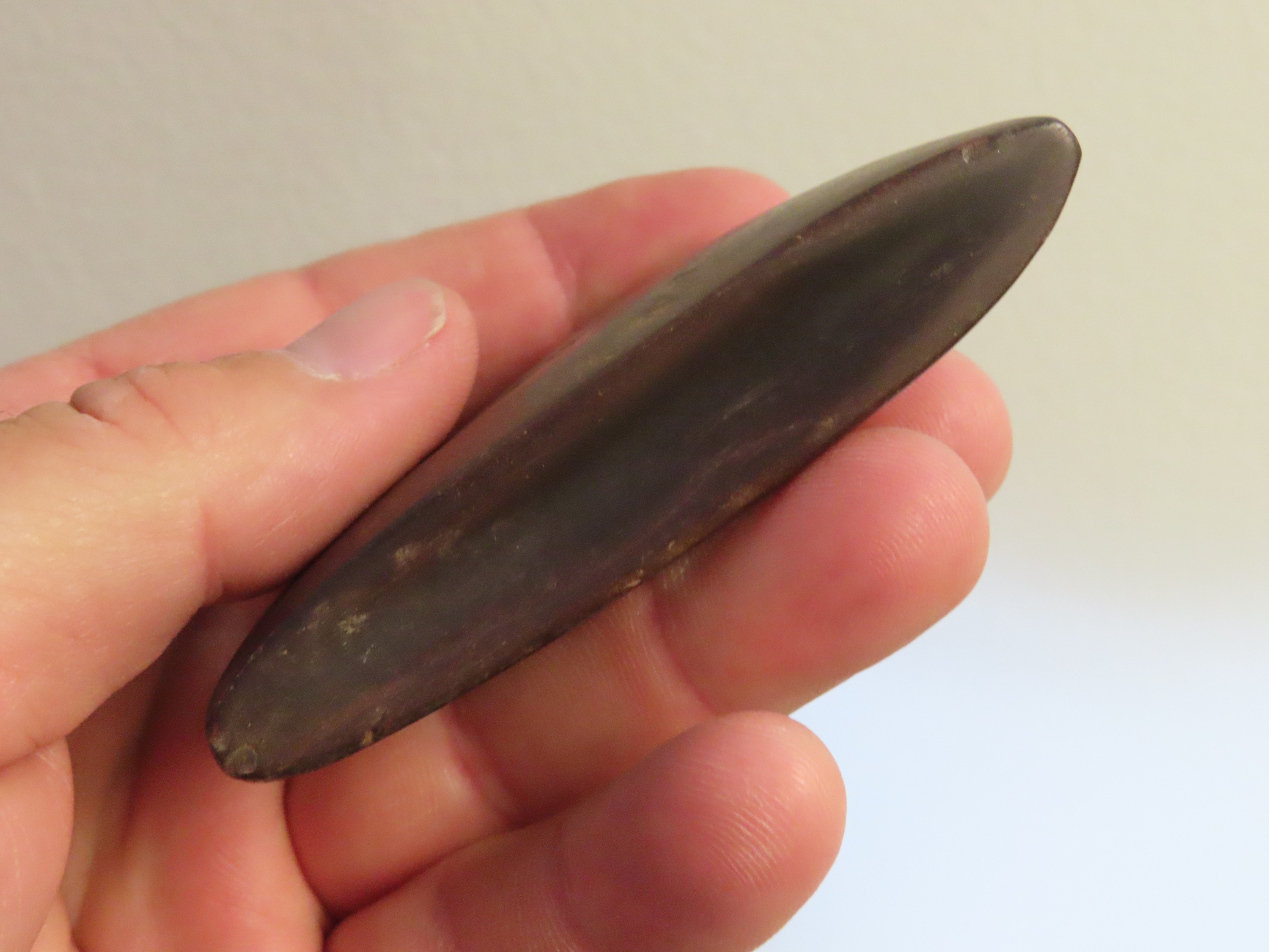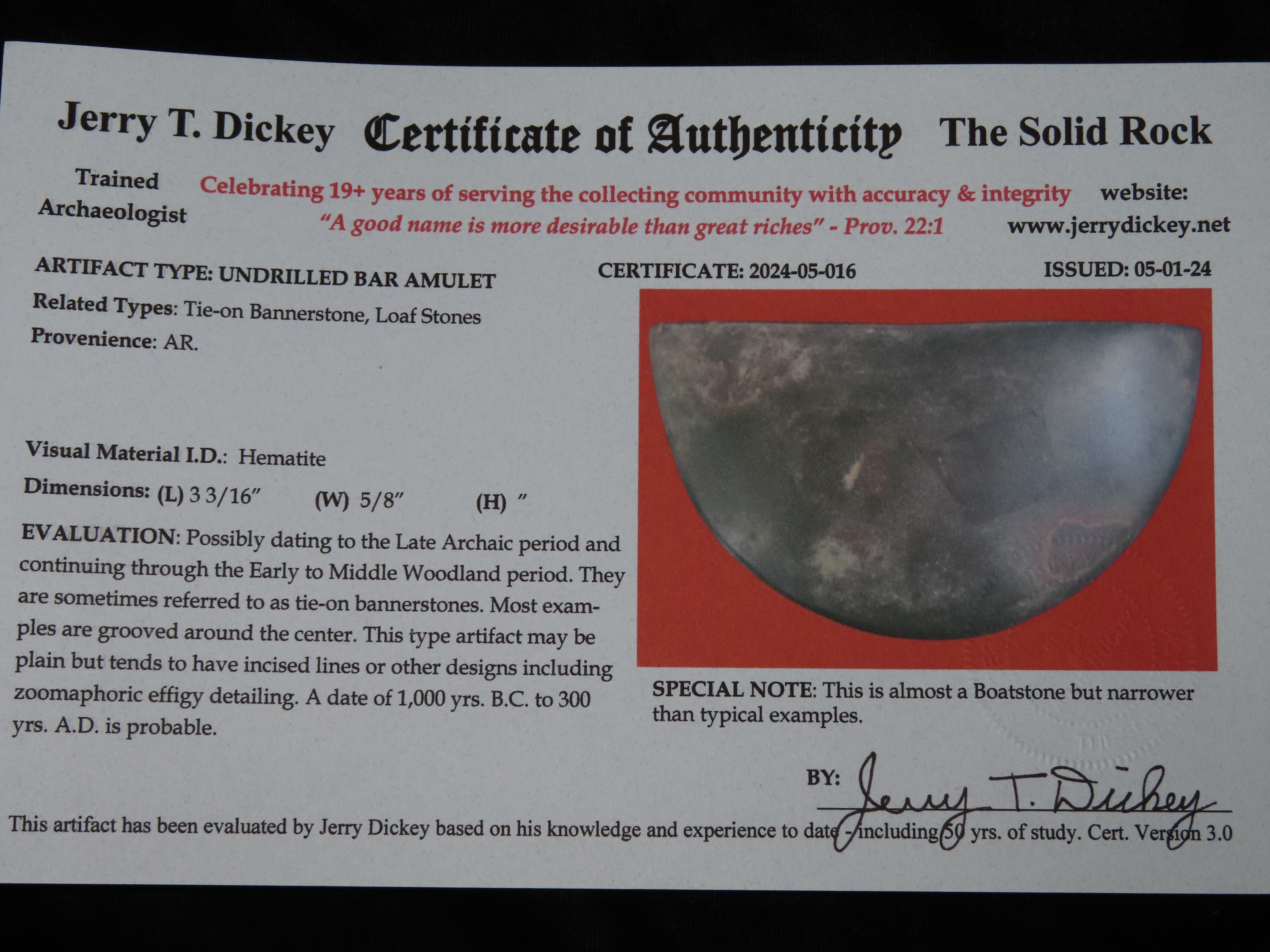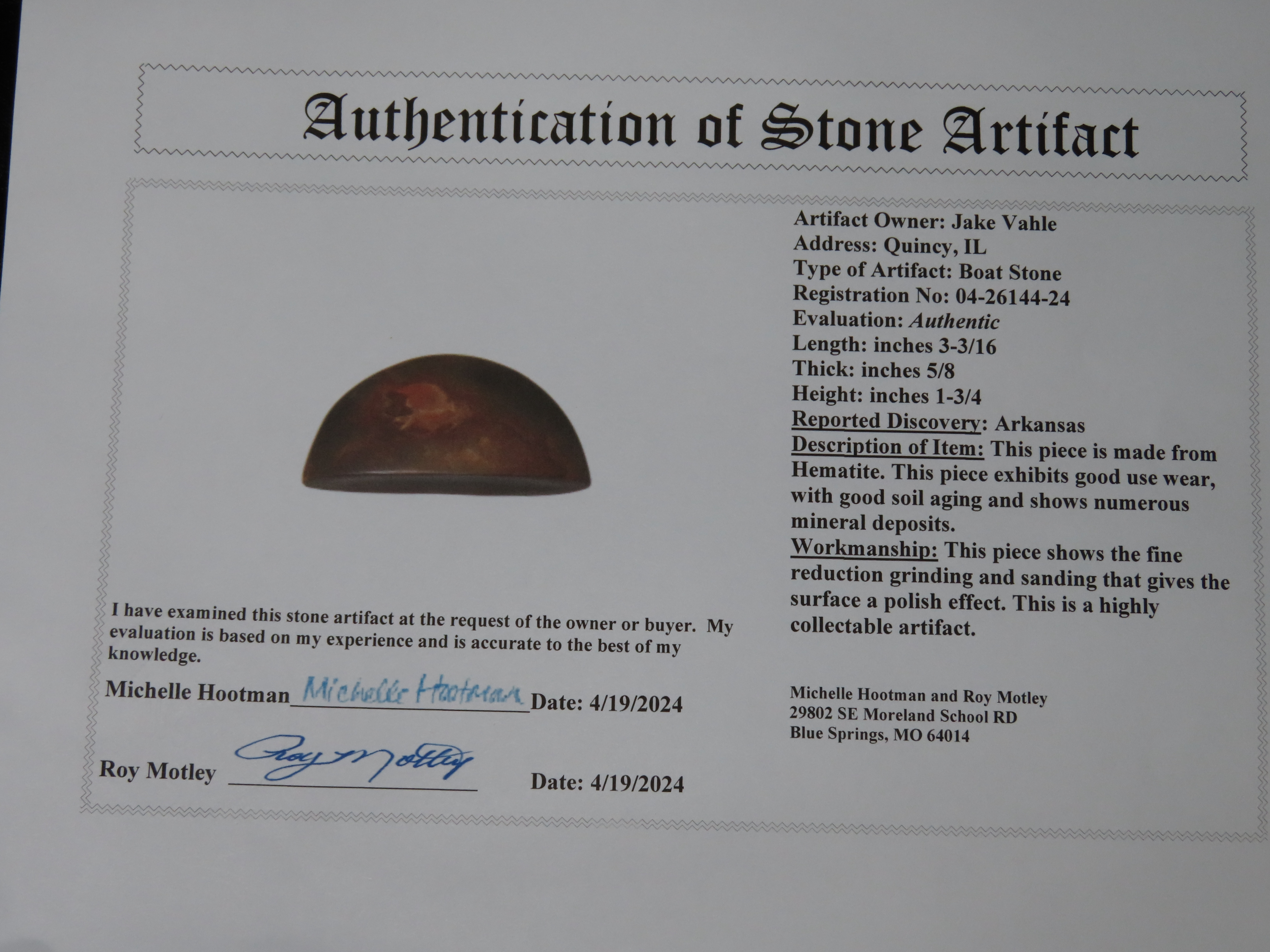 3 3/16″ Hematite Boatstone, 3xCOA-Dickey/Davis/Motley, found in Arkansas, Ex Jake Vahle Collection