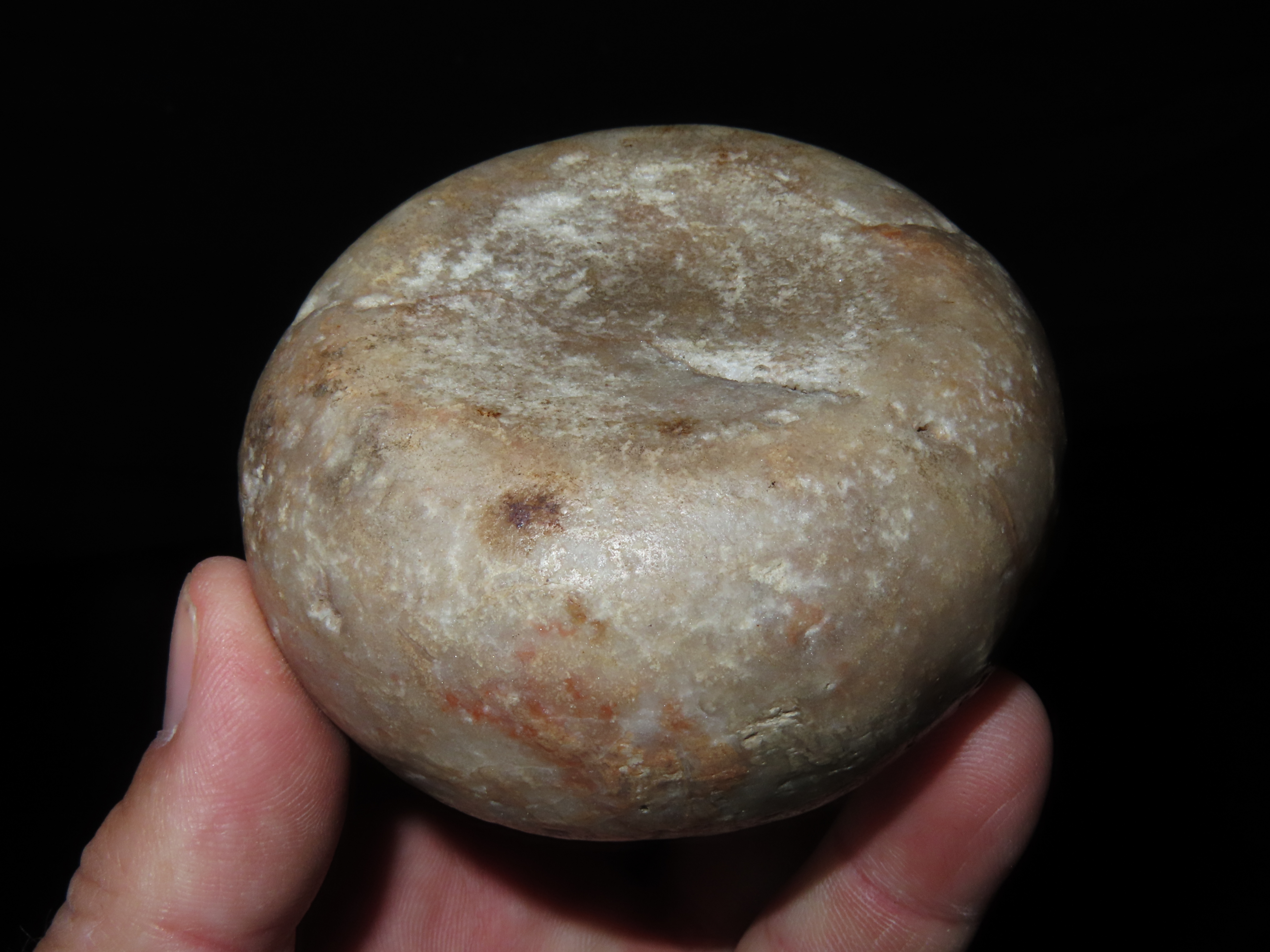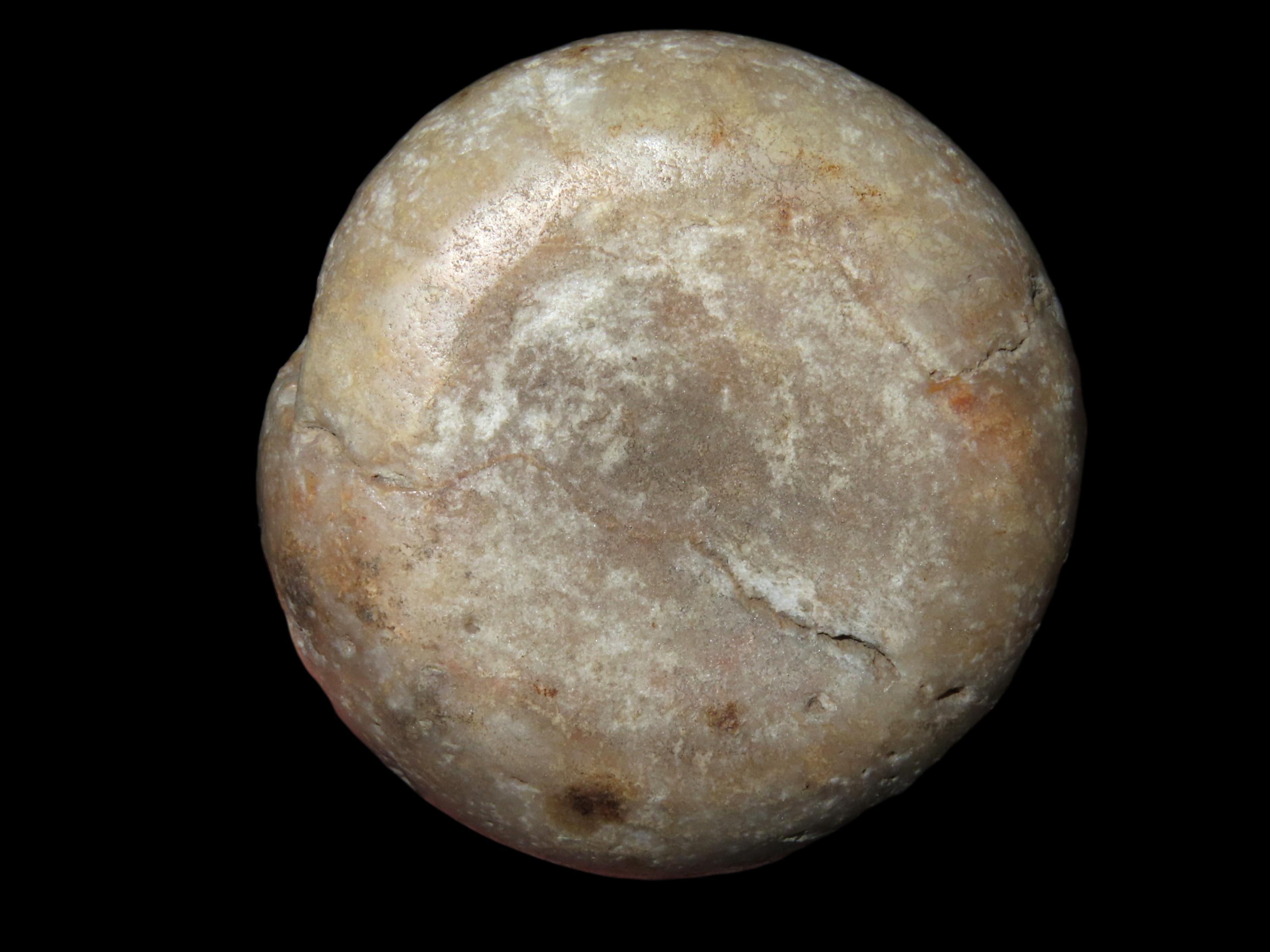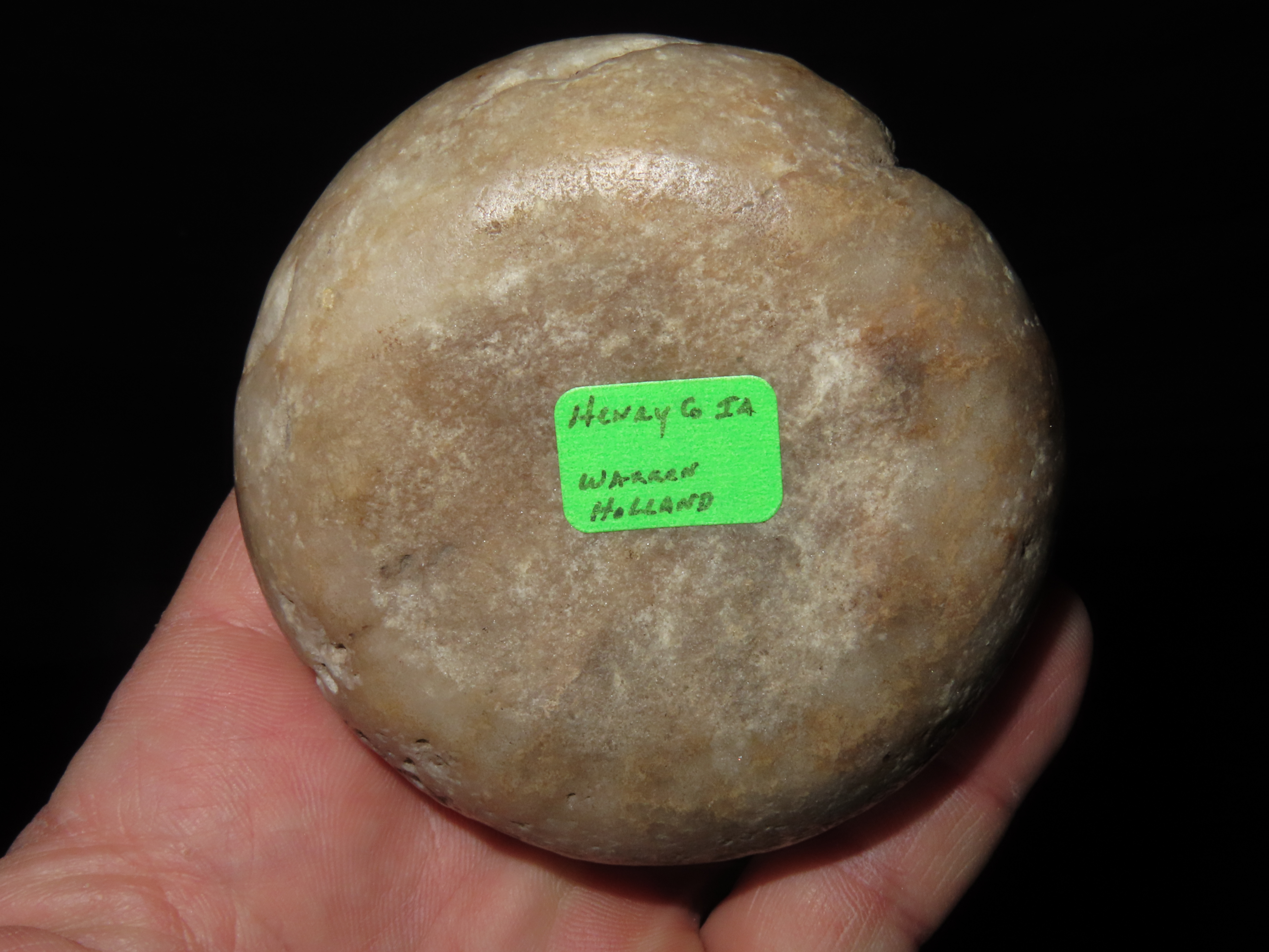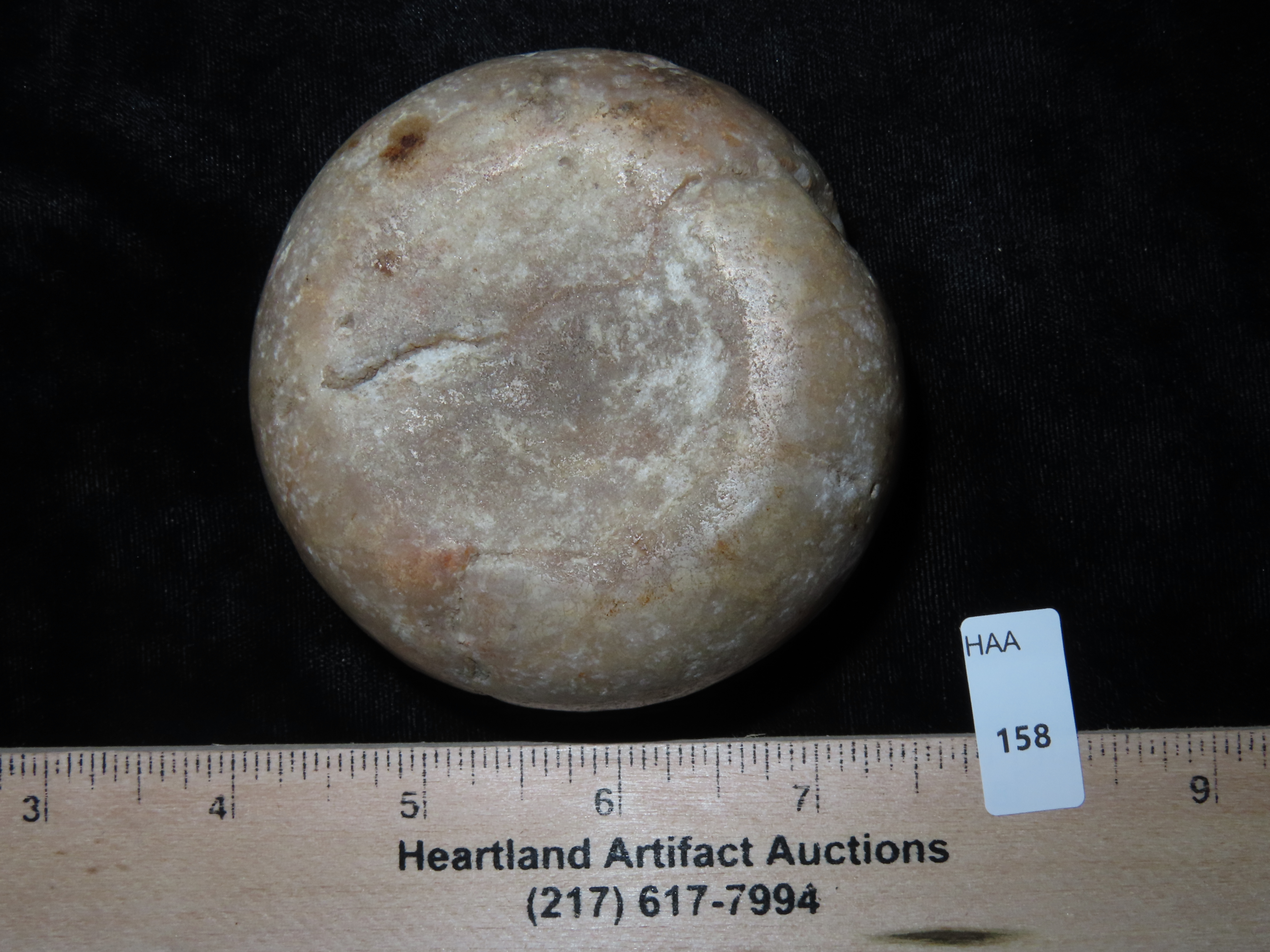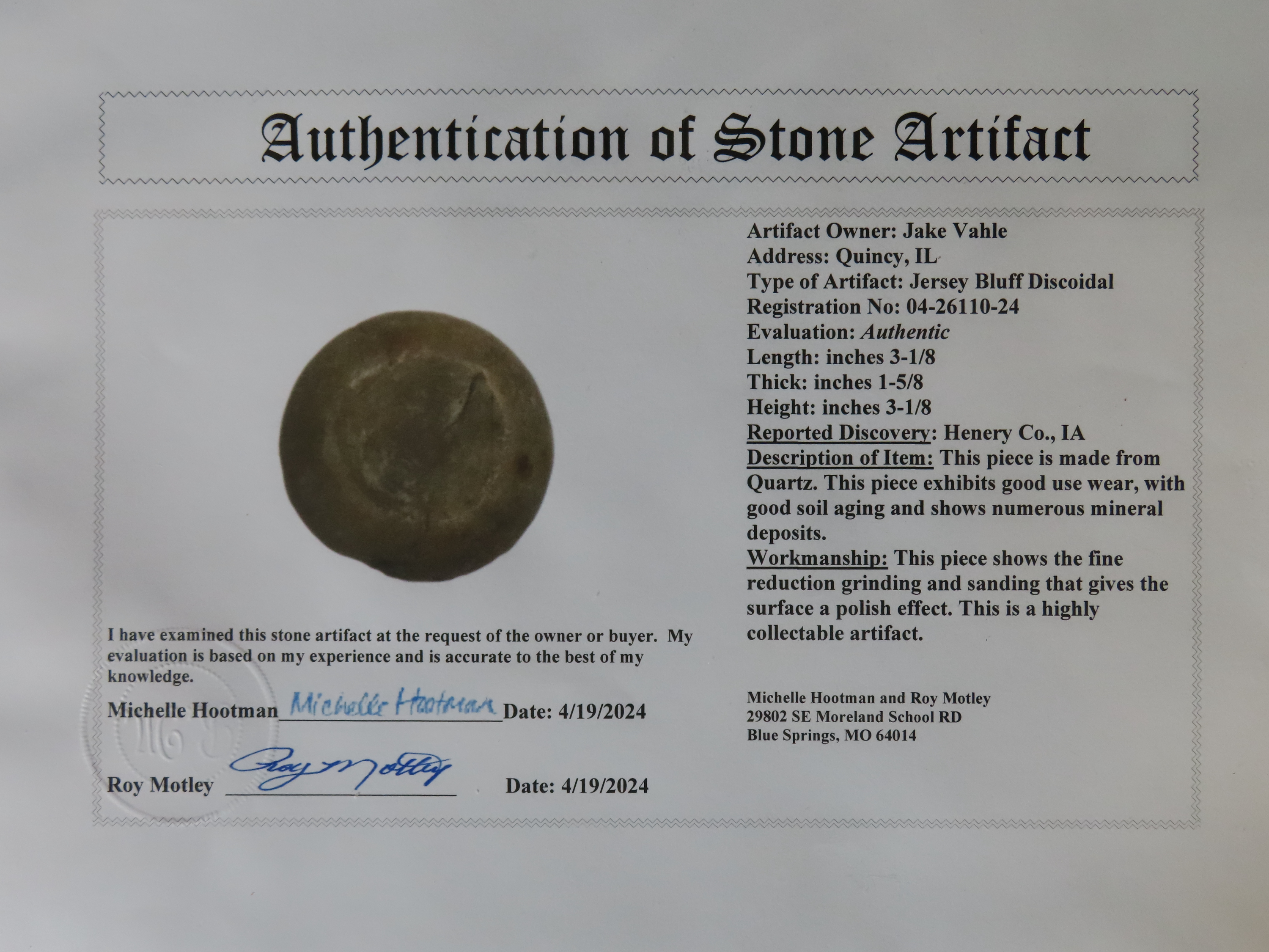 3 1/8″ Jersey Bluff Discoidal, Motley COA, found in Henry Co., Iowa, Ex Jake Vahle Collection