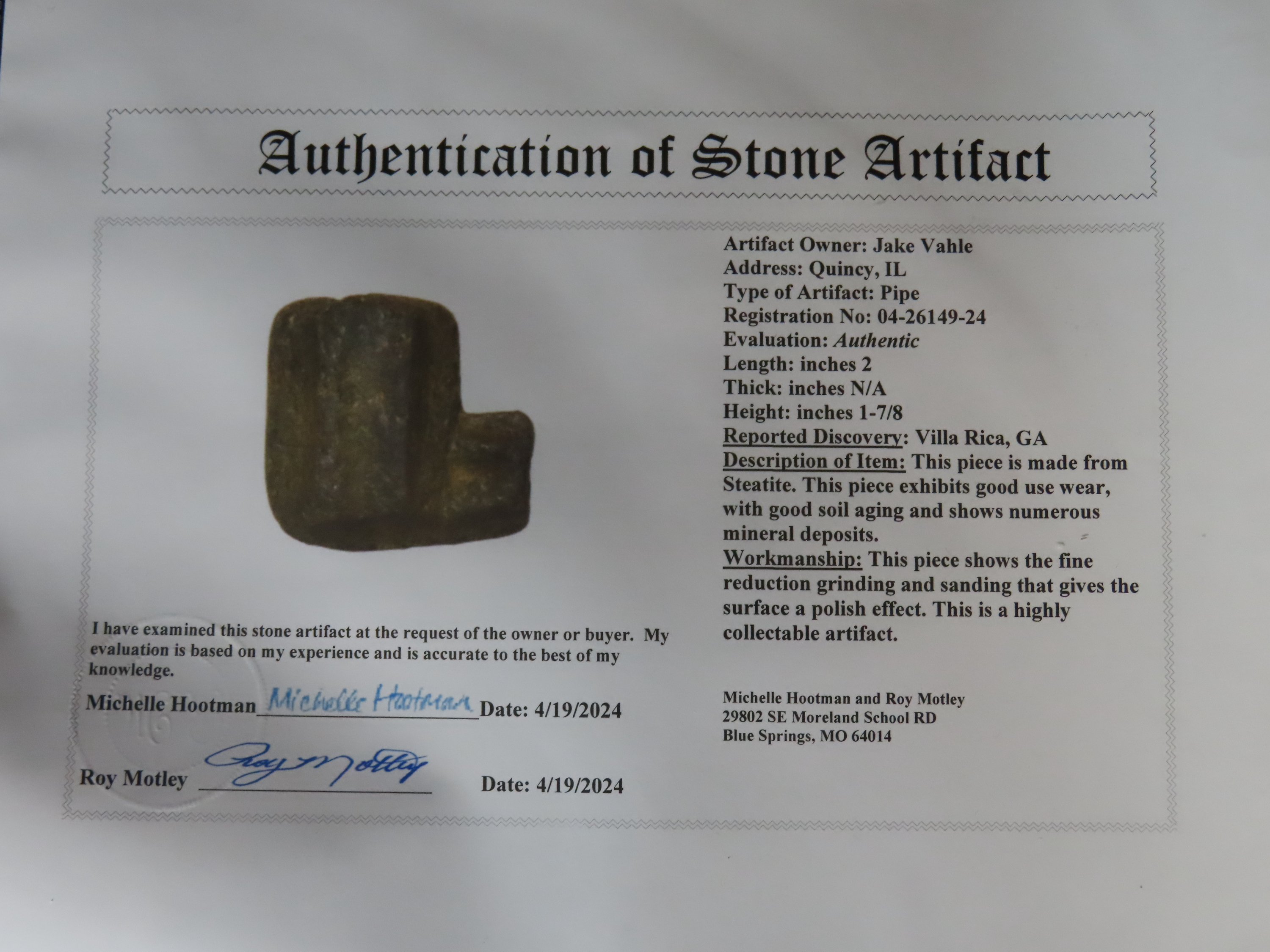 2″ Pipe, Motley COA, found in Villa Rica, Georgia, Ex Jake Vahle