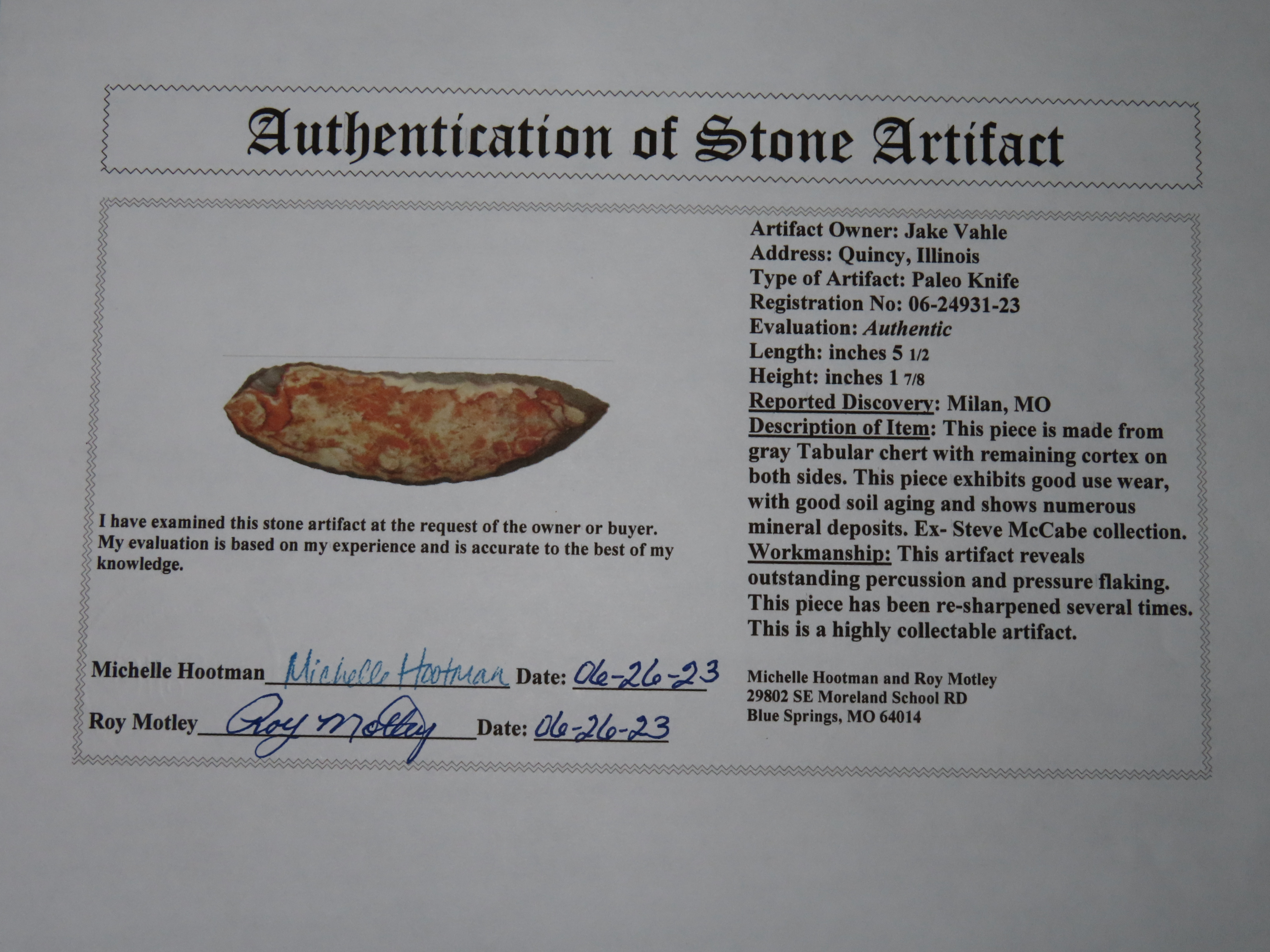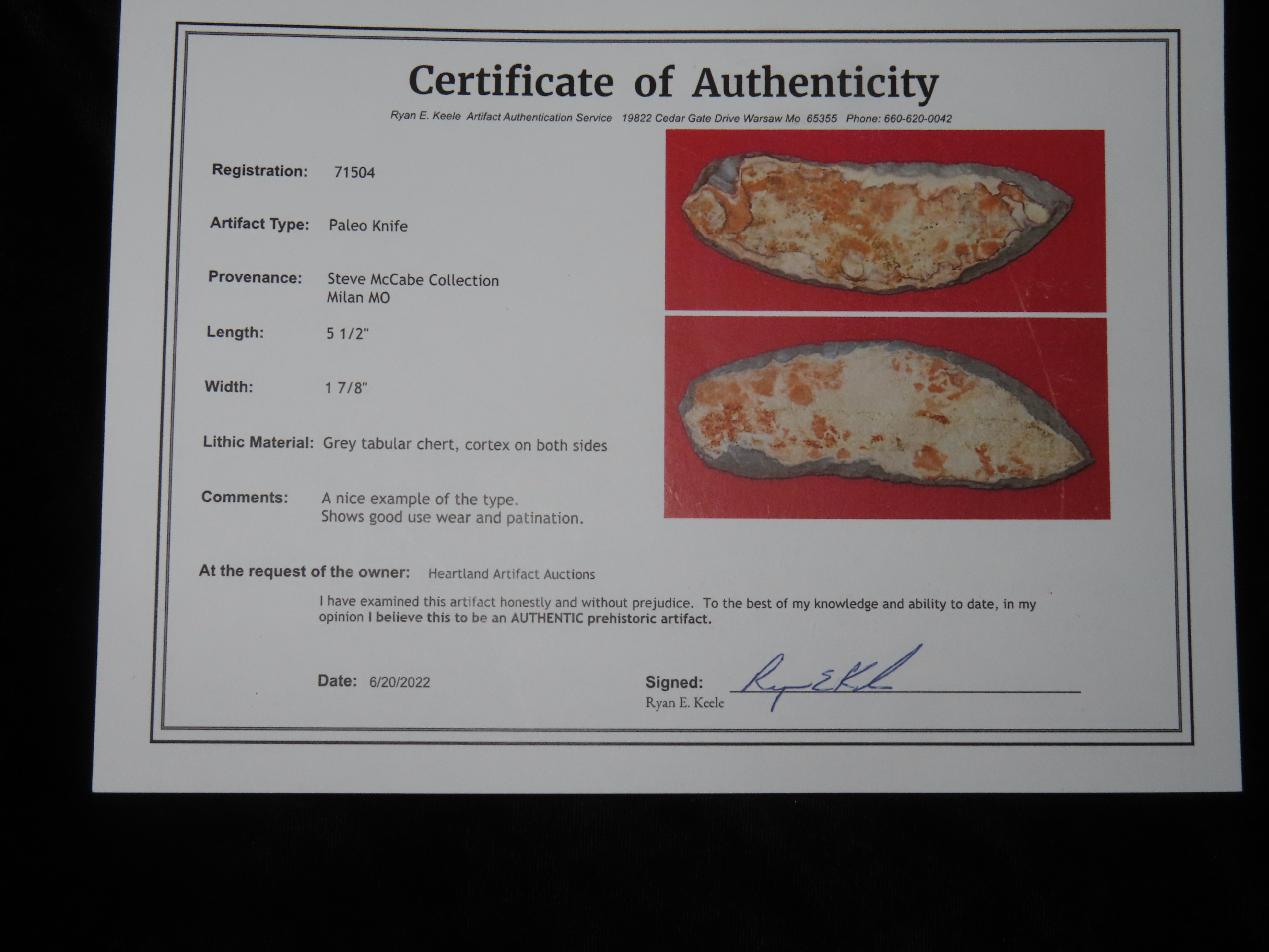 5 1/2" Paleo Knife, 2xCOA-Motley/Keele, found in Milan Missouri, Ex Steve McCabe, Ex Jake Vahle