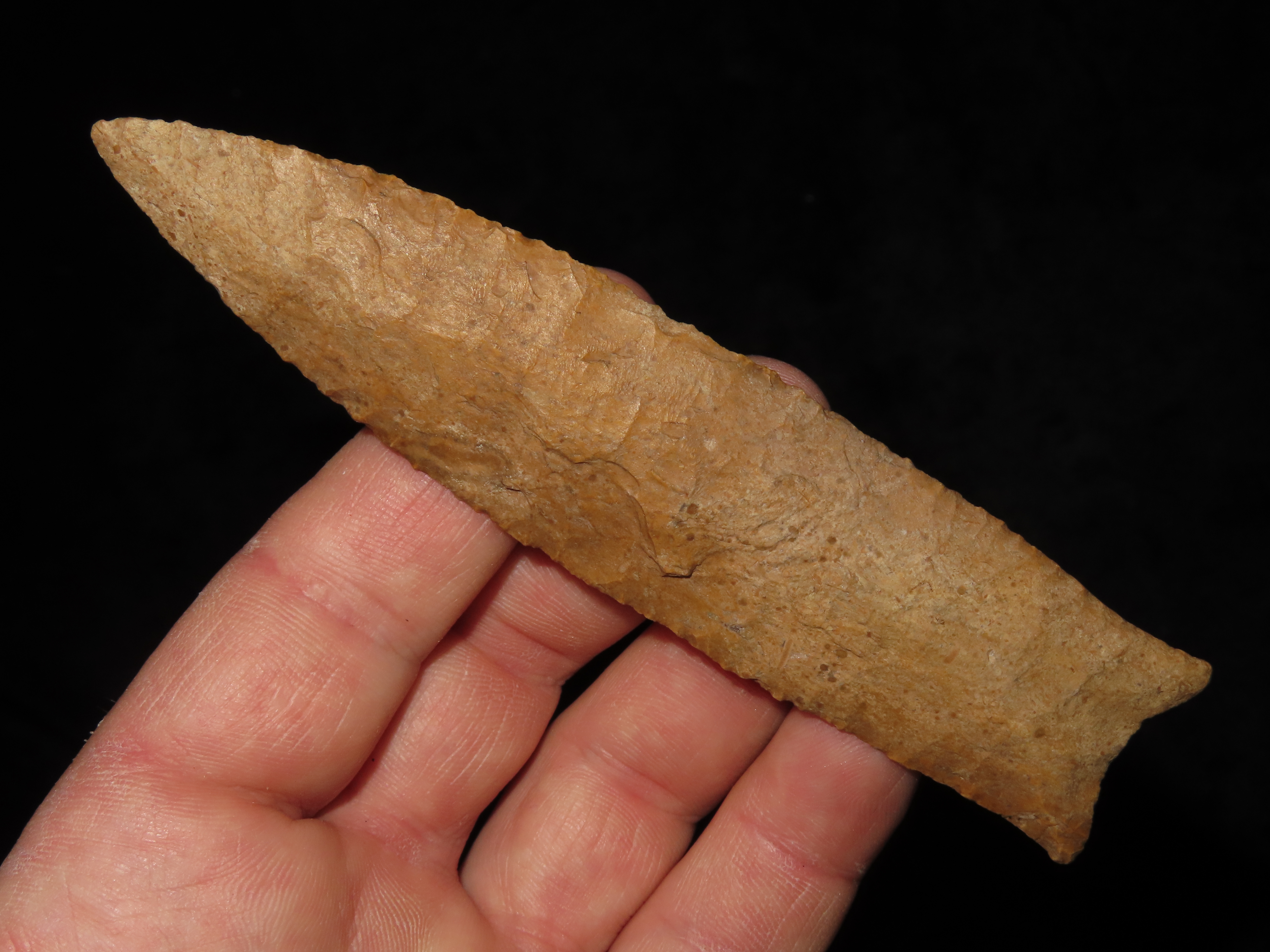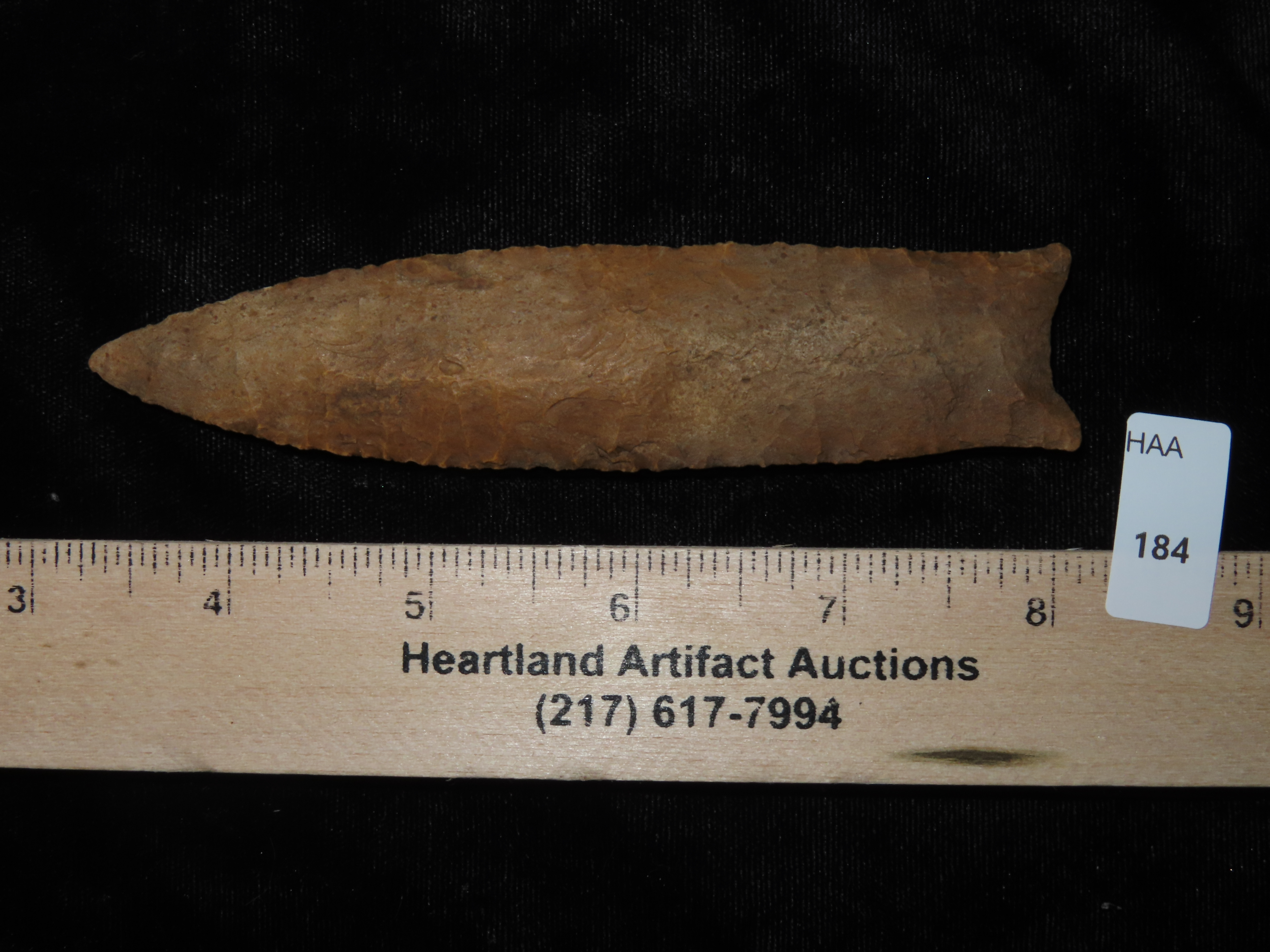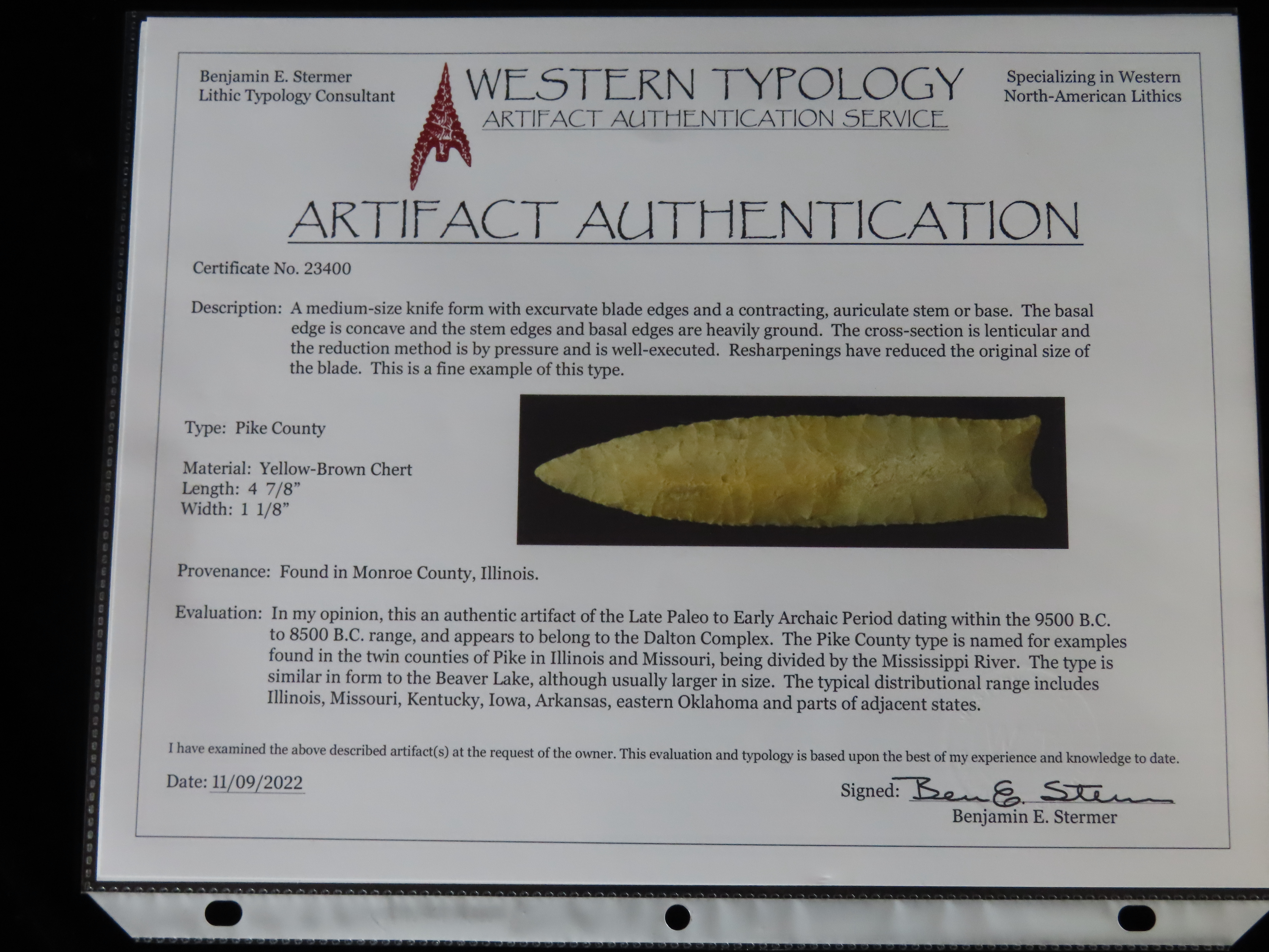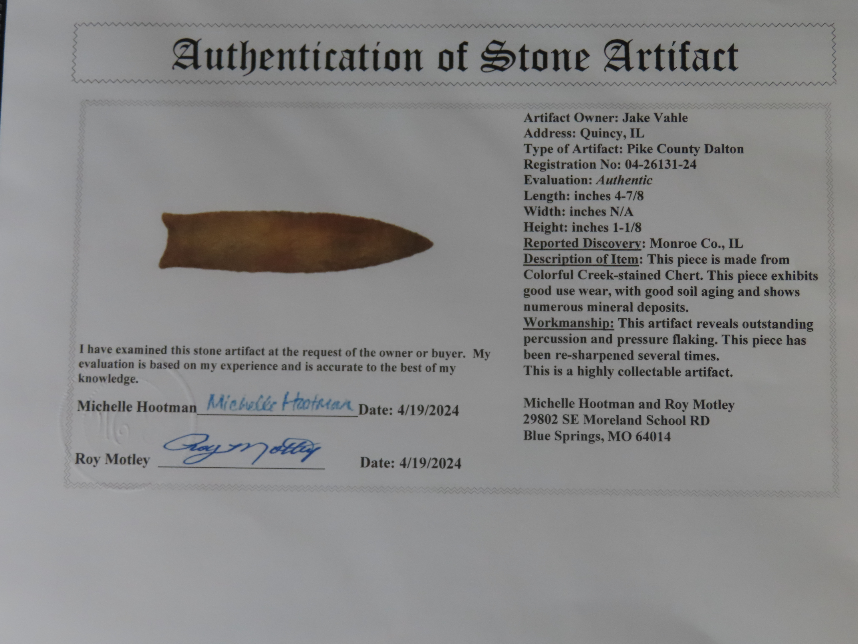 4 7/8″ Pike County Dalton, 2xCOA-Stermer/Dickey, found in Monroe Co., Illinois, Outstanding Creek Stained Chert material, Exceptional Flaking throughout. Ex Jake Vahle Collection, Quincy, Illinois