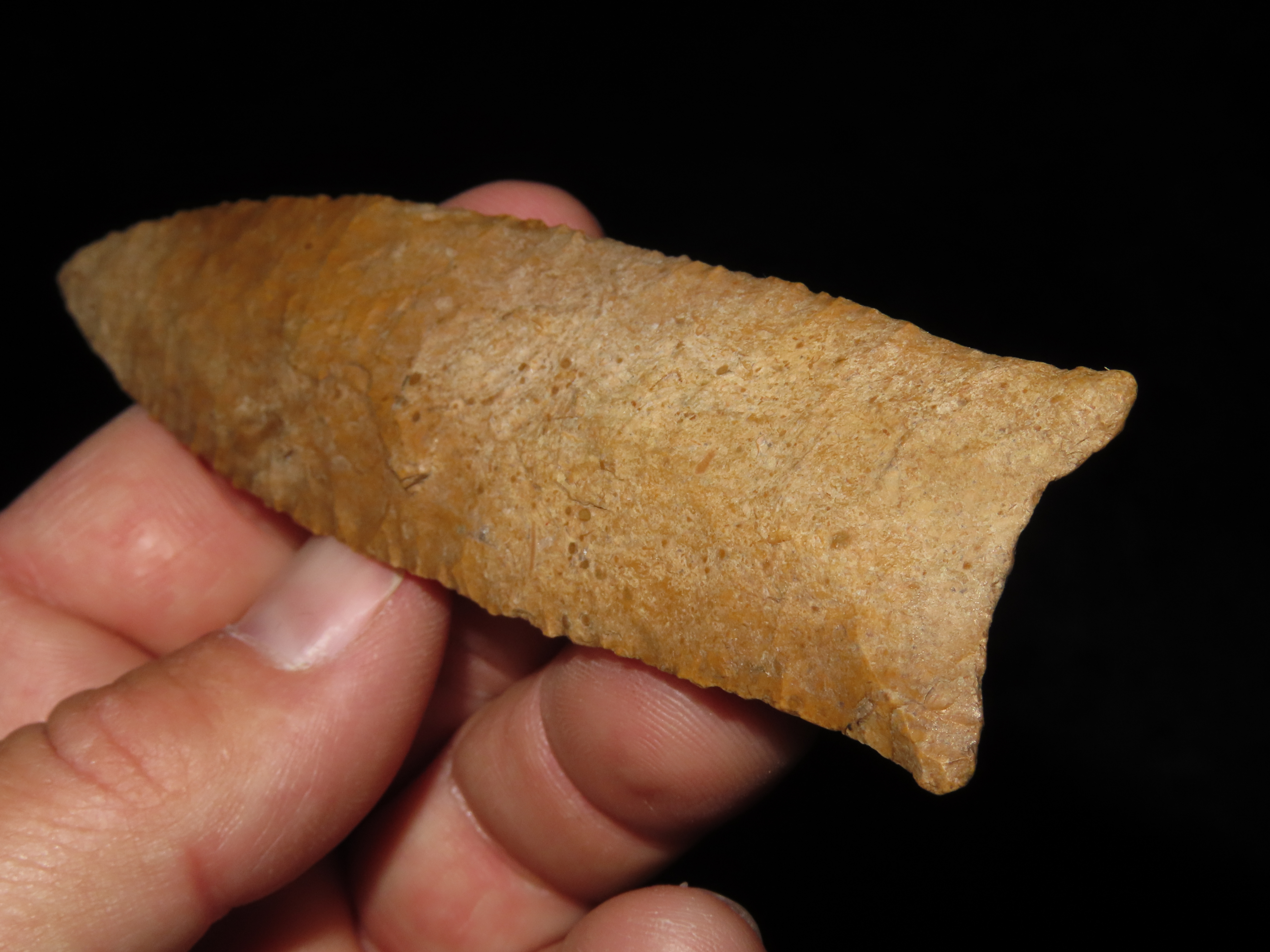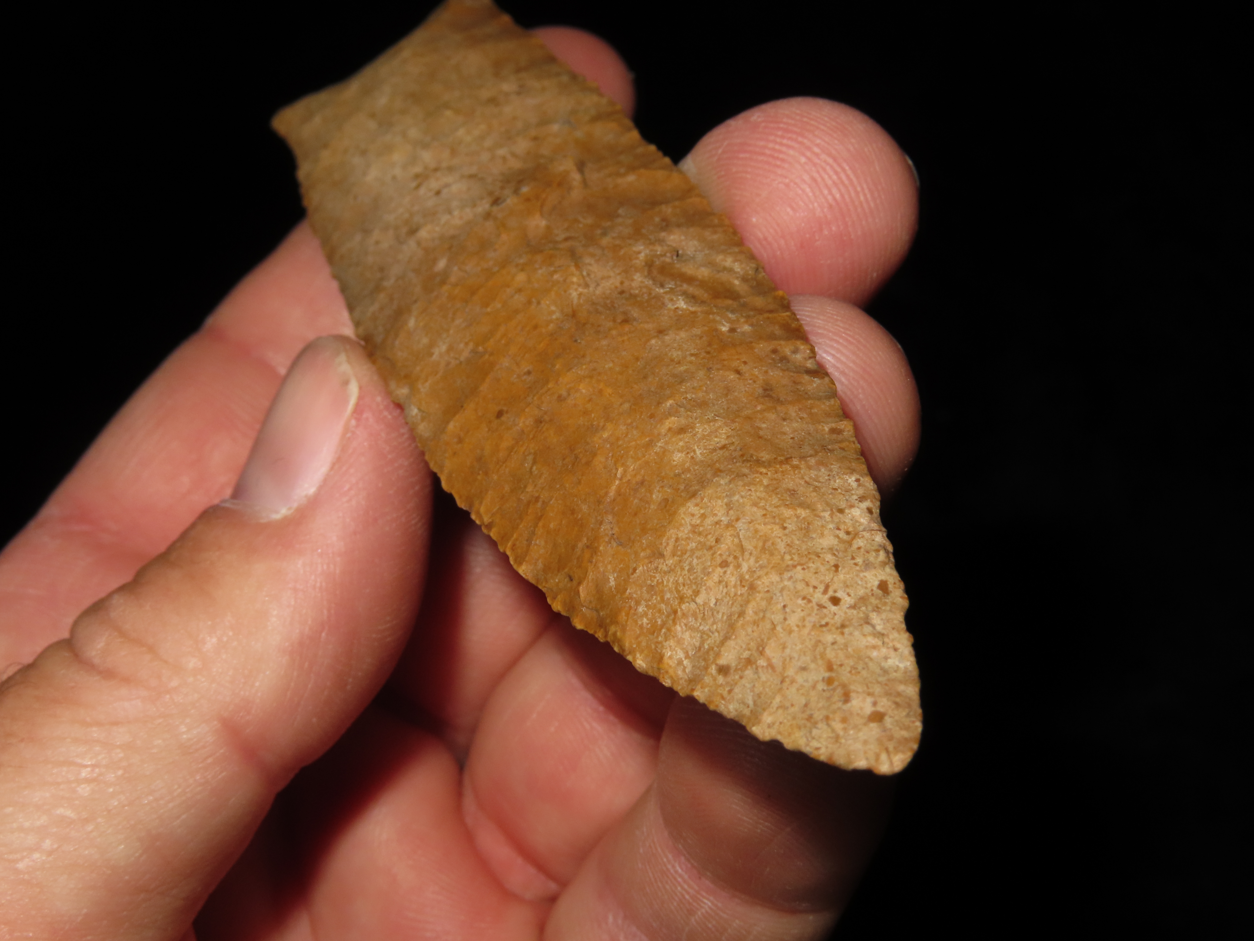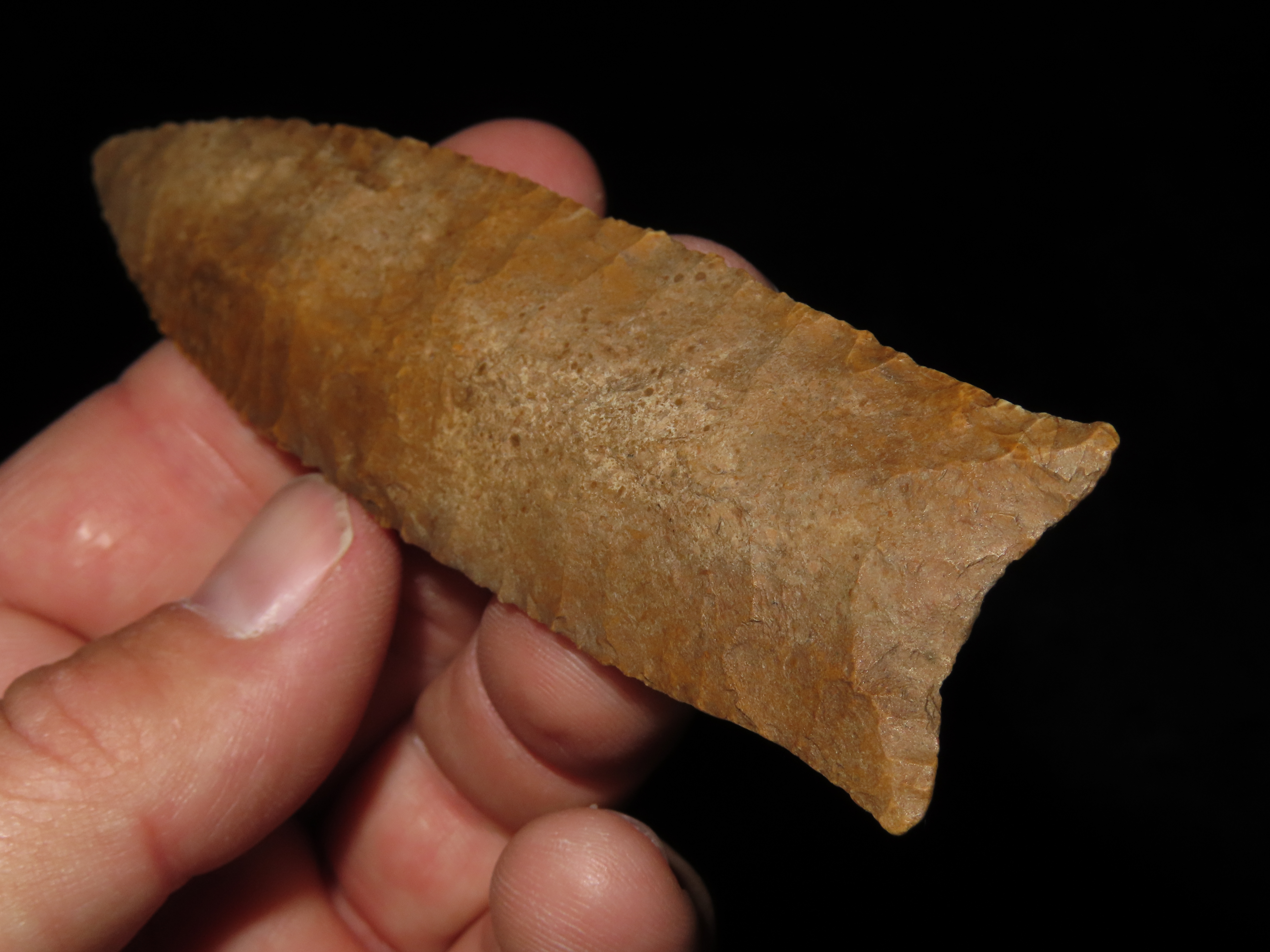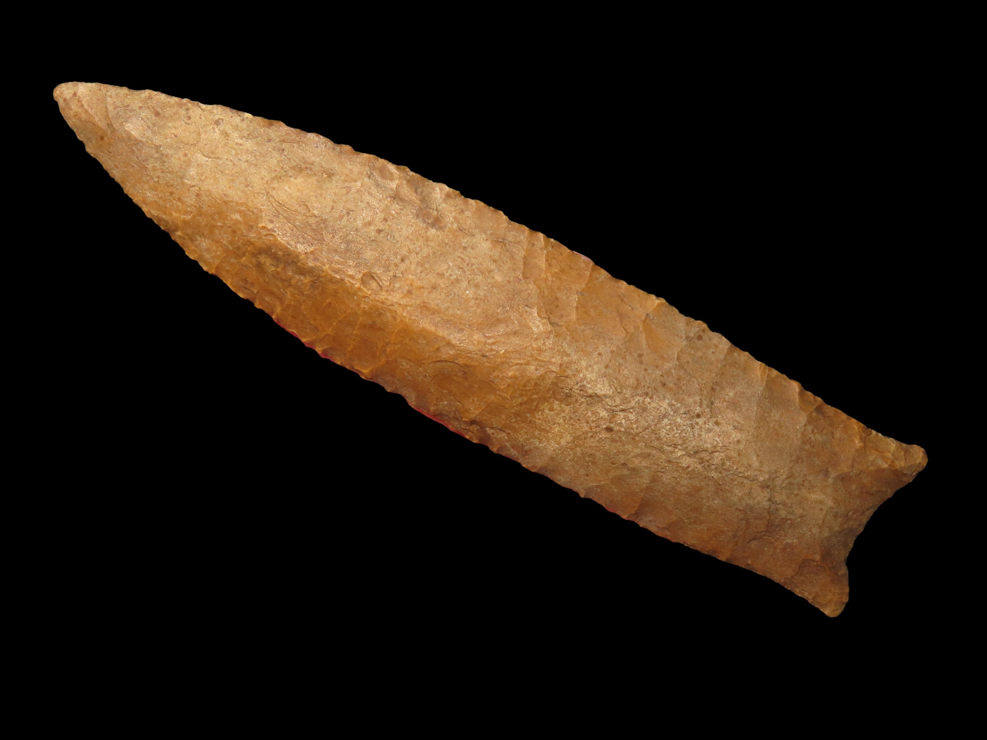 4 7/8″ Pike County Dalton, 2xCOA-Stermer/Dickey, found in Monroe Co., Illinois, Outstanding Creek Stained Chert material, Exceptional Flaking throughout. Ex Jake Vahle Collection, Quincy, Illinois