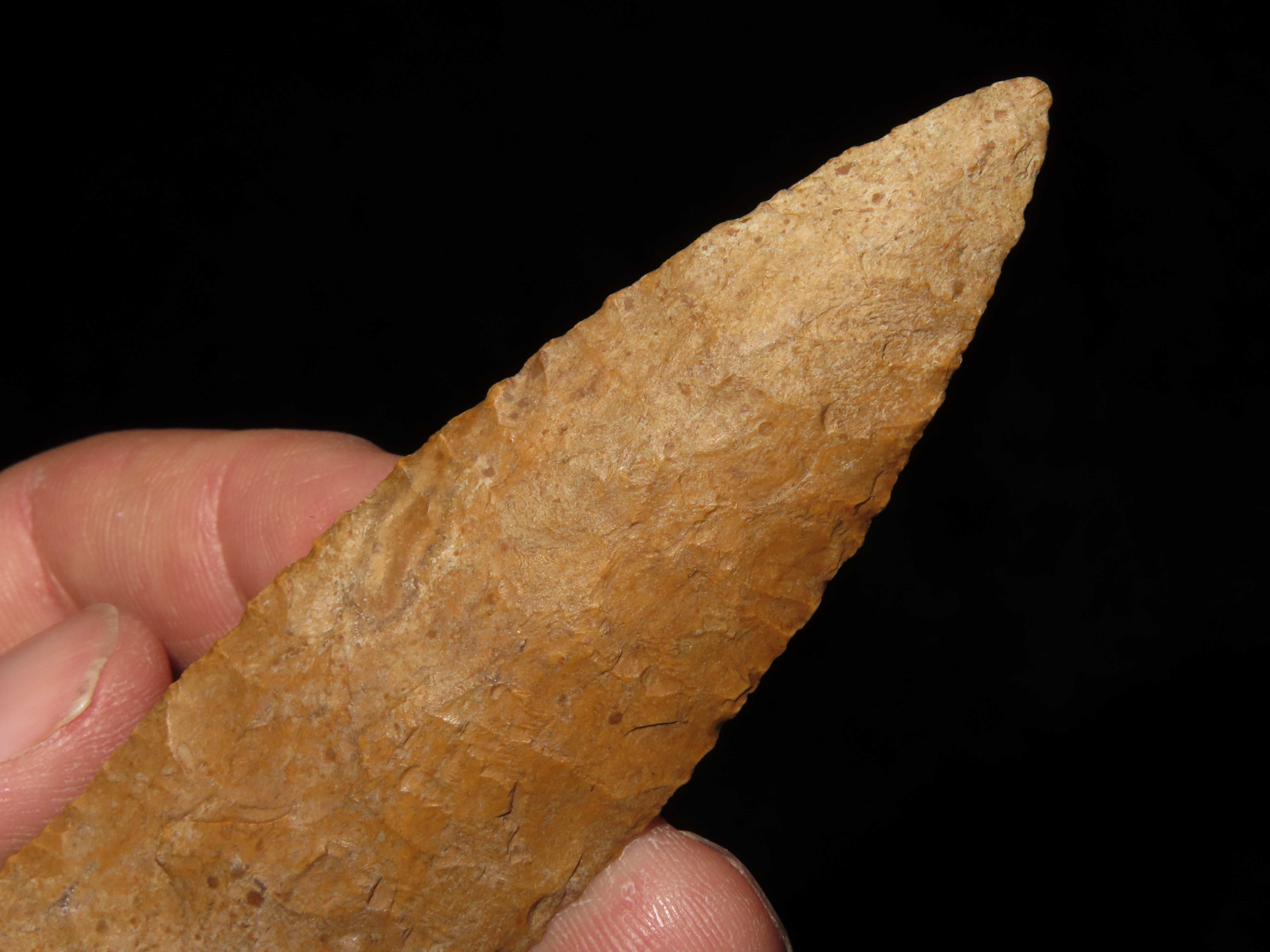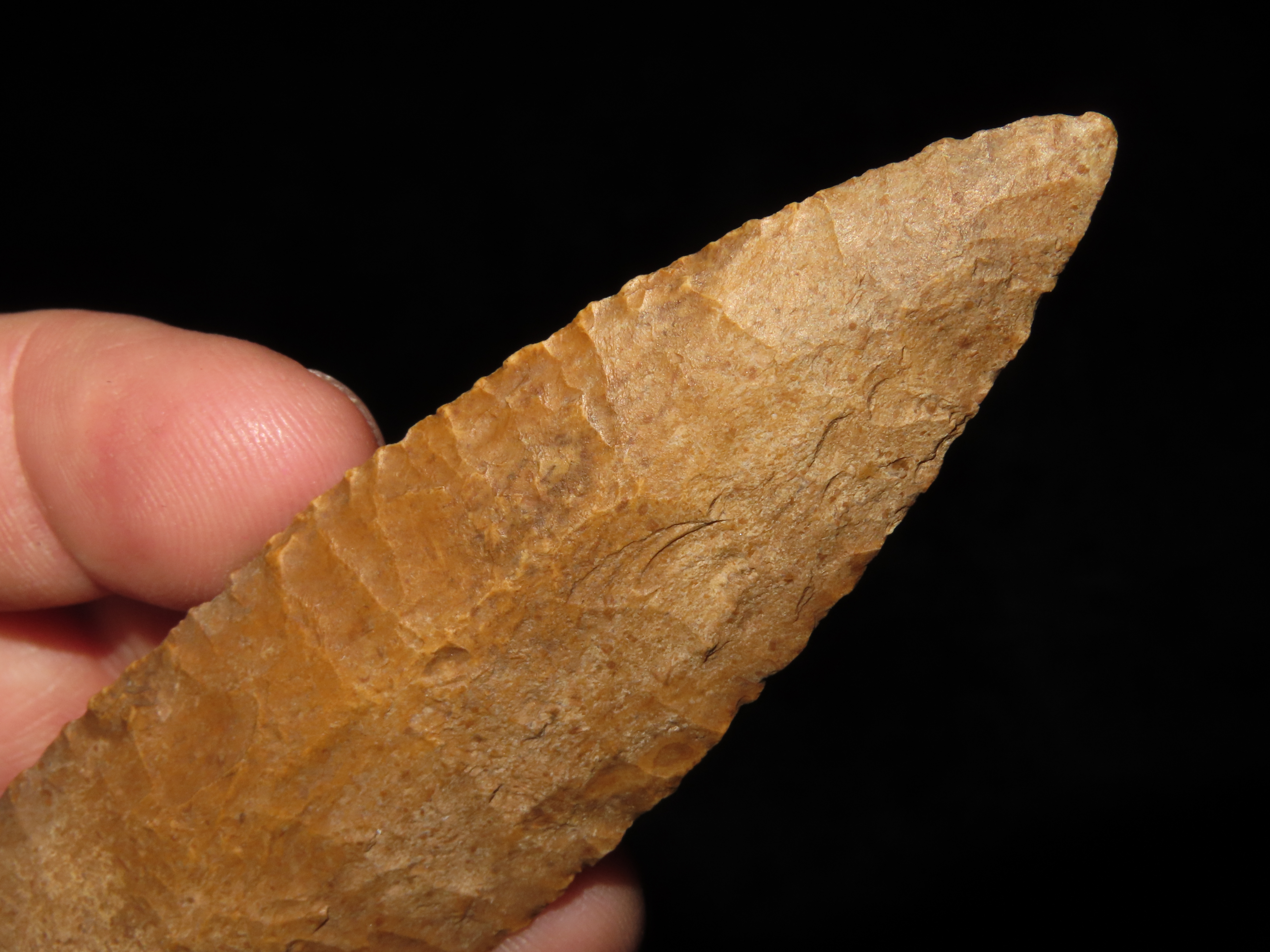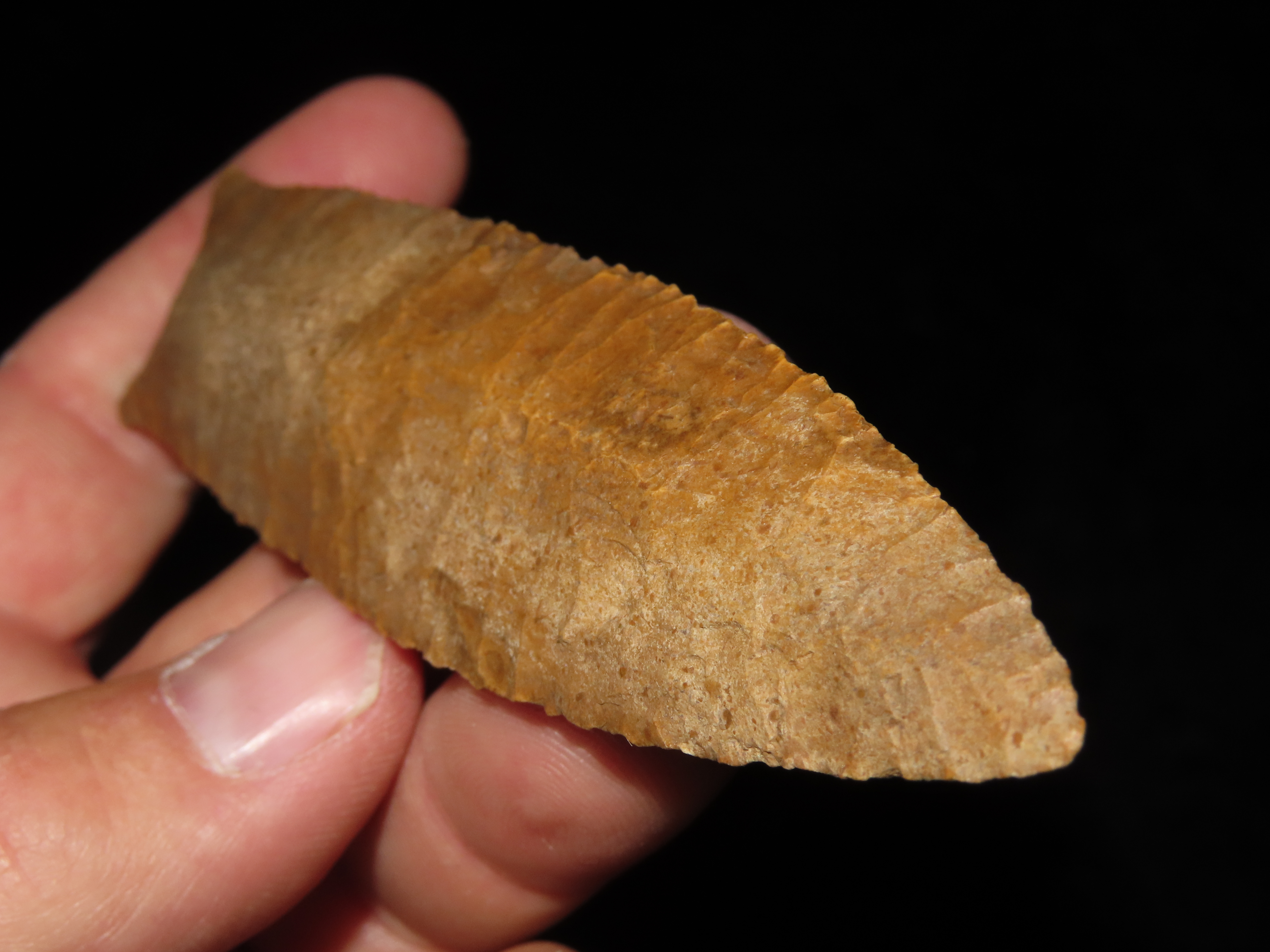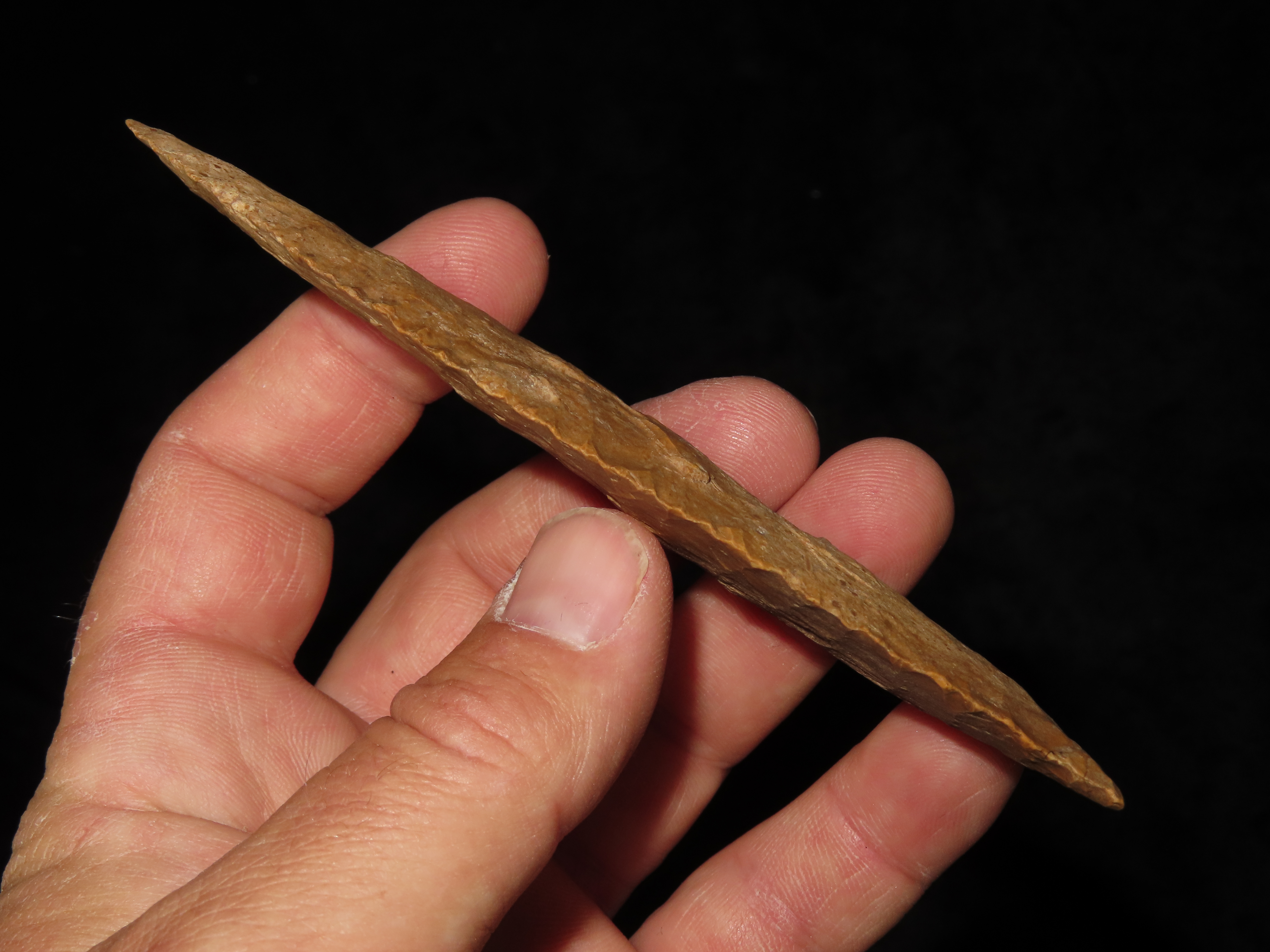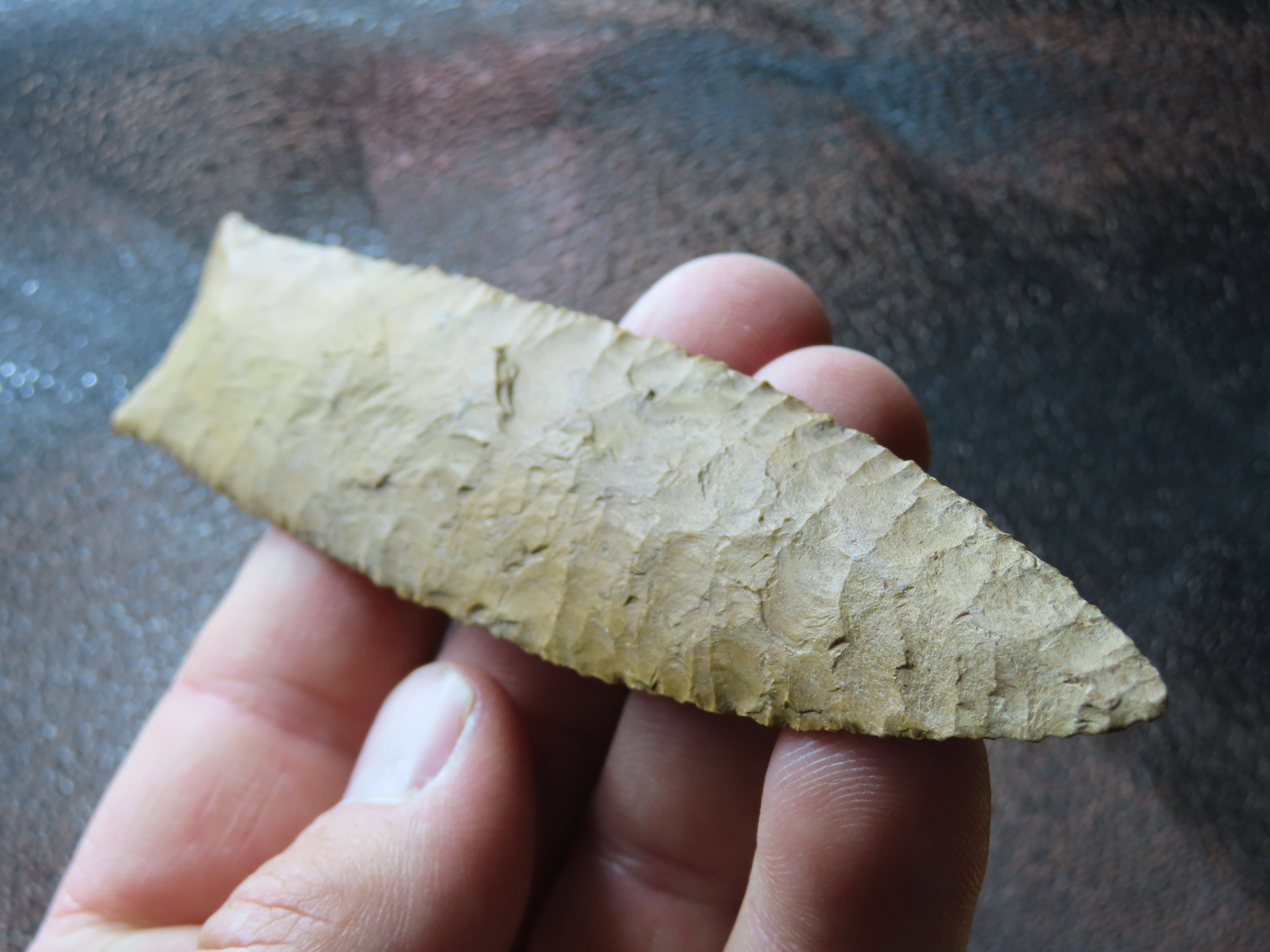 4 7/8″ Pike County Dalton, 2xCOA-Stermer/Dickey, found in Monroe Co., Illinois, Outstanding Creek Stained Chert material, Exceptional Flaking throughout. Ex Jake Vahle Collection, Quincy, Illinois