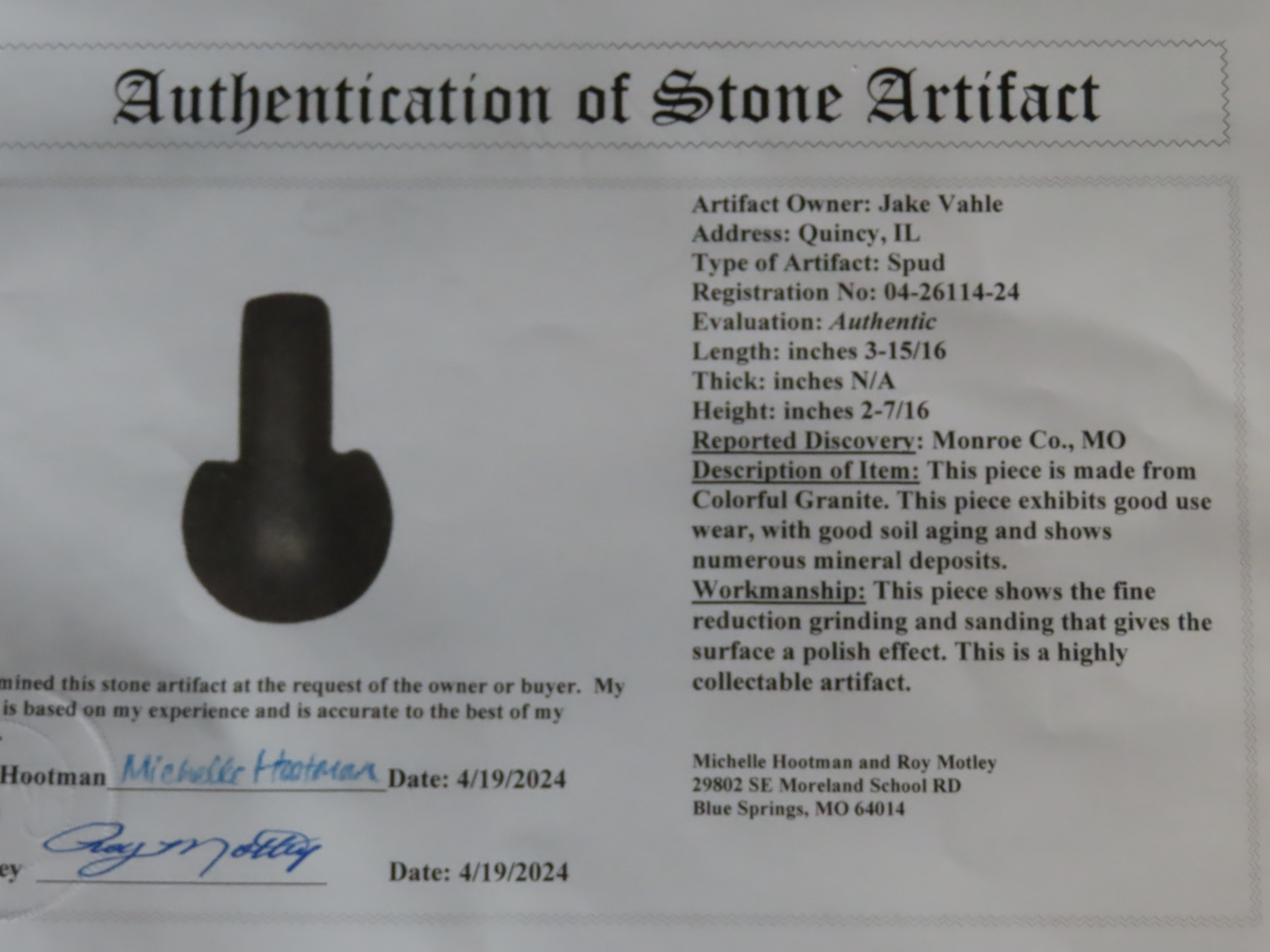3 15/16″ Spud, Motley COA, found in Monroe Co., Missouri, Ex Jake Vahle Collection, Quincy, Illinois
