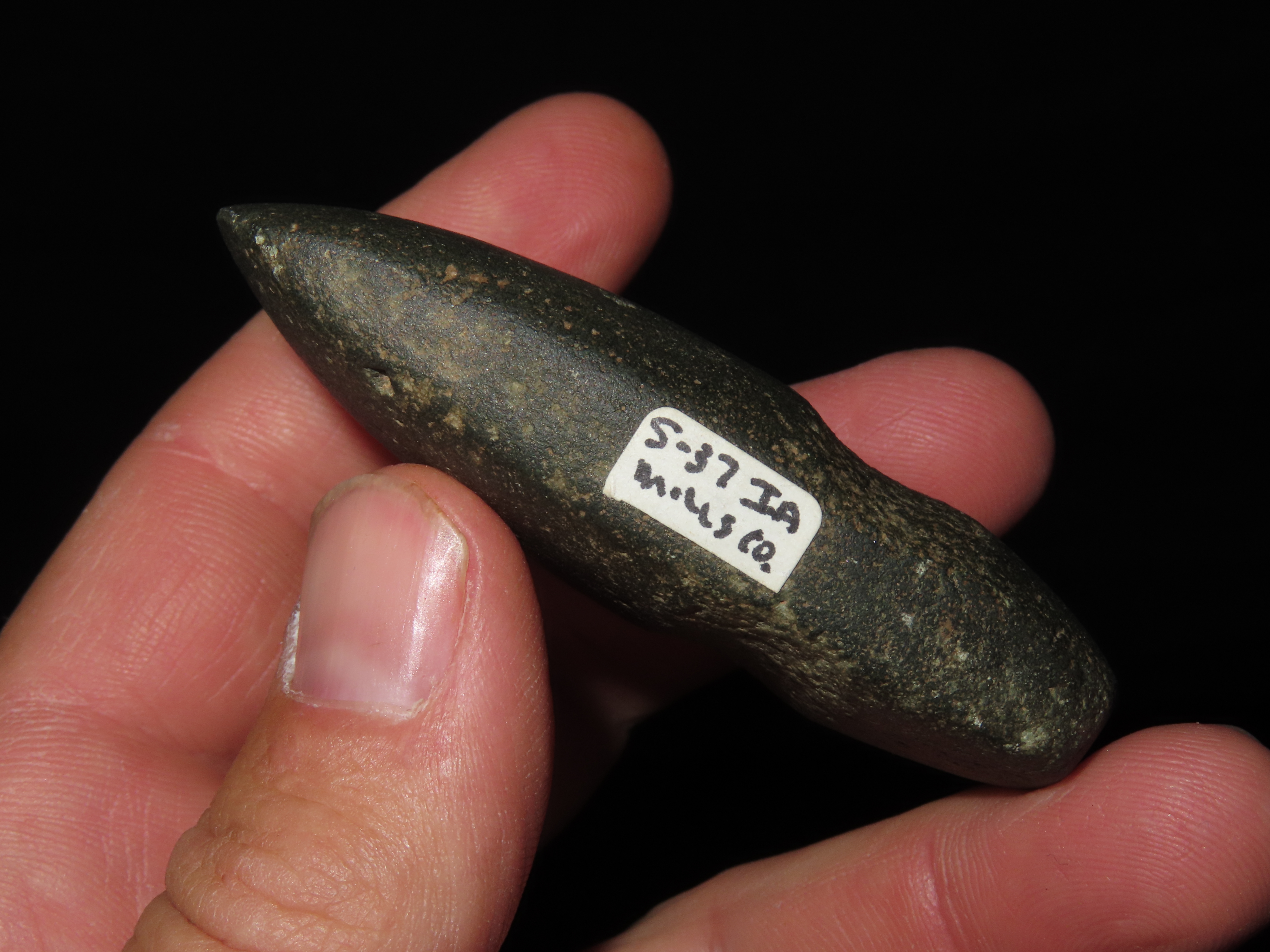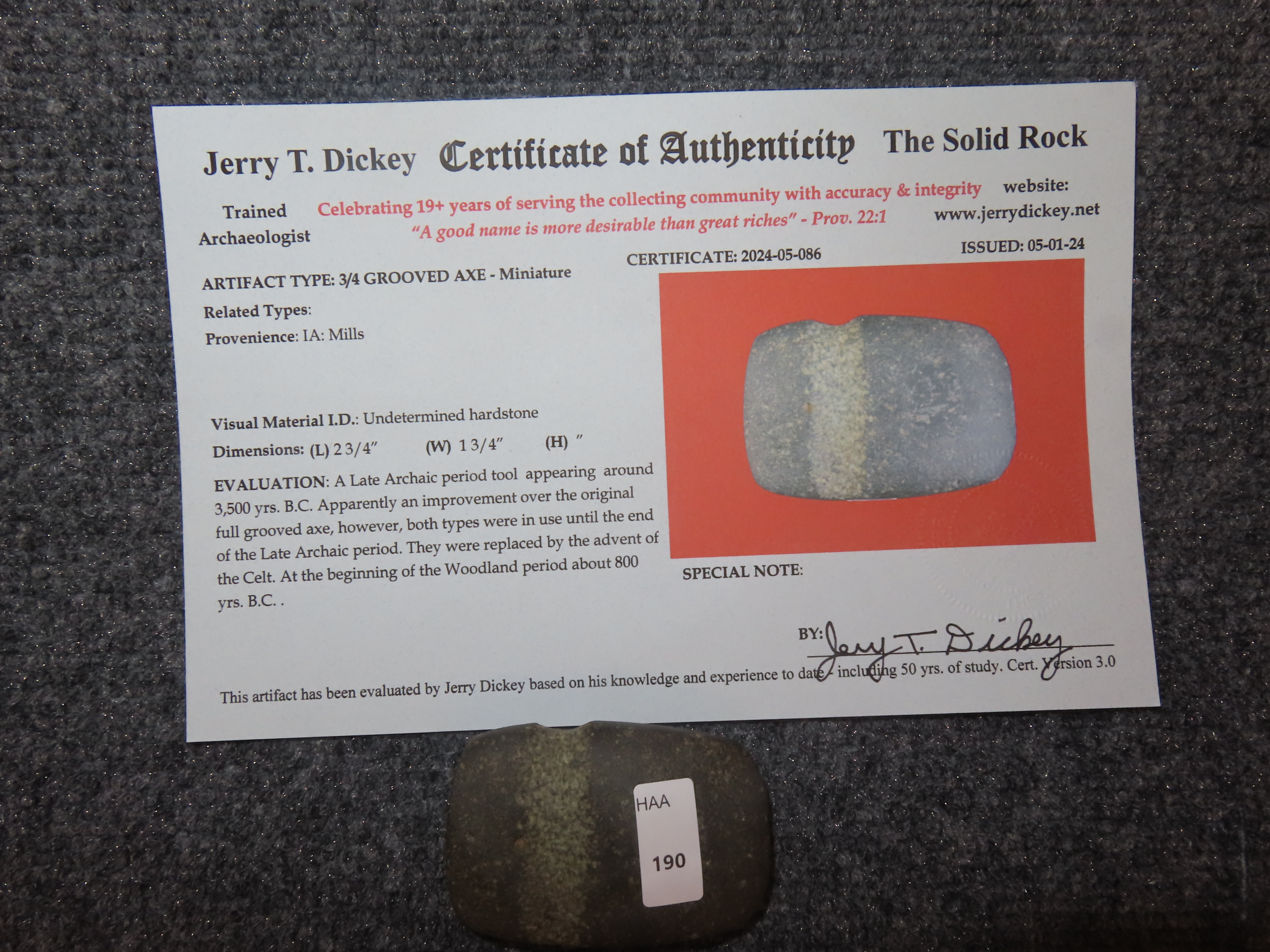 2 3/4″ Miniature 3/4 Groove Axe, found in Mills Co., Iowa, Ex Jake Vahle Collection, Quincy, Illinois