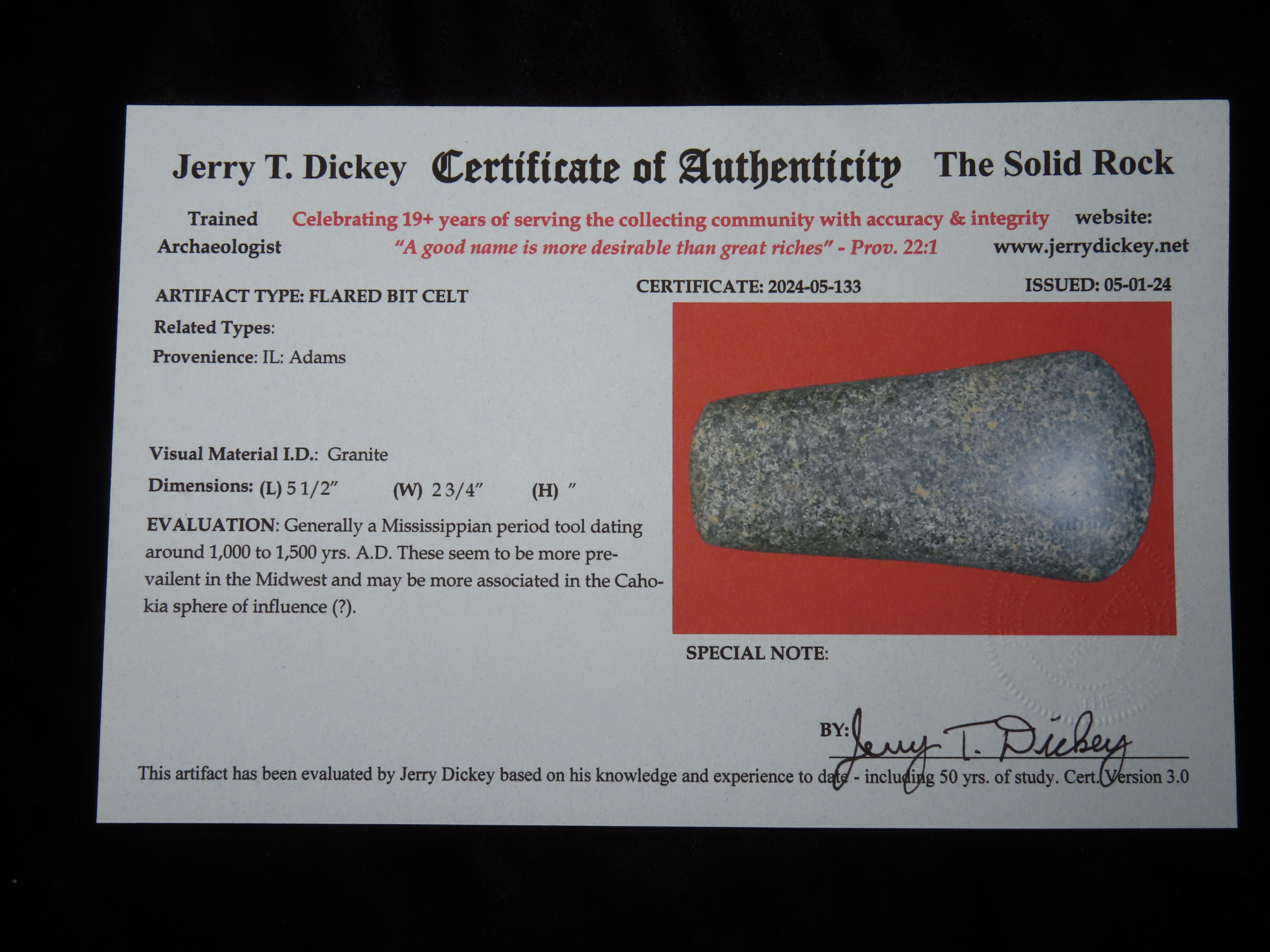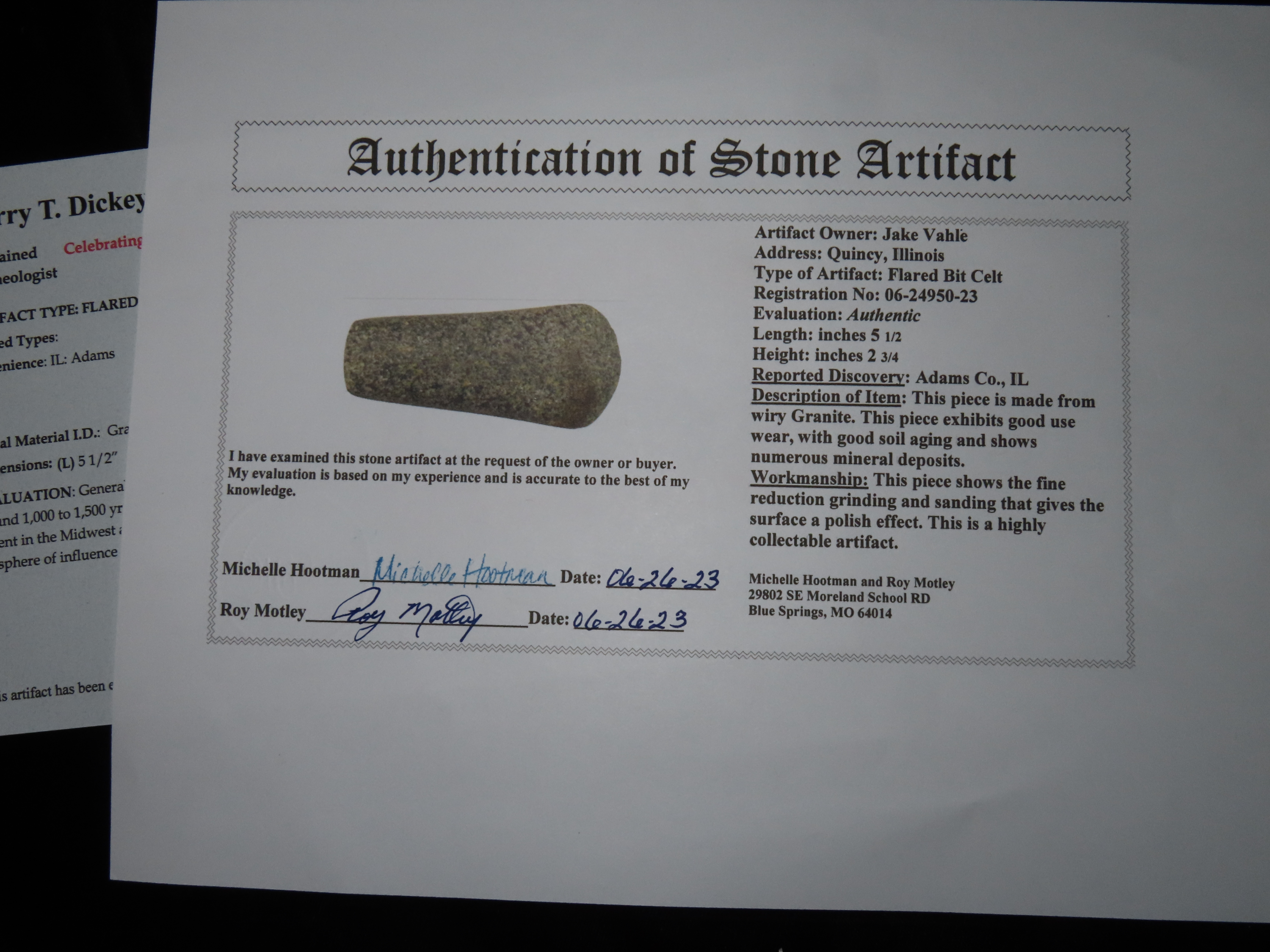 5 1/2" Granite Flared Bit Celt, 2xCOA-Dickey/Motley, found in Adams Co., Illinois, purchased from original finder in 2021, Ex Jake Vahle Collection, Quincy, Illinois