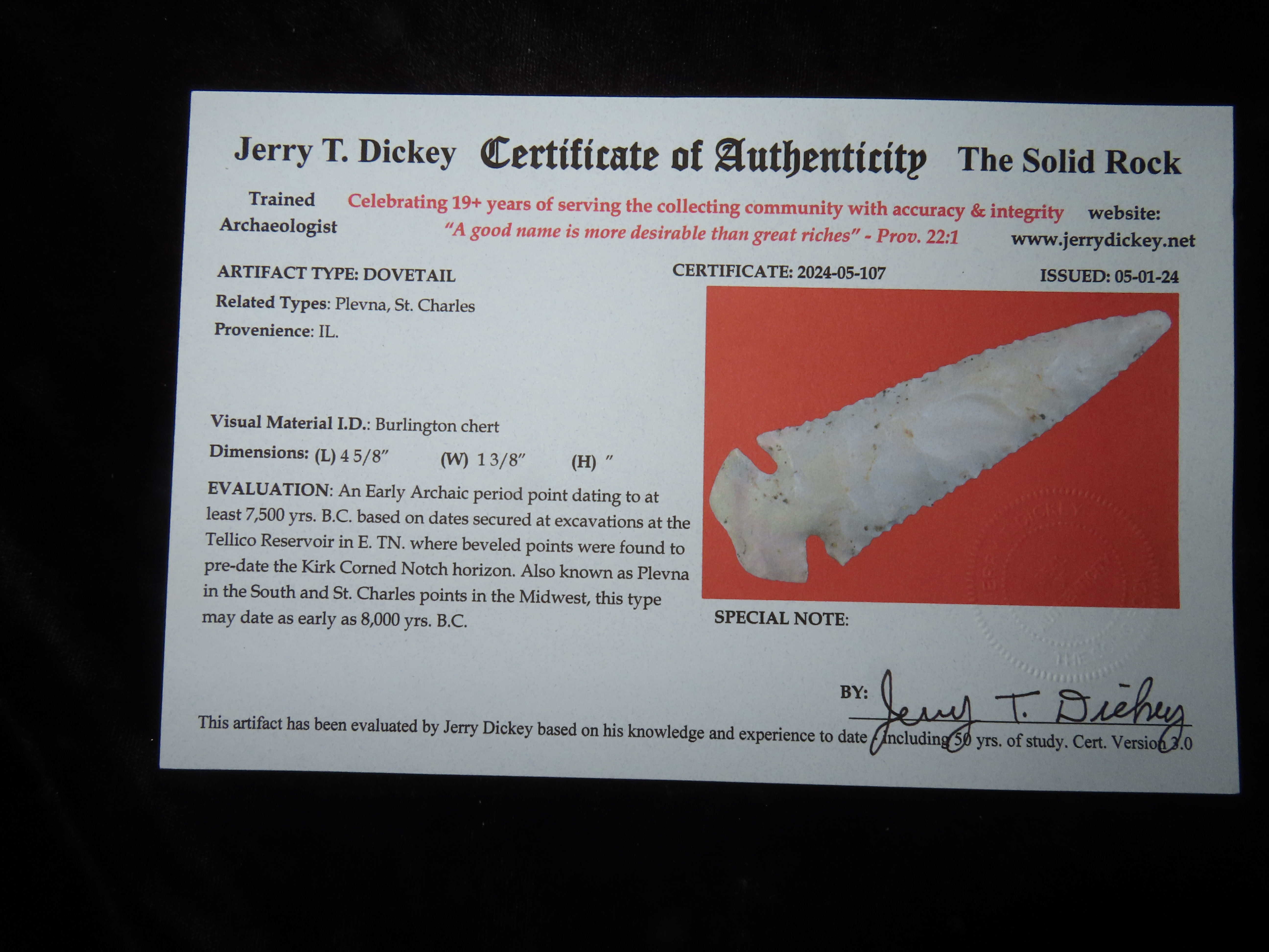 4 5/8″ Dovetail, Dickey COA, found in Jersey Co., Illinois, Ex Jake Vahle Collection, Quincy, Illinois
