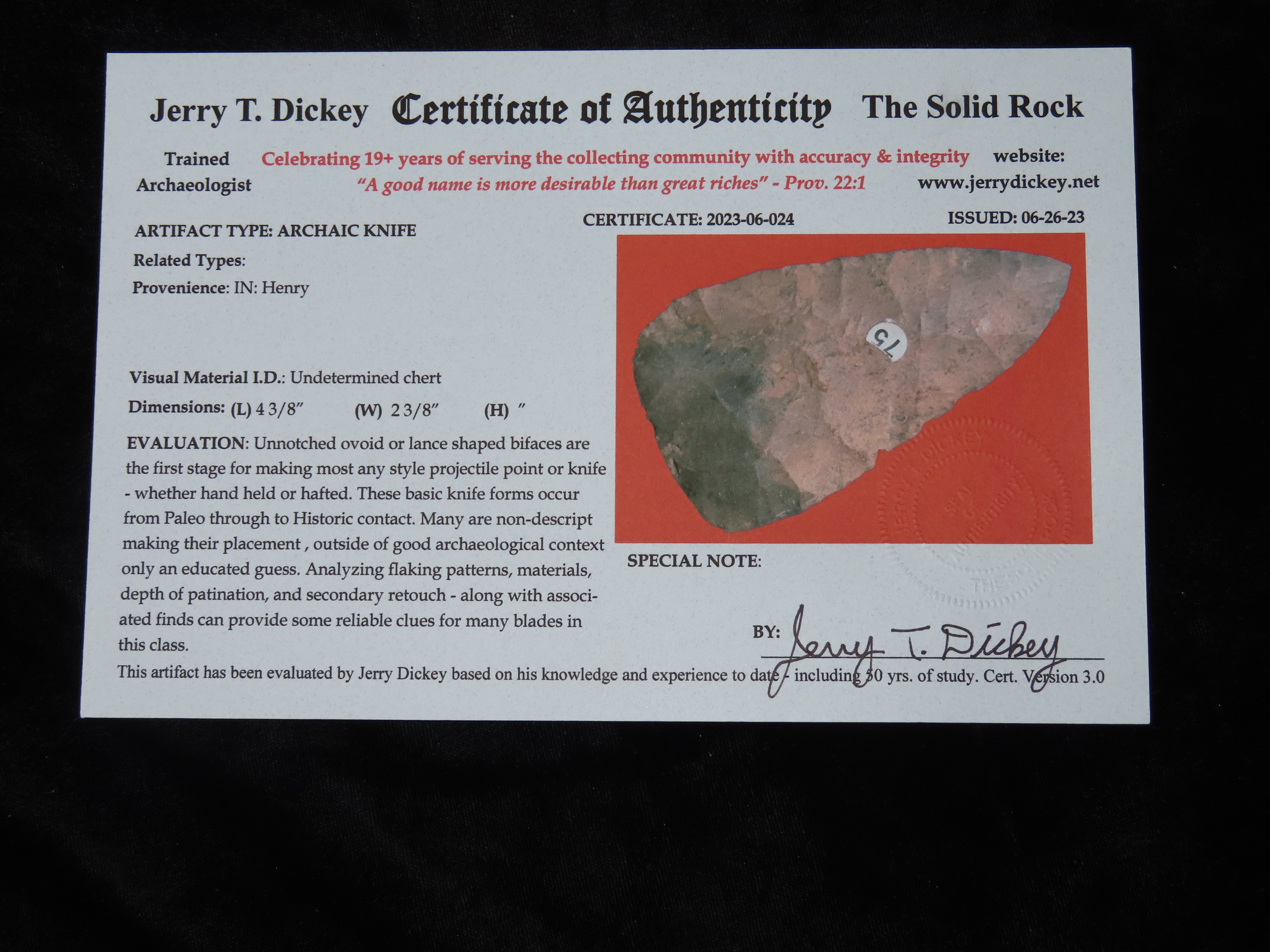 4.3/8″ Cobbs Knife, Dickey COA, Colorful material found in Henry Co IL