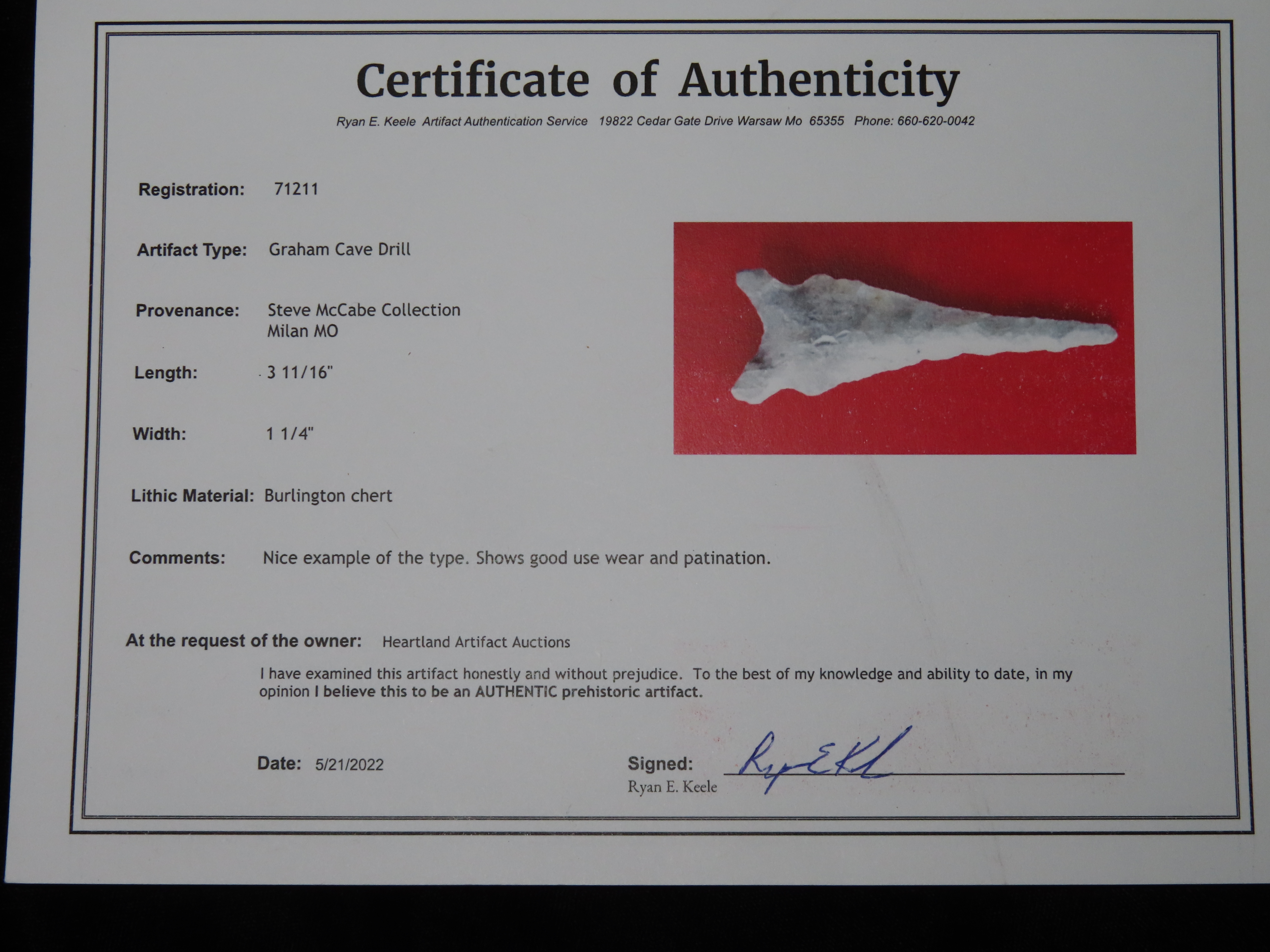 3.11/16″ Graham Cave, Keele COA, Drill Form, Ex McCabe, Sullivan Co MO
