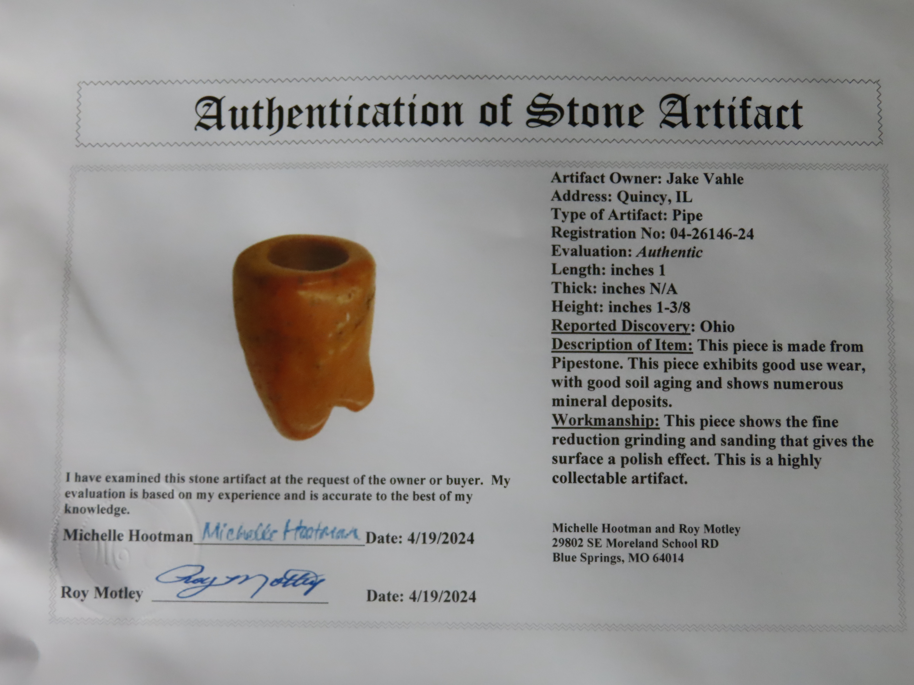 1″ Pipestone Pipe, Motley COA, found in Ohio
