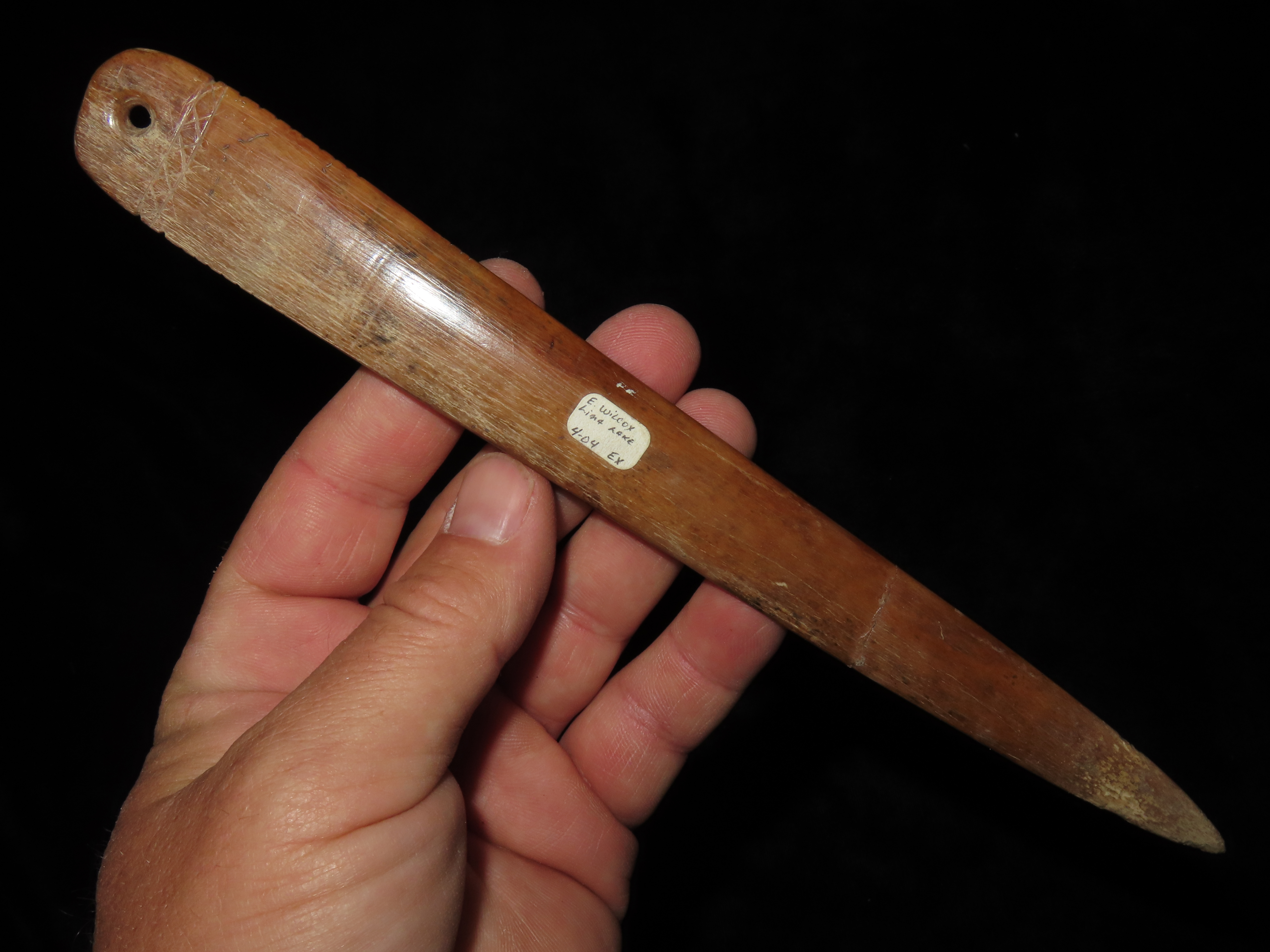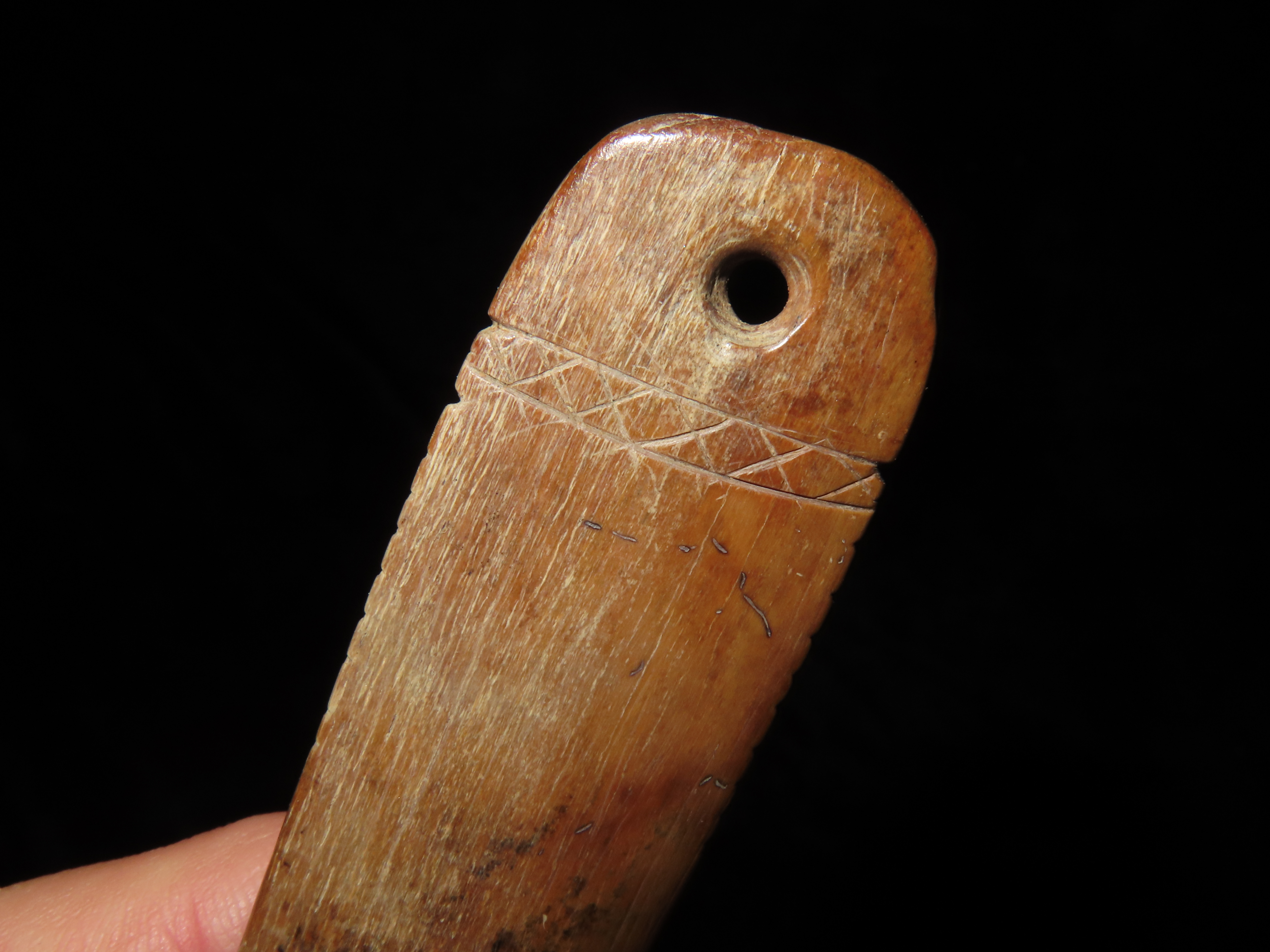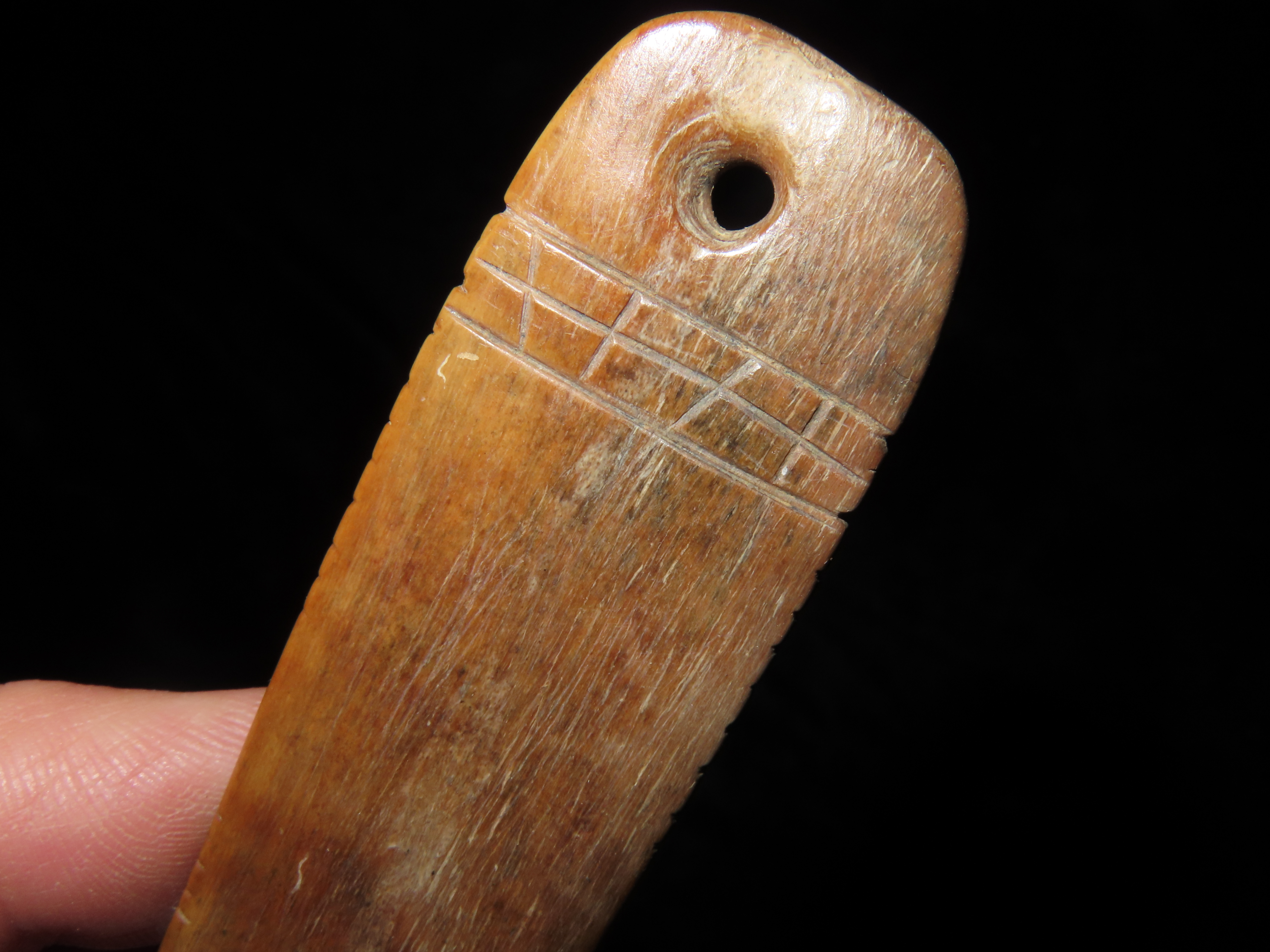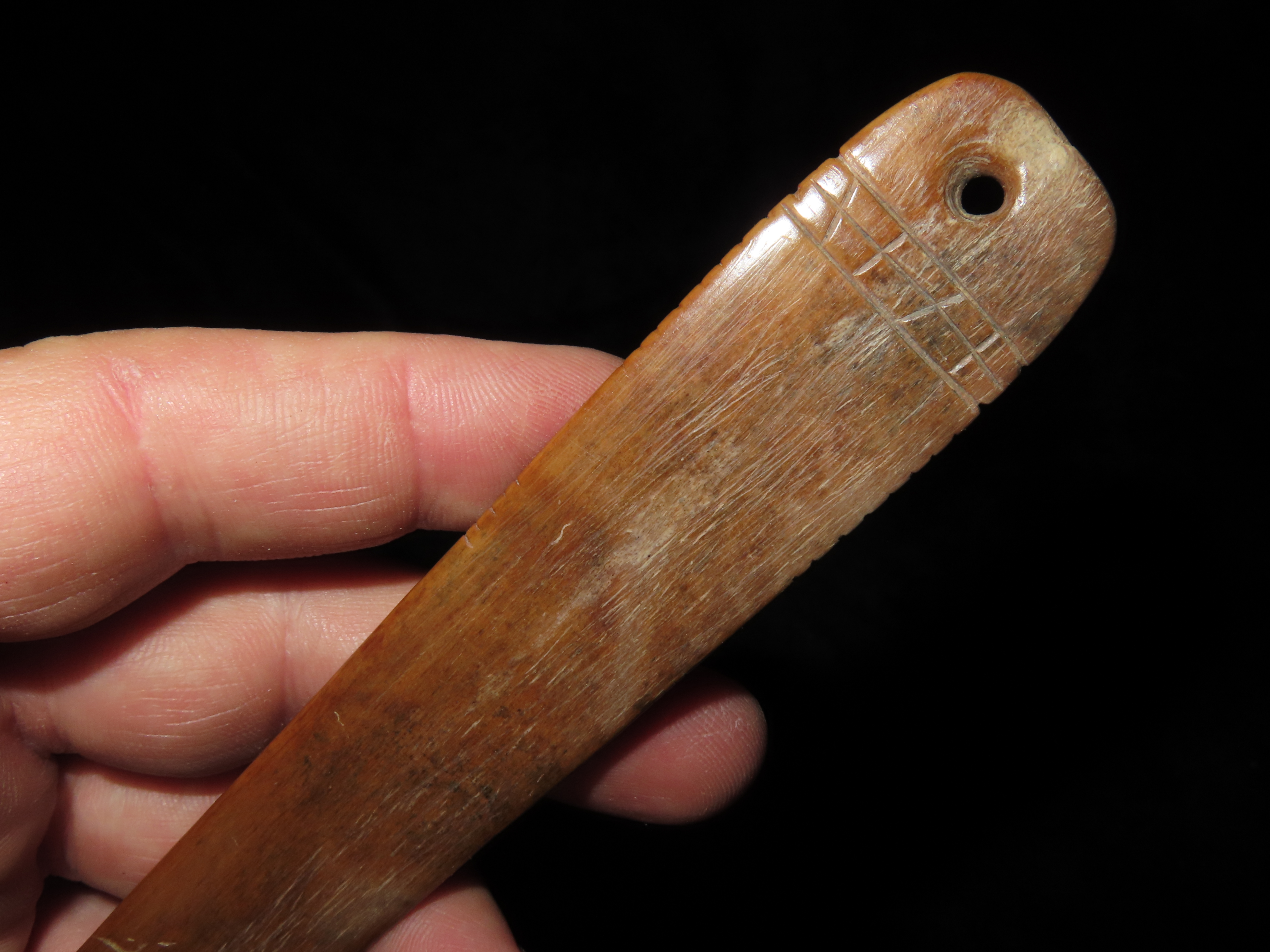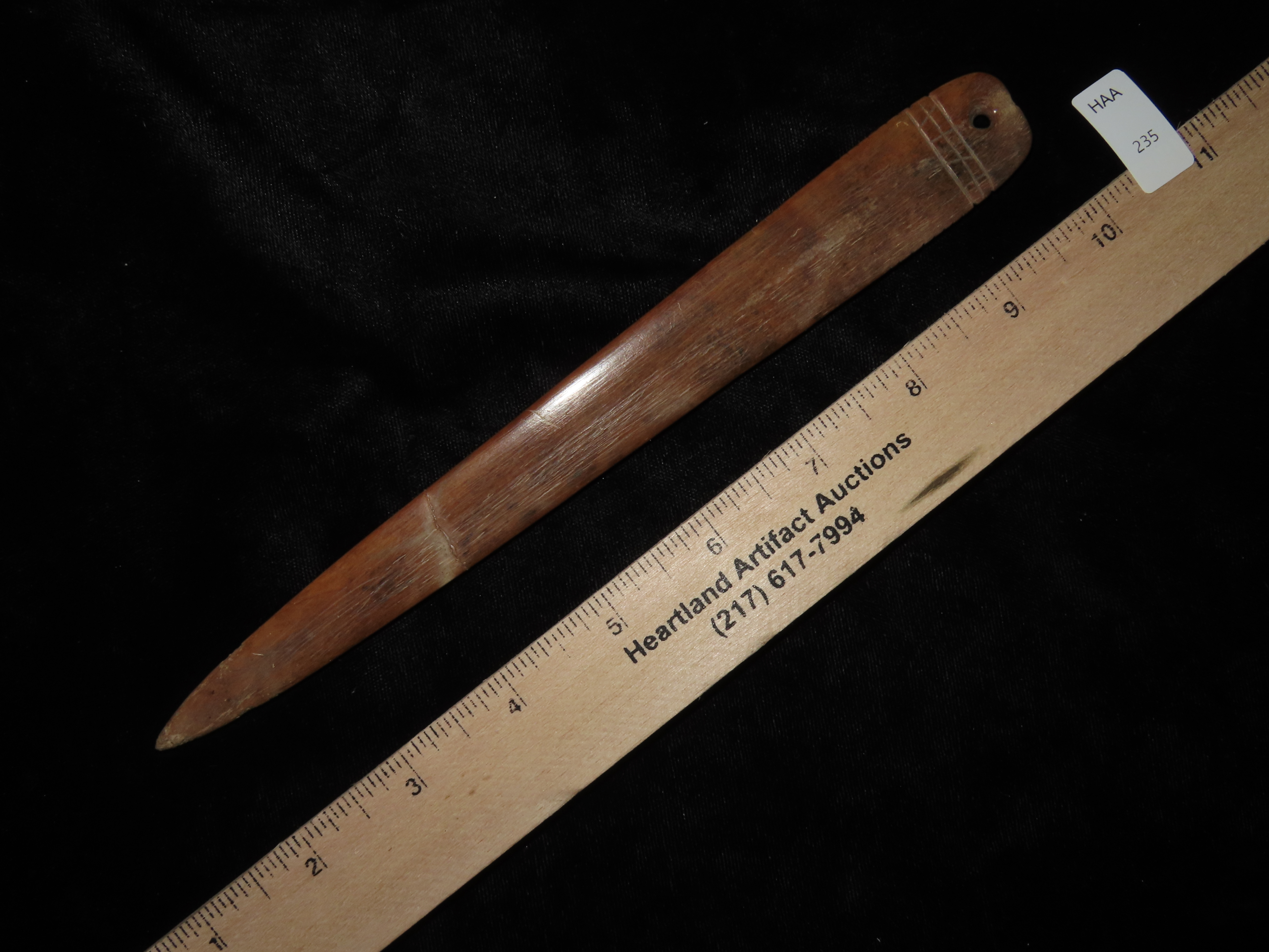 ICONIC LOCAL RELIC, 8.11/16″ Ceremonial Bone Hair Pin found by Eddie Wilcox in Lima Lake, Adams CO IL. This relic was one of Jake Vahle’s favorites. It was in the famous Dennis DeRosear Colleciton and laid on his shelf next to various artifacts for 16 years before Jake purchased it. Eddie found it while walking drainage ditches in April 2004. It was found in 2 sections and glued back together. Highly decorated. Likely Hopewell. Highly Polished and muck bottom stained.