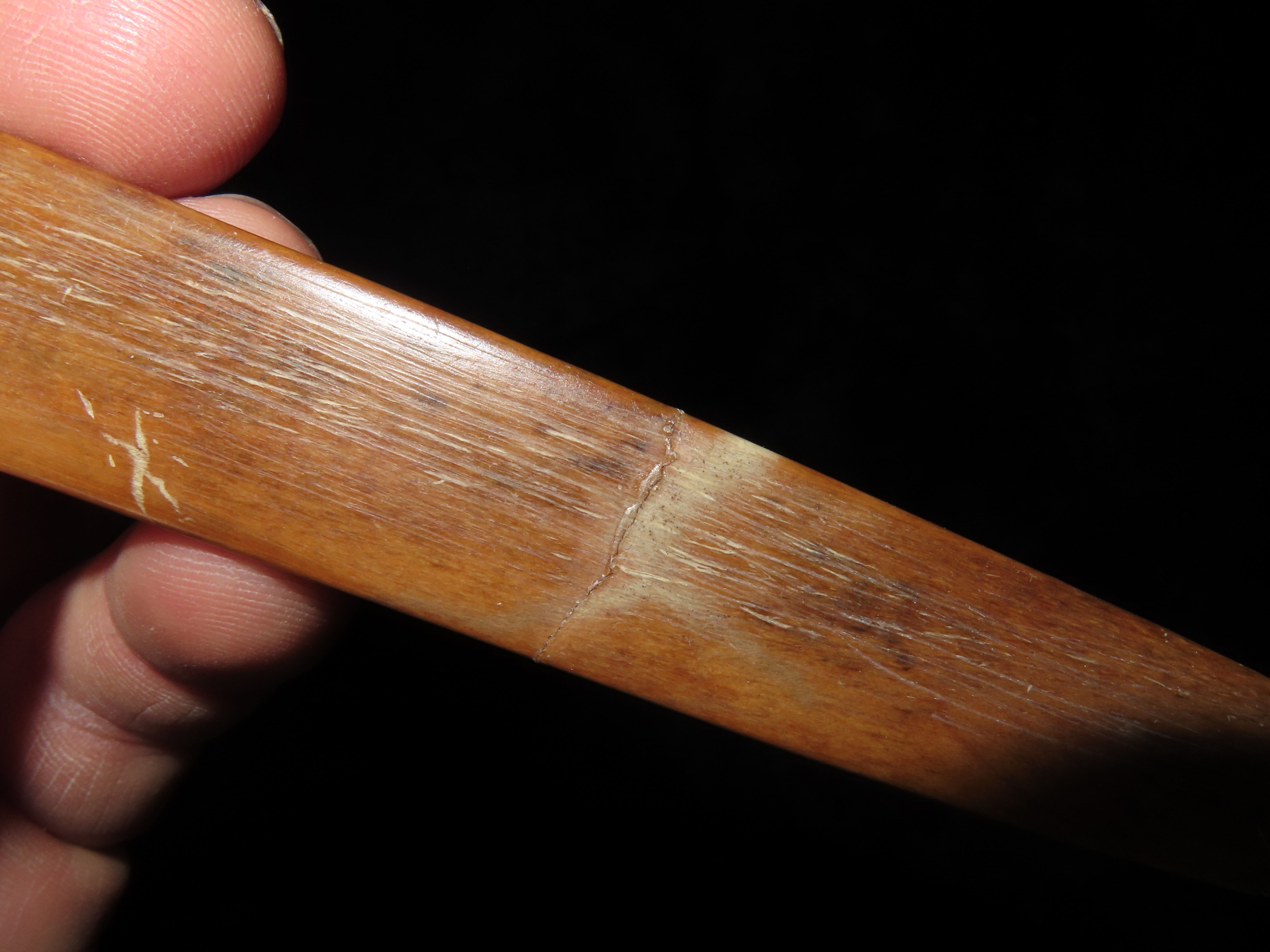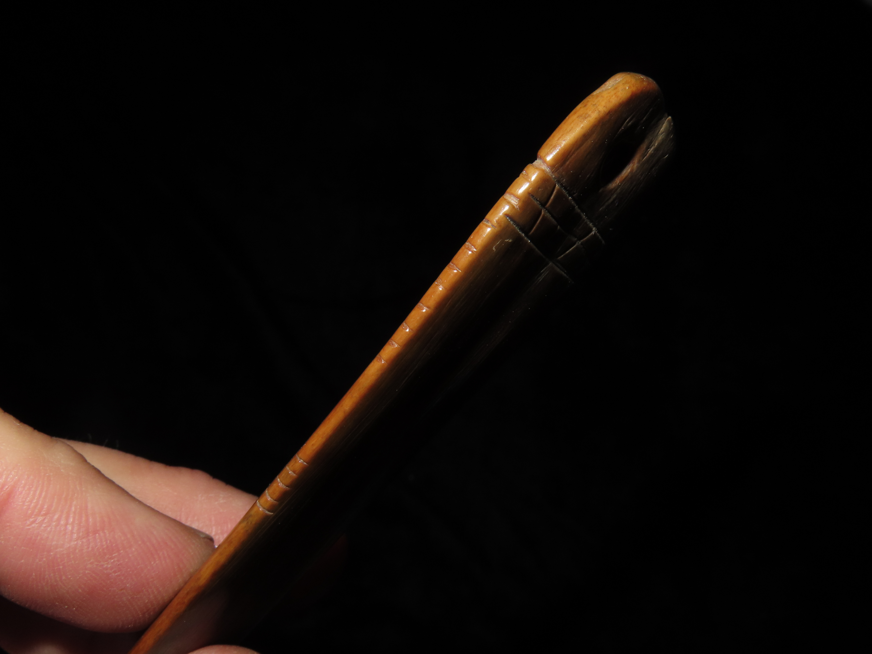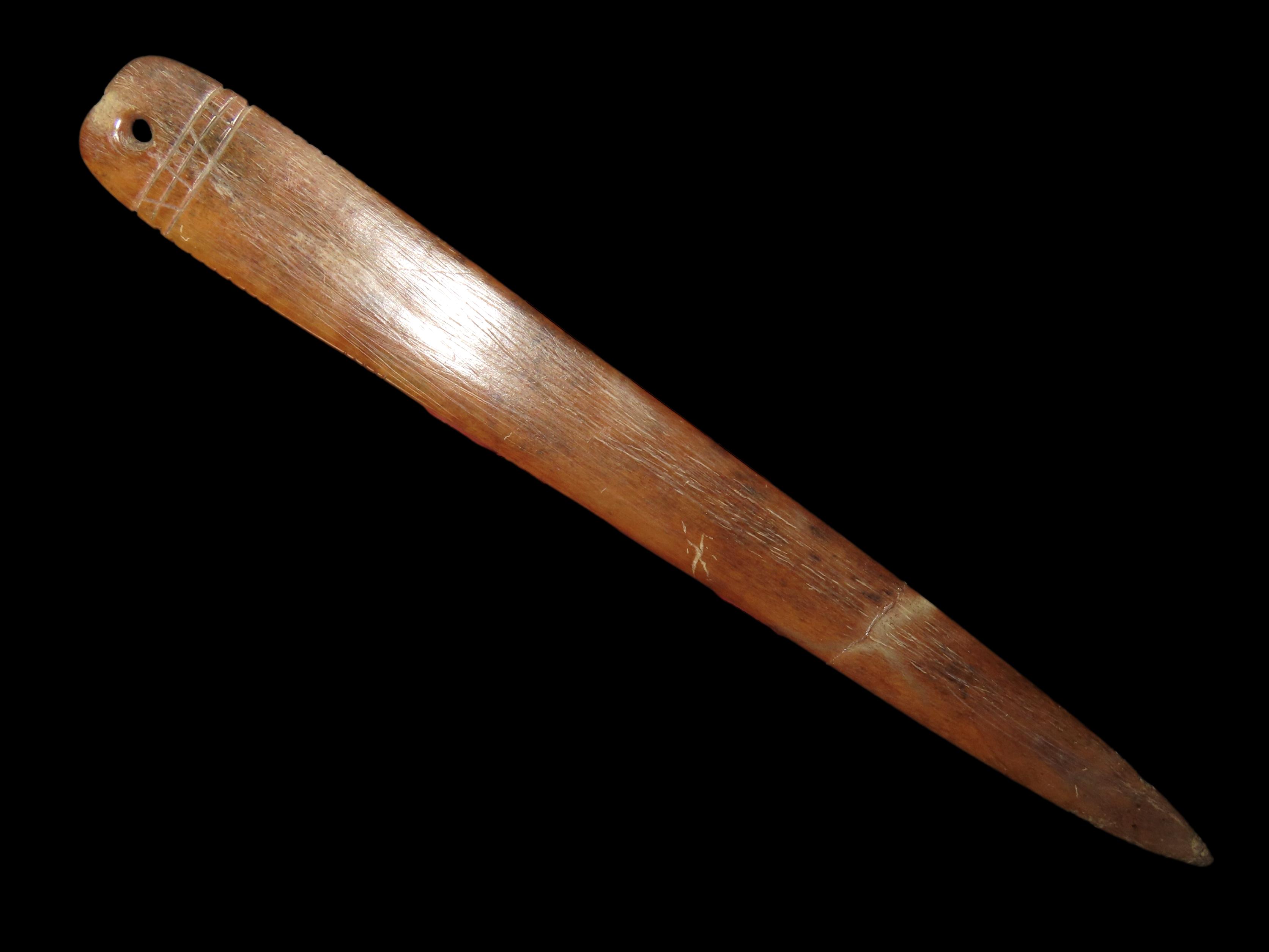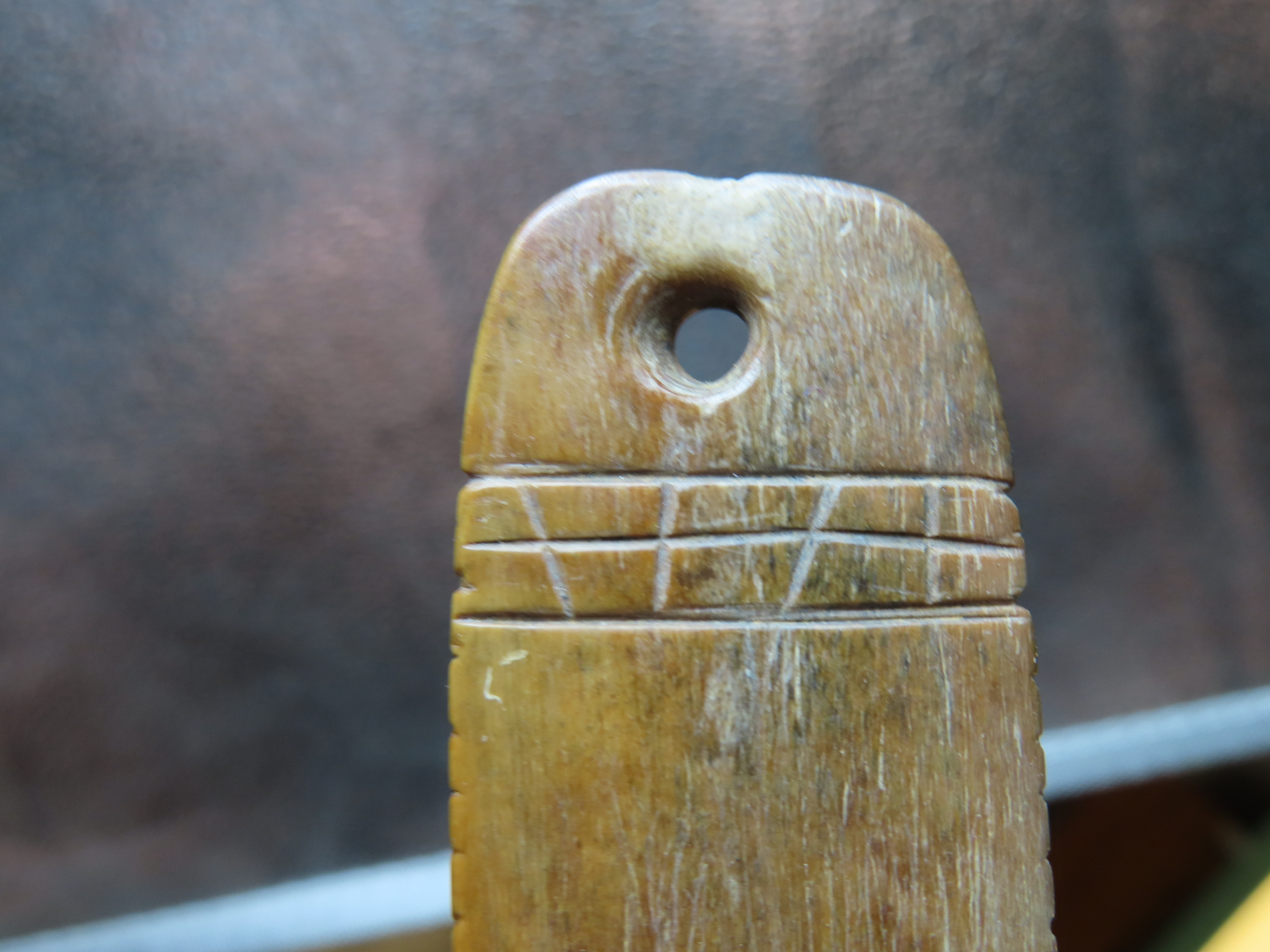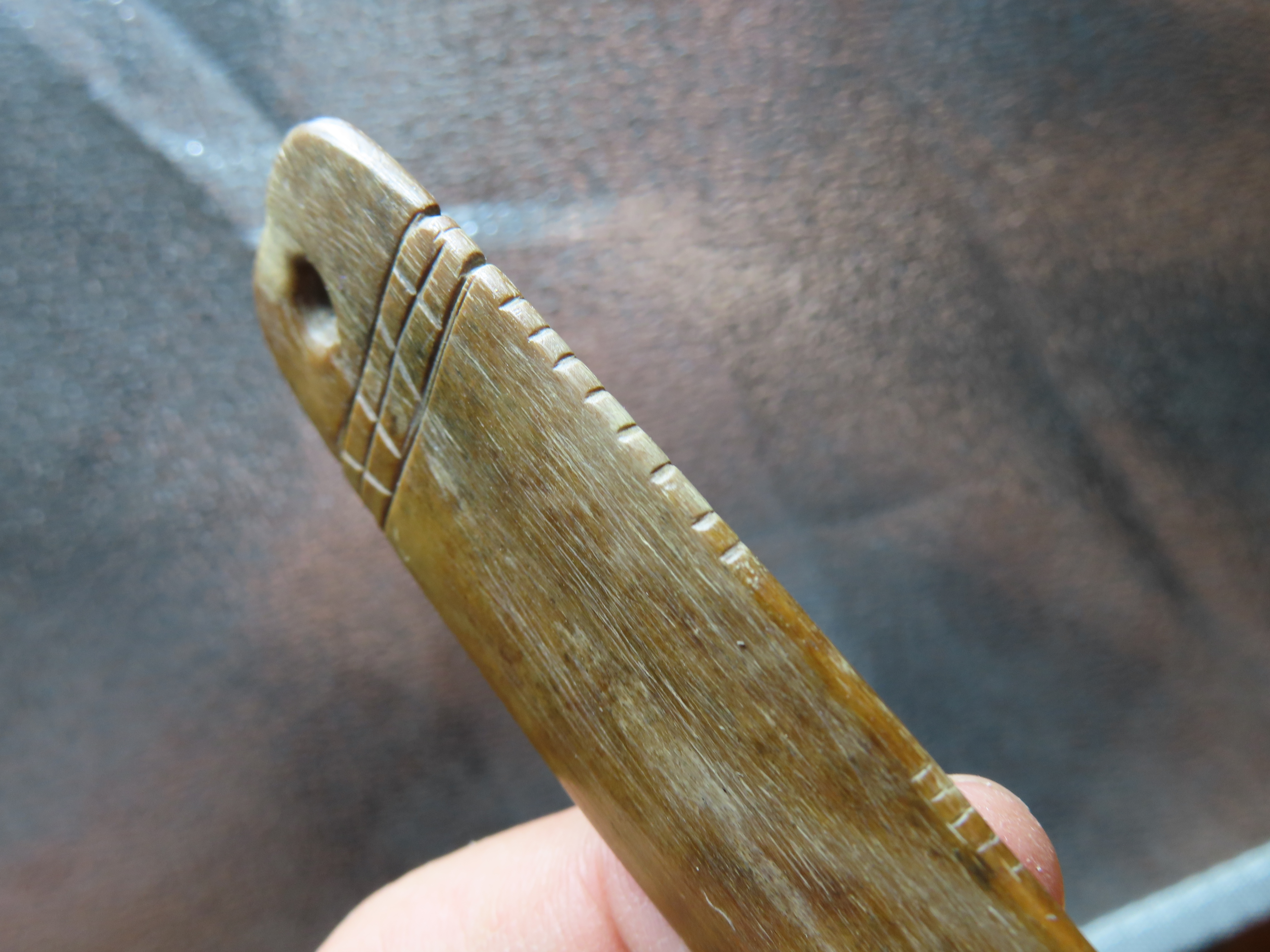 ICONIC LOCAL RELIC, 8.11/16″ Ceremonial Bone Hair Pin found by Eddie Wilcox in Lima Lake, Adams CO IL. This relic was one of Jake Vahle’s favorites. It was in the famous Dennis DeRosear Colleciton and laid on his shelf next to various artifacts for 16 years before Jake purchased it. Eddie found it while walking drainage ditches in April 2004. It was found in 2 sections and glued back together. Highly decorated. Likely Hopewell. Highly Polished and muck bottom stained.