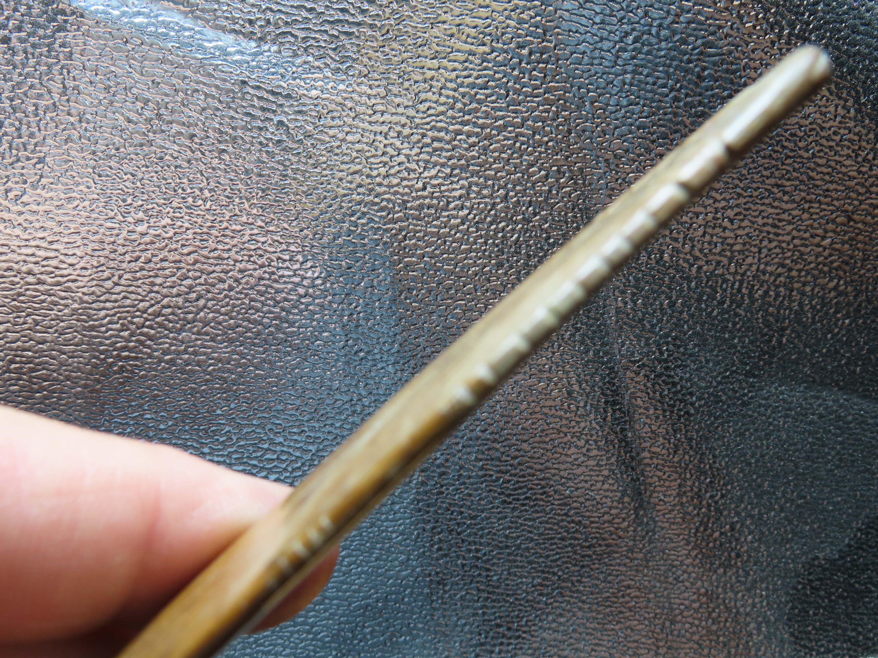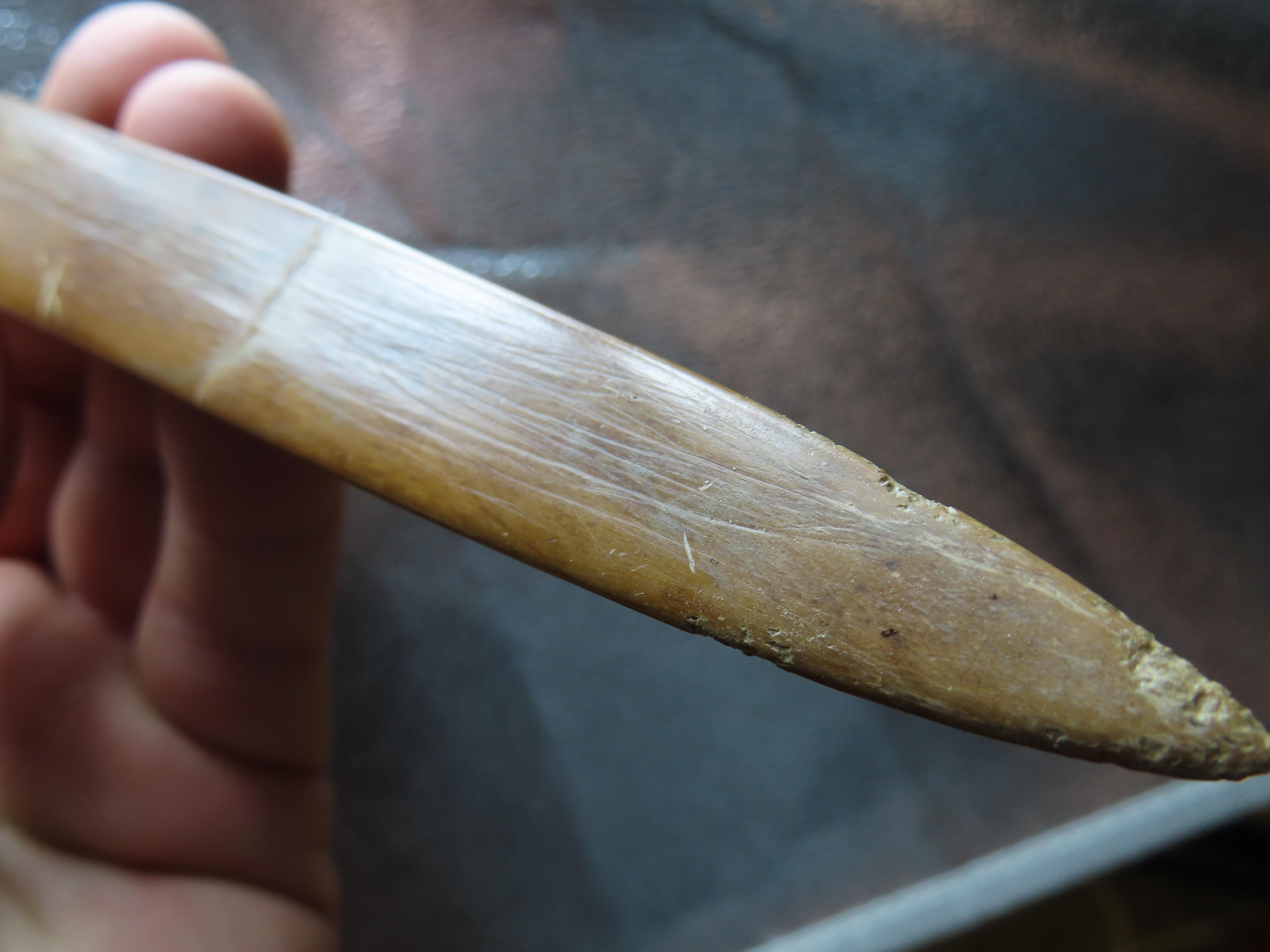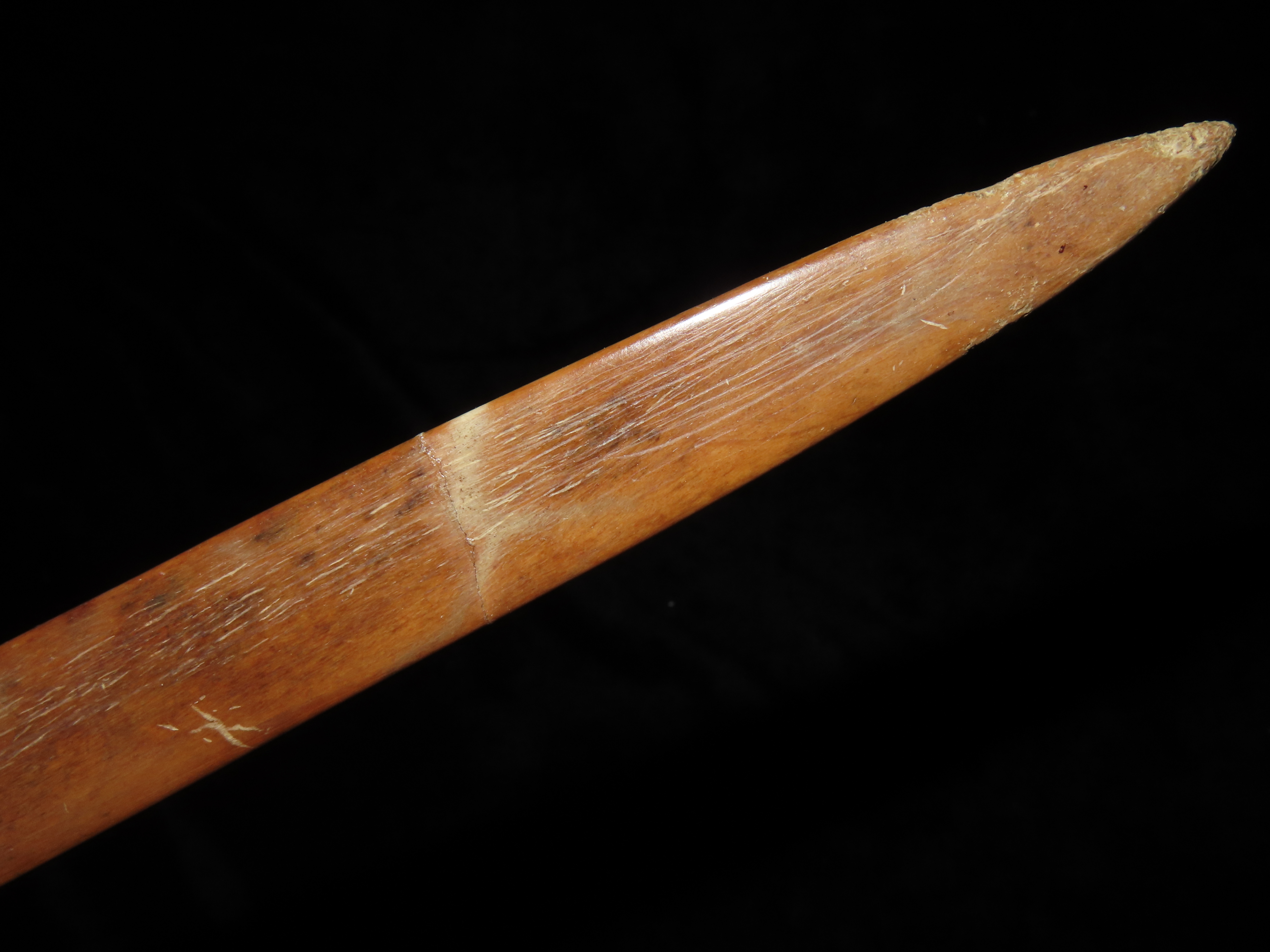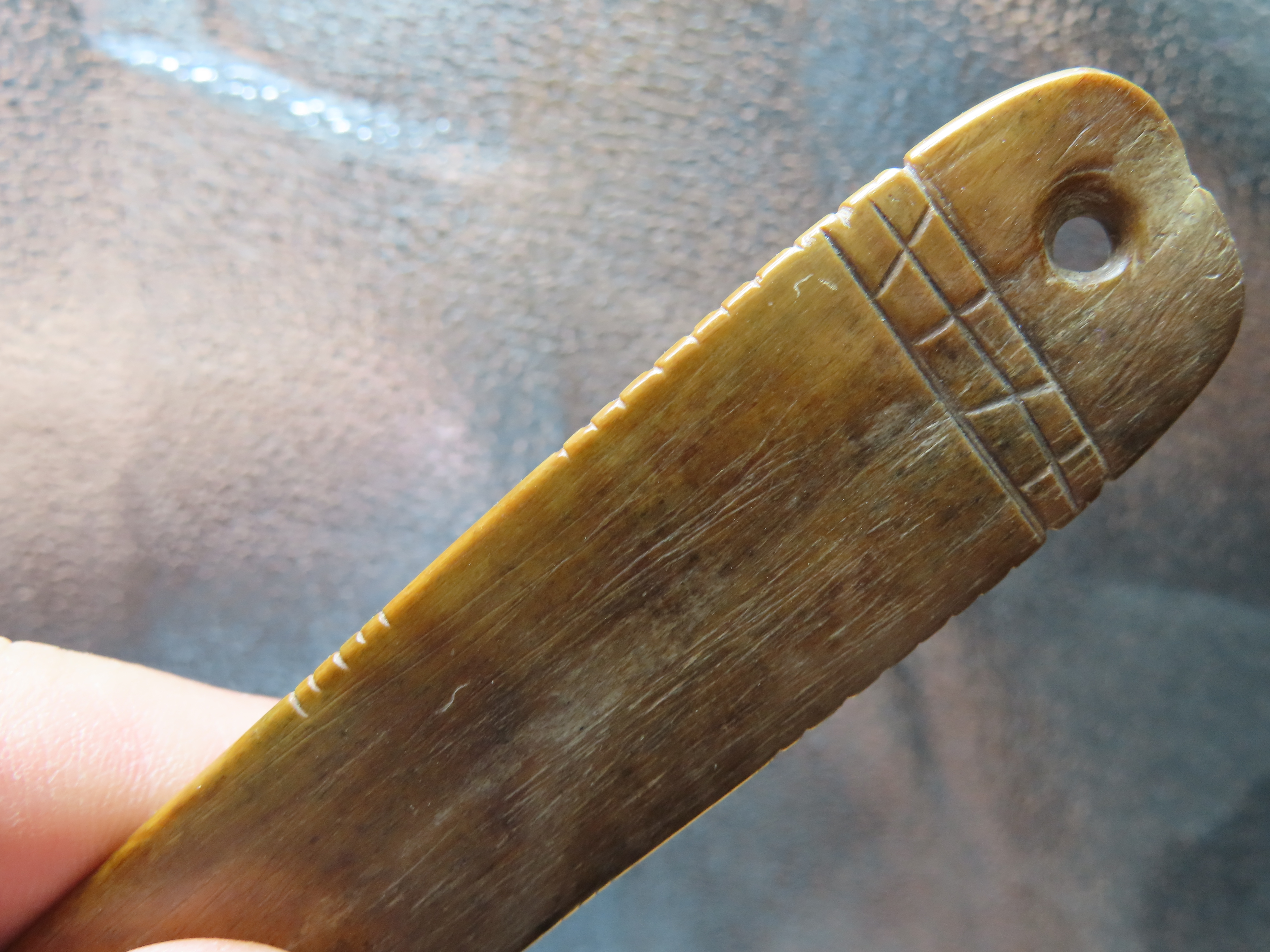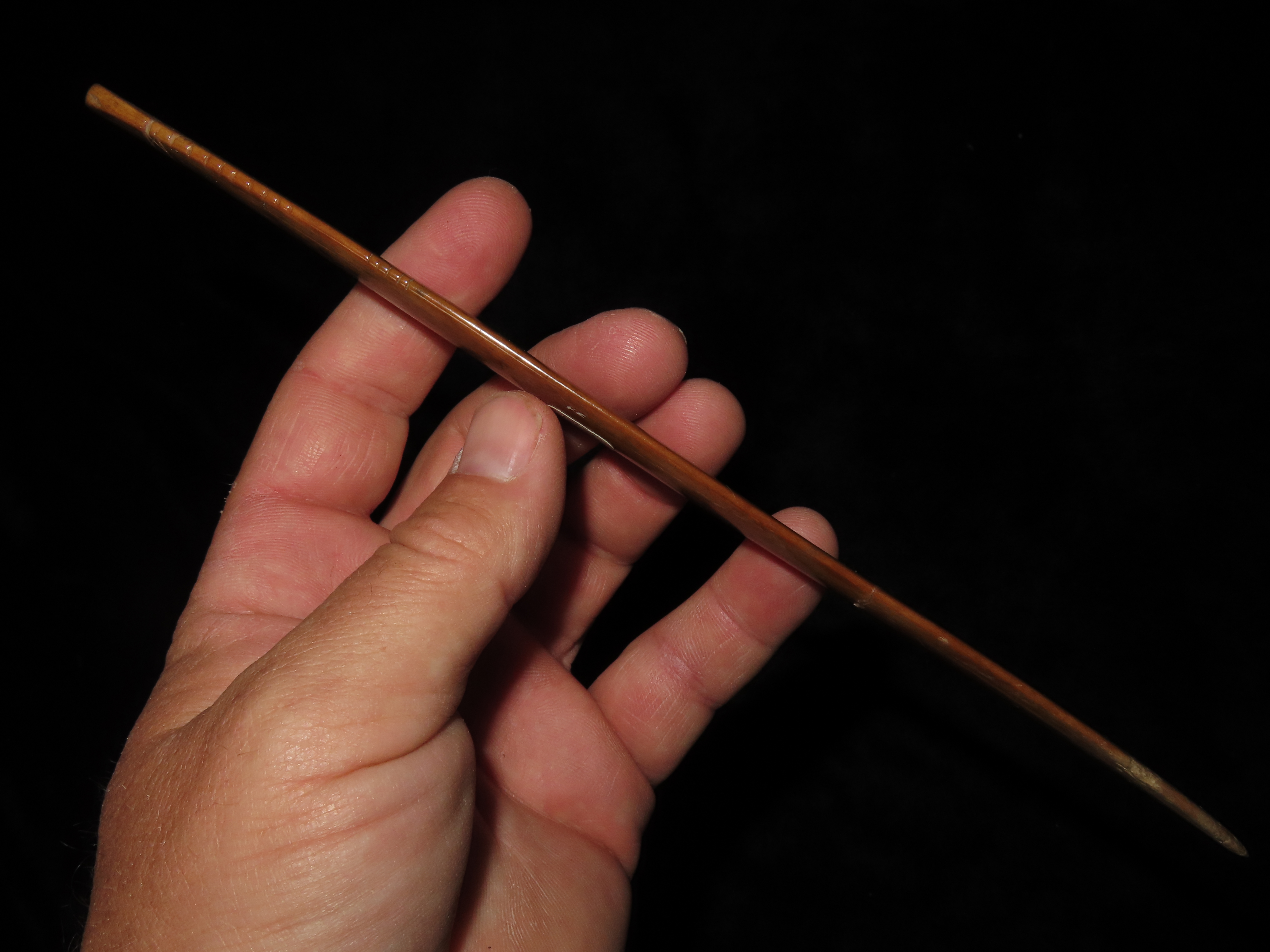 ICONIC LOCAL RELIC, 8.11/16″ Ceremonial Bone Hair Pin found by Eddie Wilcox in Lima Lake, Adams CO IL. This relic was one of Jake Vahle’s favorites. It was in the famous Dennis DeRosear Colleciton and laid on his shelf next to various artifacts for 16 years before Jake purchased it. Eddie found it while walking drainage ditches in April 2004. It was found in 2 sections and glued back together. Highly decorated. Likely Hopewell. Highly Polished and muck bottom stained.