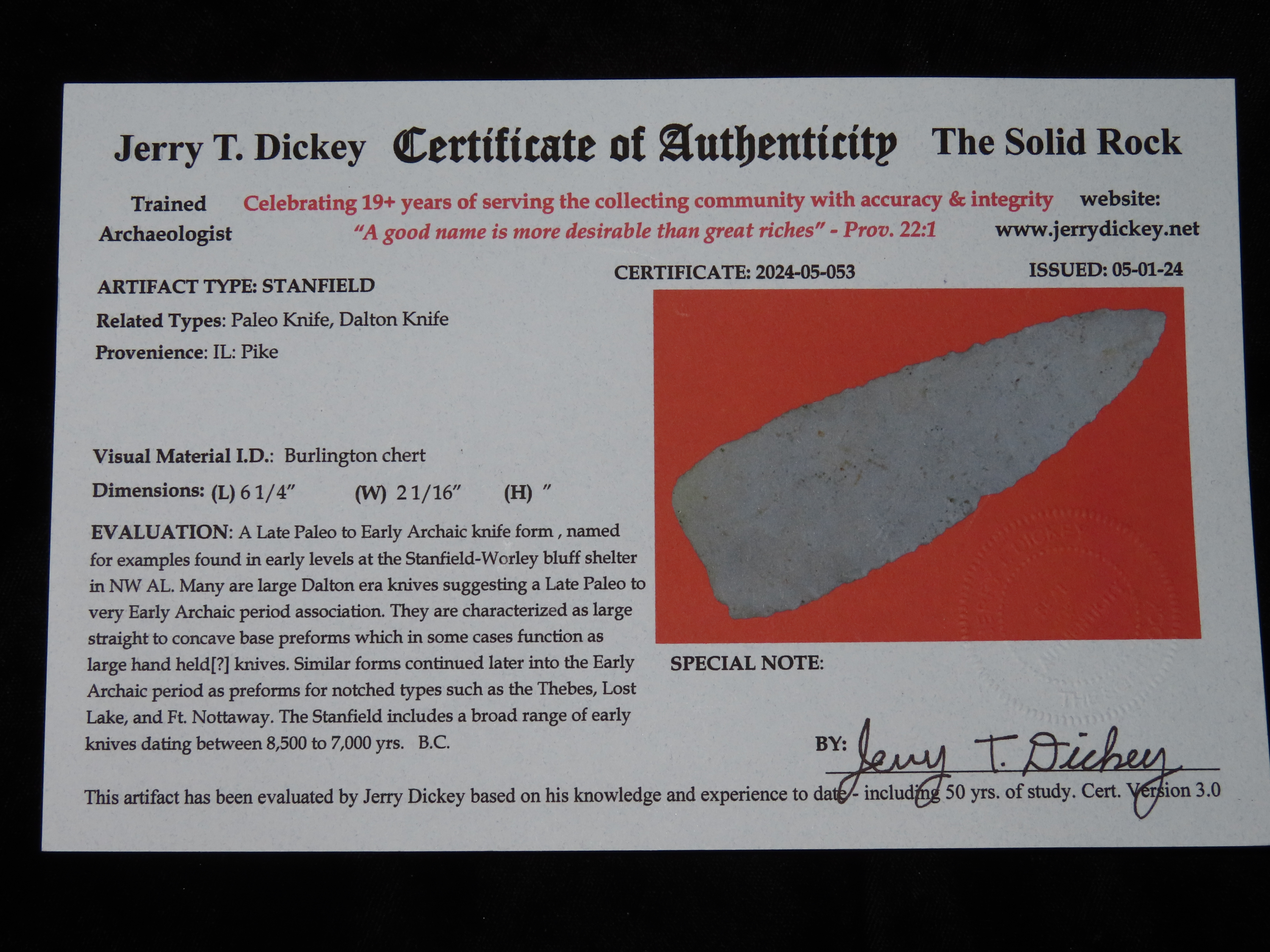 6.1/4″ Paleo Knife / Dalton Blade, Dickey COA, Pike Co IL, Ex Tim Terwelp, Jake Vahle