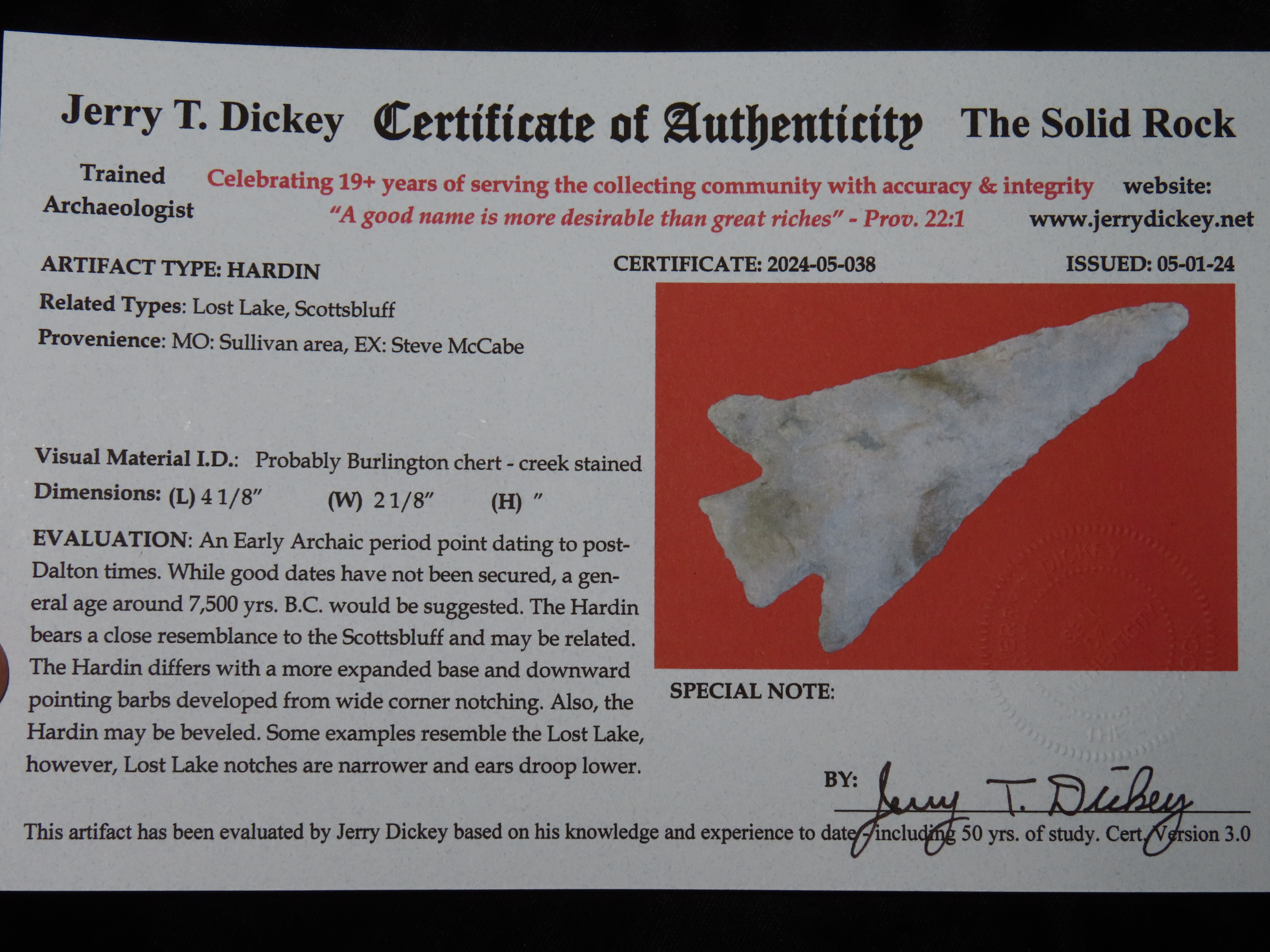 4.1/8″ Swept Wing Hardin, 2x COA, Dickey / Motley Ex McCabe, Sullivan Co MO