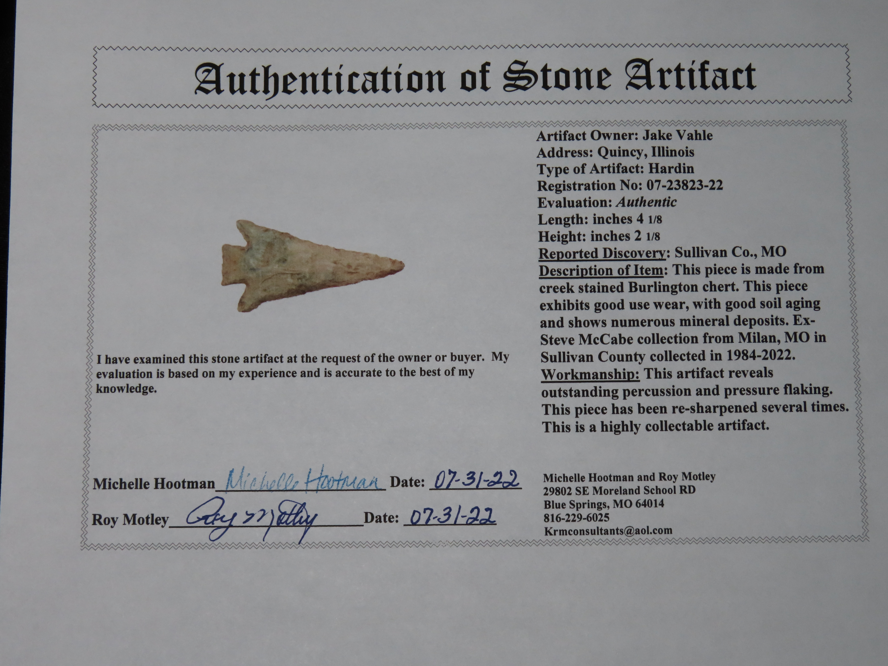 4.1/8" Swept Wing Hardin, 2x COA, Dickey / Motley Ex McCabe, Sullivan Co MO