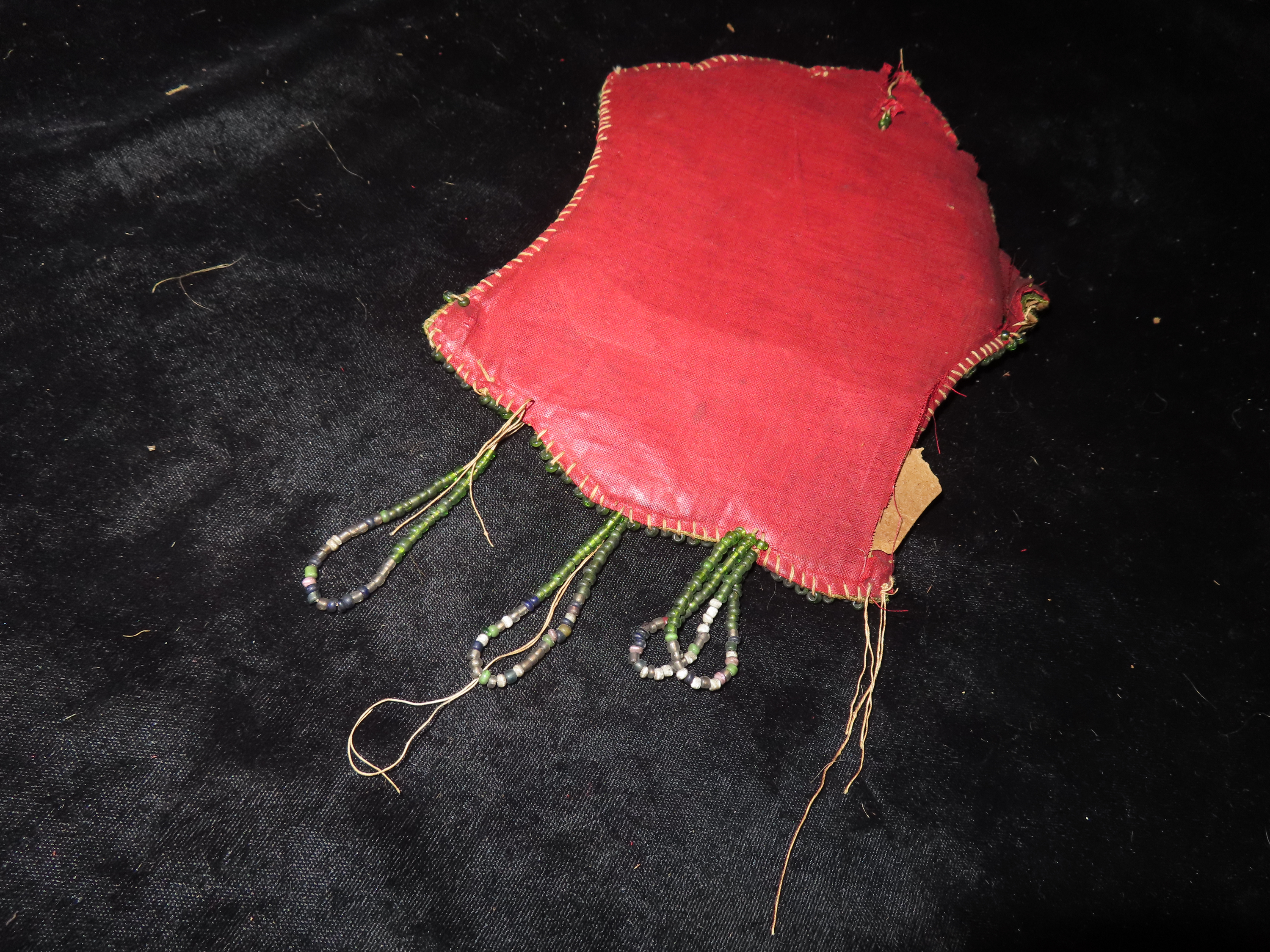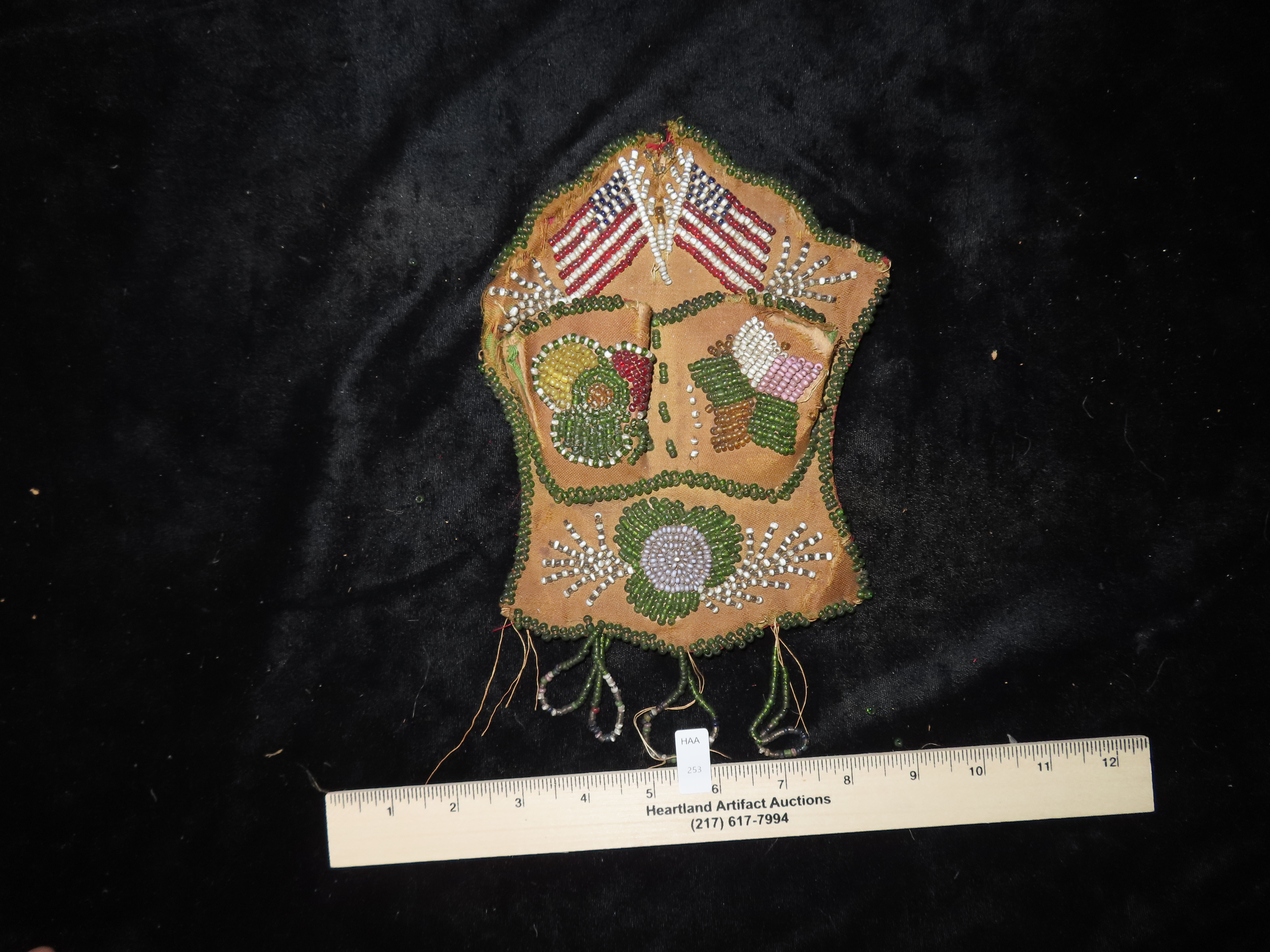 Native American Folk Art “Beaded Whimsie” Double Pocket Wall Hanging Match Holder, Late 19th Century, Vintage; Beadwork was a major source of income for the Mohawk, Tuscarora and Seneca of New York, who catered to the tourist clientele that flocked to Niagara Falls. The novelties or “whimsies” that they created, perfectly suited Victorian tastes and complemented late nineteenth century interior decorating schemes. Beaded pieces like the “FAST CANOE” and “BOX” suggest an element of humor in the dealings of Native Peoples with their non-Native buyers. Note the American Flags on this incredible piece of history!