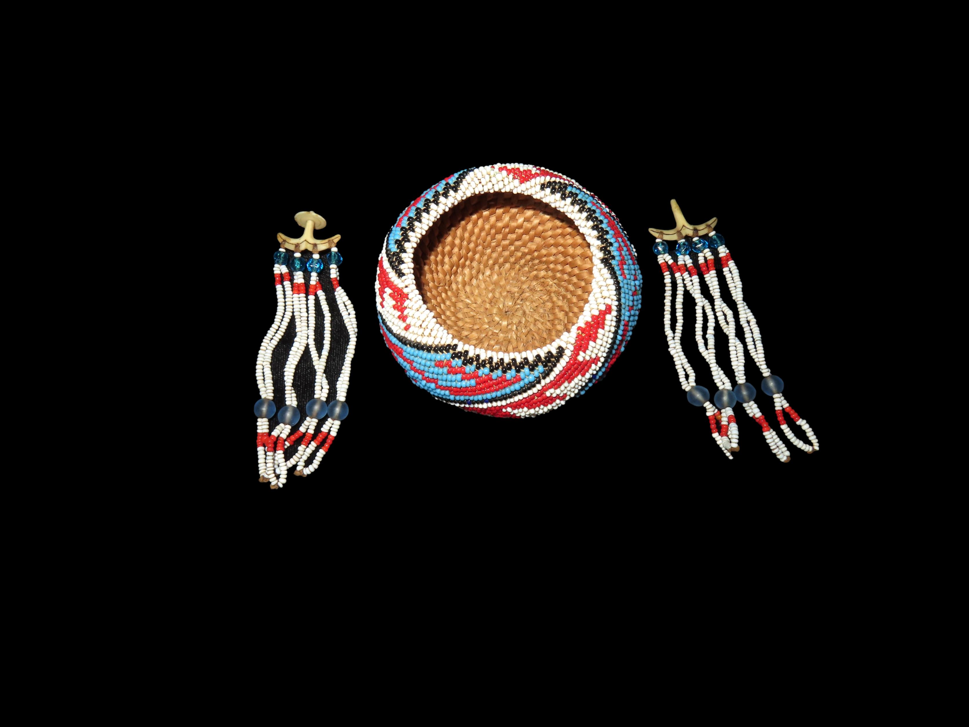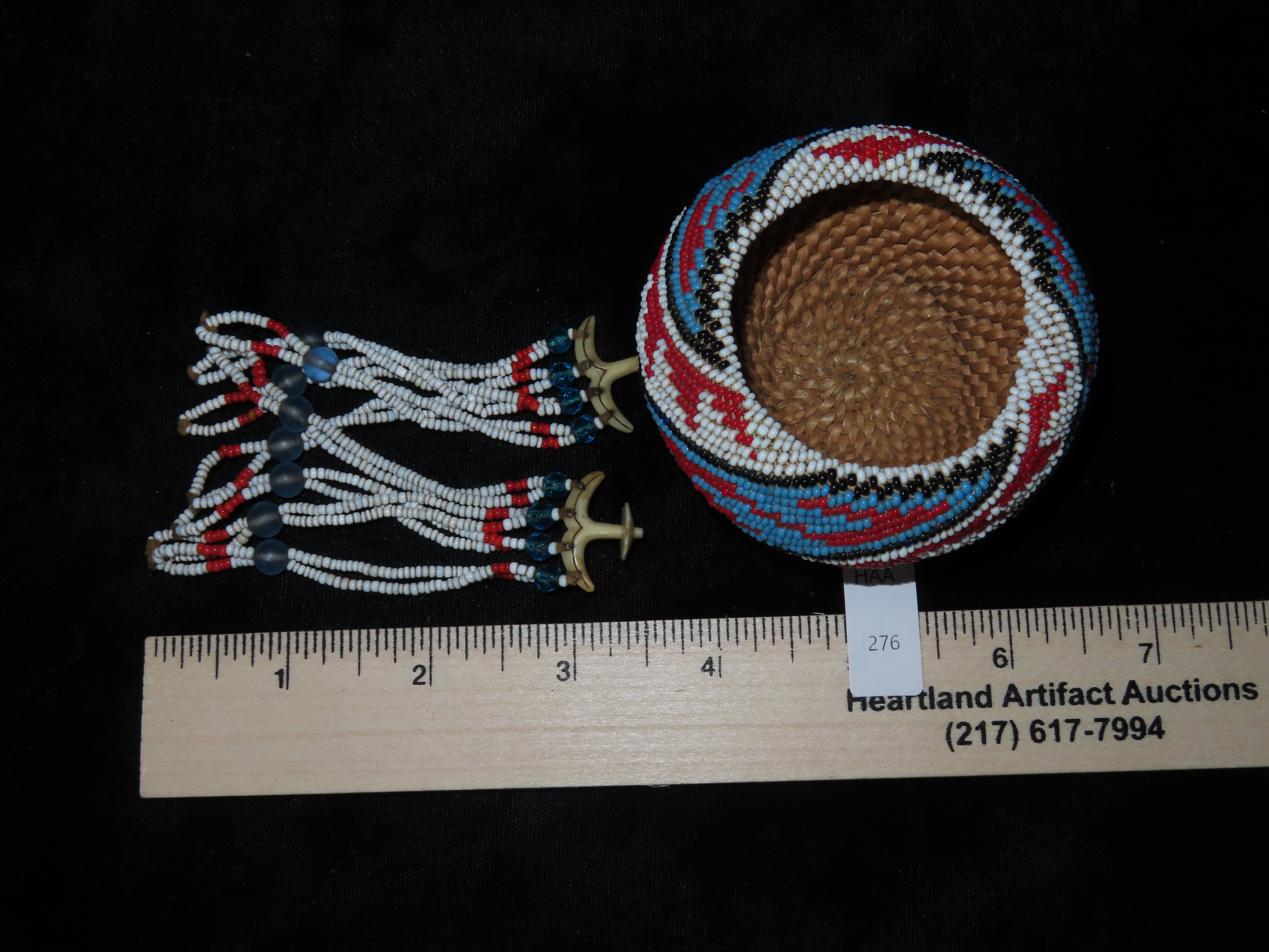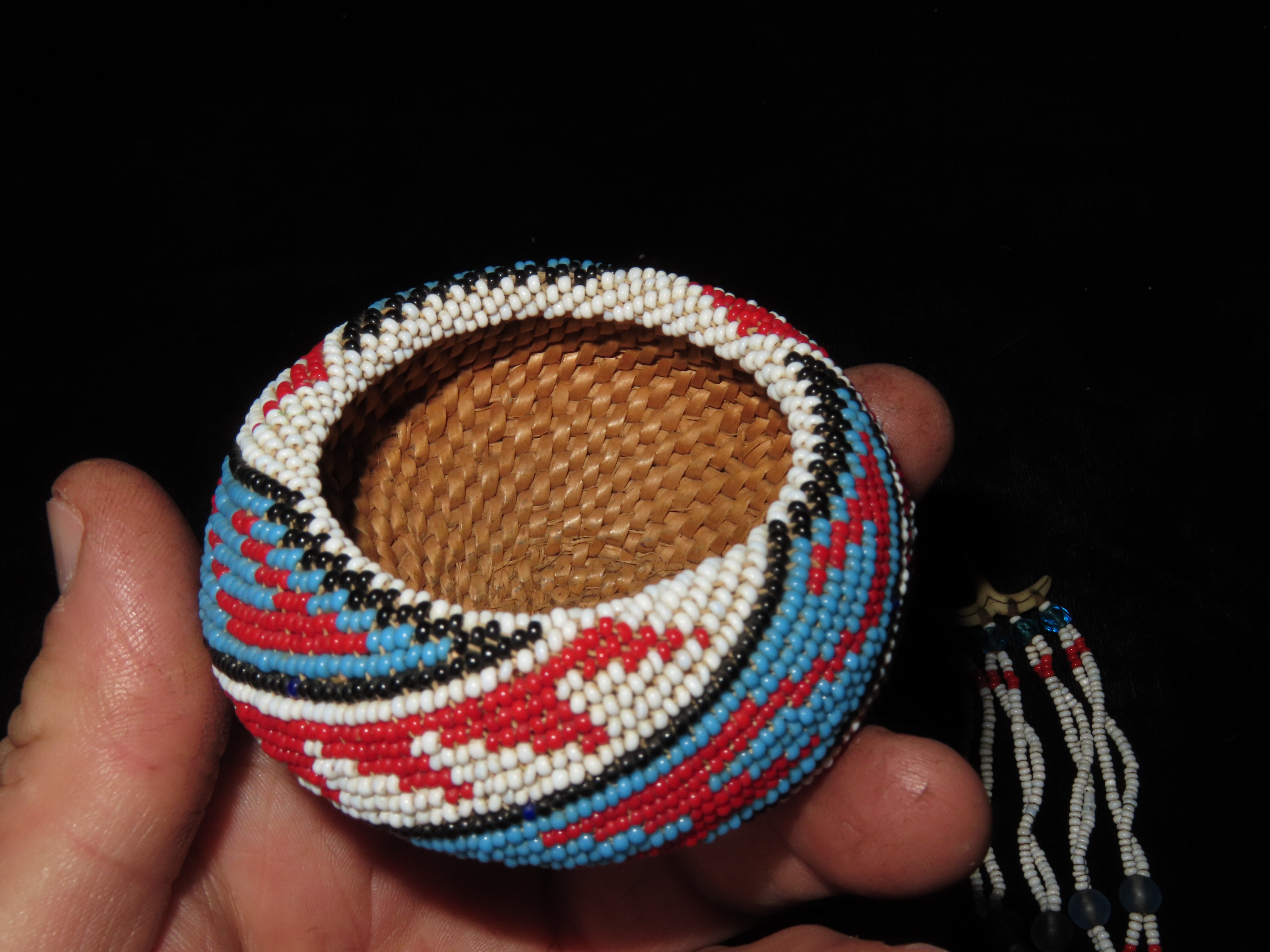 3″ x 2″ Paiute Beaded Bowl, with set of 2 Alaskan Origin Bead Labret Lip Plugs/Adornments; Labrets, or ornaments worn around or under the lips, have been a powerful marker of identity and social status in a number of parts of the world. In the Alaskan context, the style, size, and decoration of such labrets conveyed information about the wearer’s social and regional affiliation and identity. In some cases, people enlarged their lip piercings, and consequently their labrets, when they married or underwent other life rites of passage.