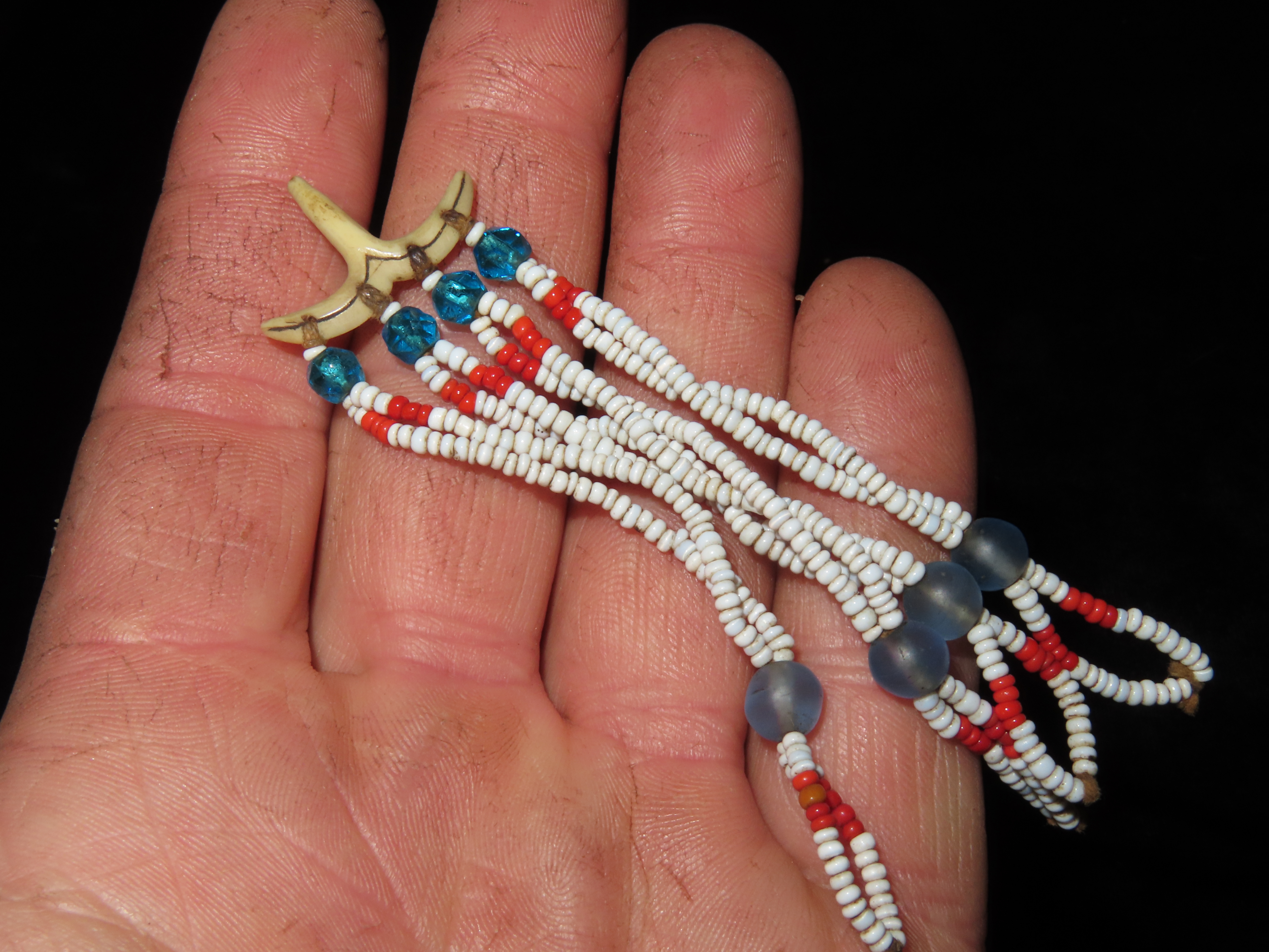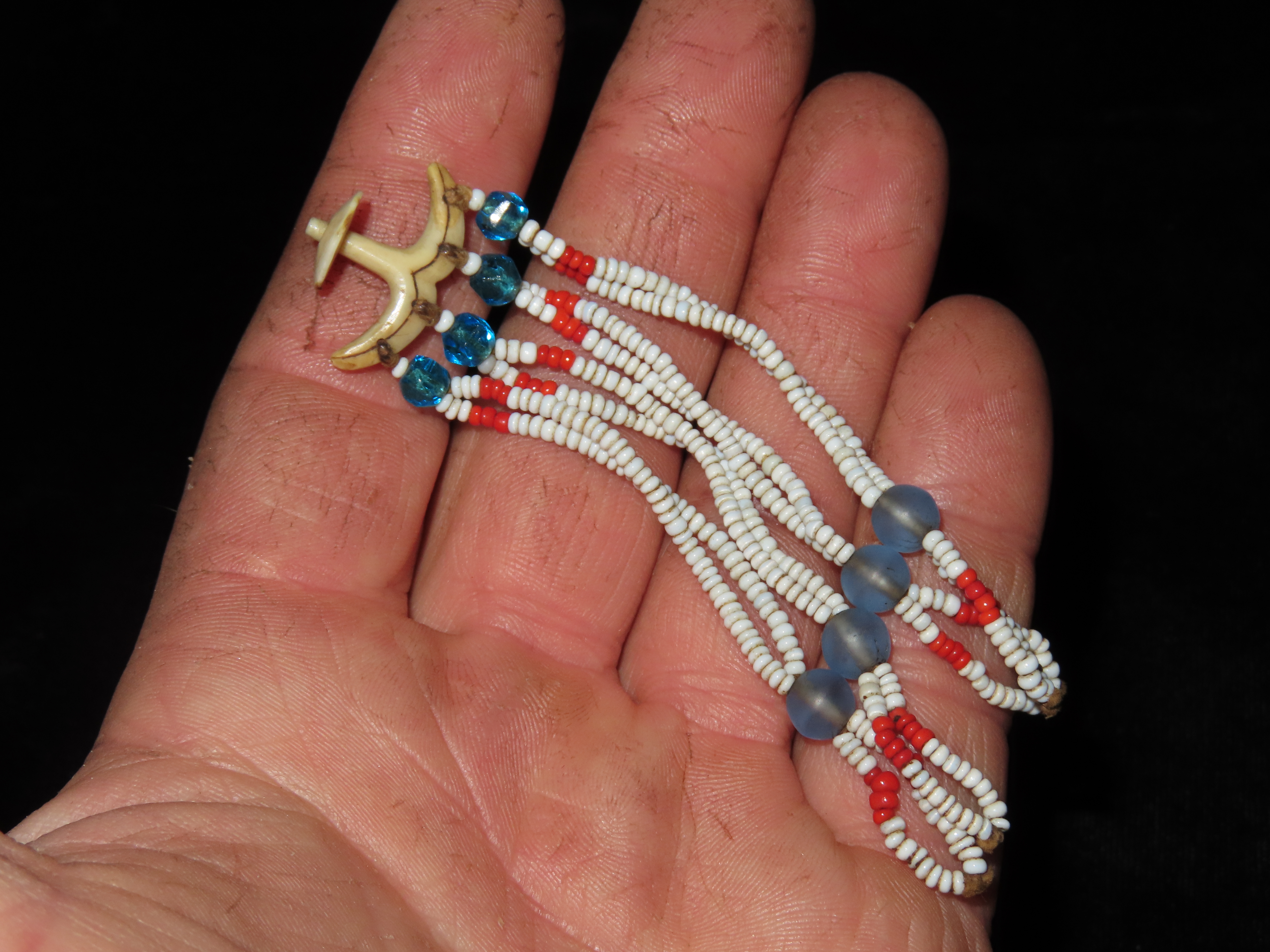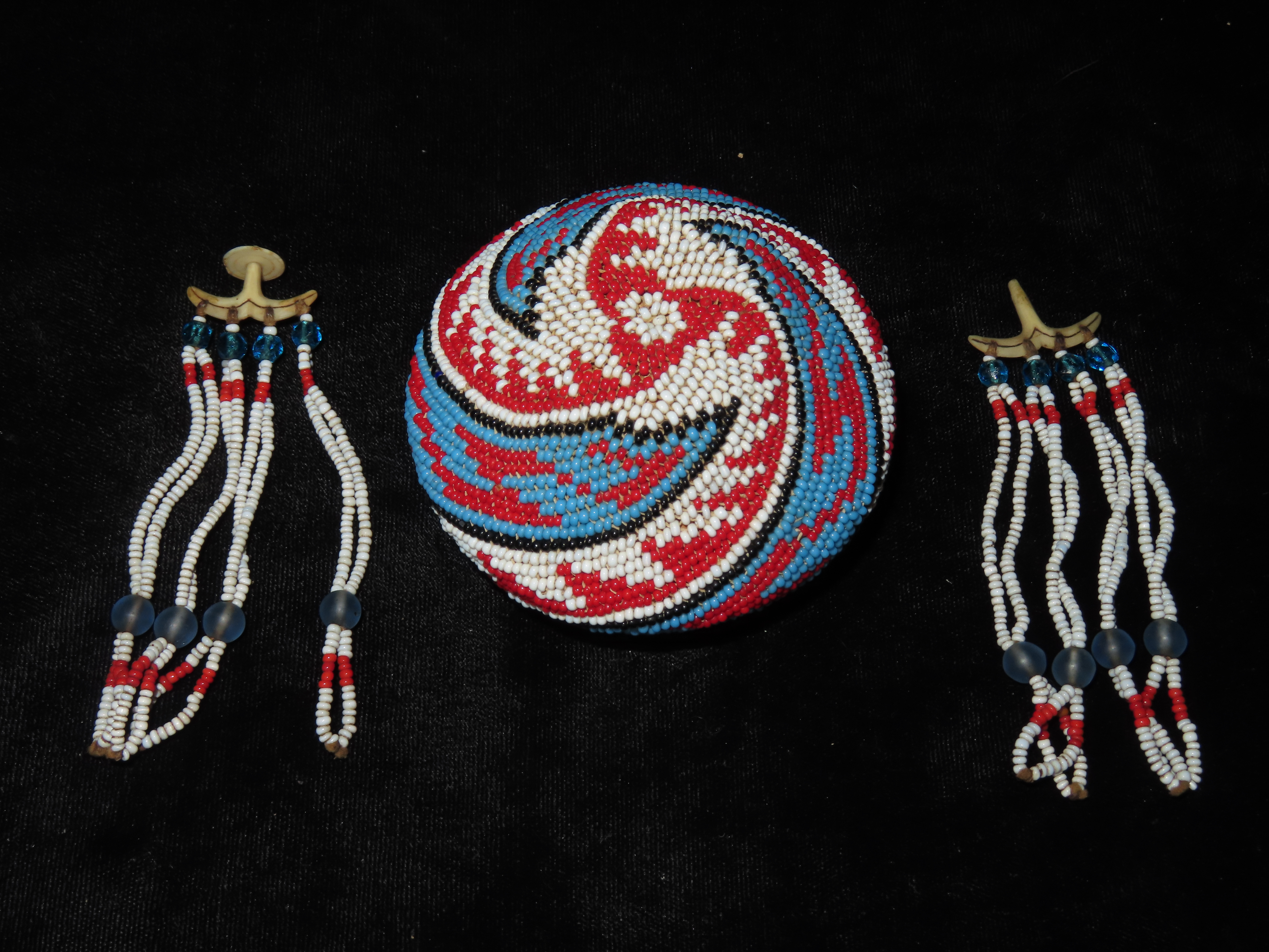 3″ x 2″ Paiute Beaded Bowl, with set of 2 Alaskan Origin Bead Labret Lip Plugs/Adornments; Labrets, or ornaments worn around or under the lips, have been a powerful marker of identity and social status in a number of parts of the world. In the Alaskan context, the style, size, and decoration of such labrets conveyed information about the wearer’s social and regional affiliation and identity. In some cases, people enlarged their lip piercings, and consequently their labrets, when they married or underwent other life rites of passage.