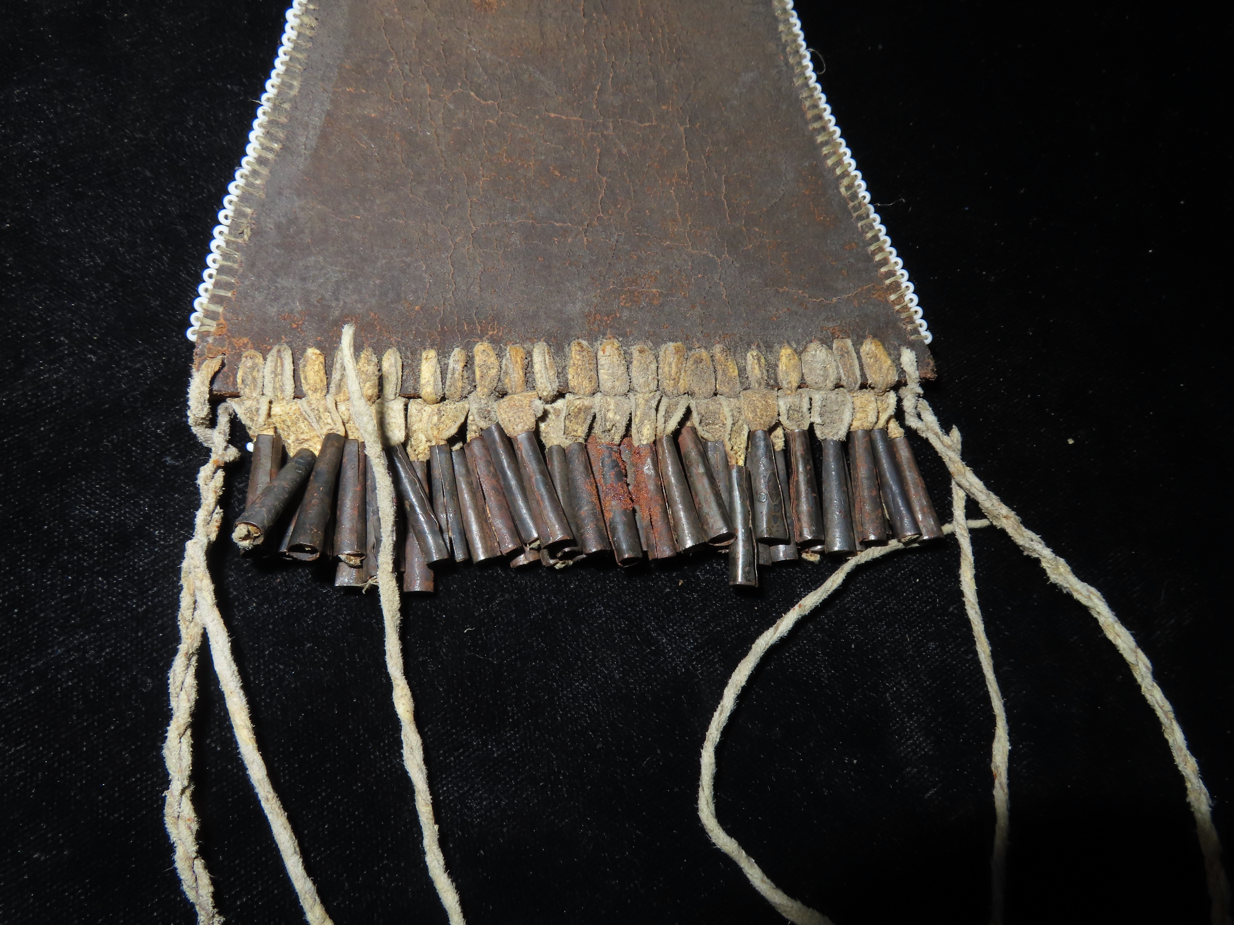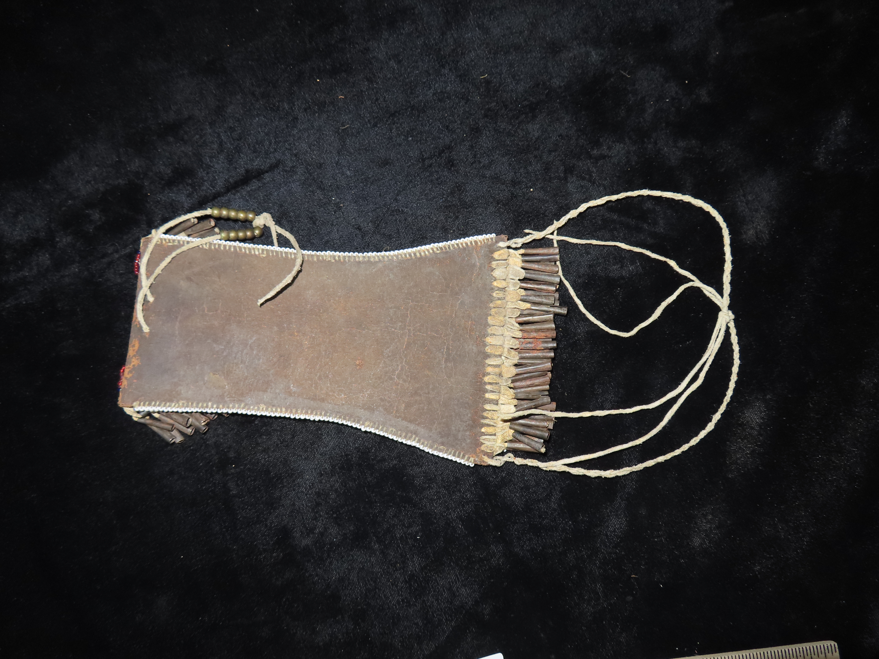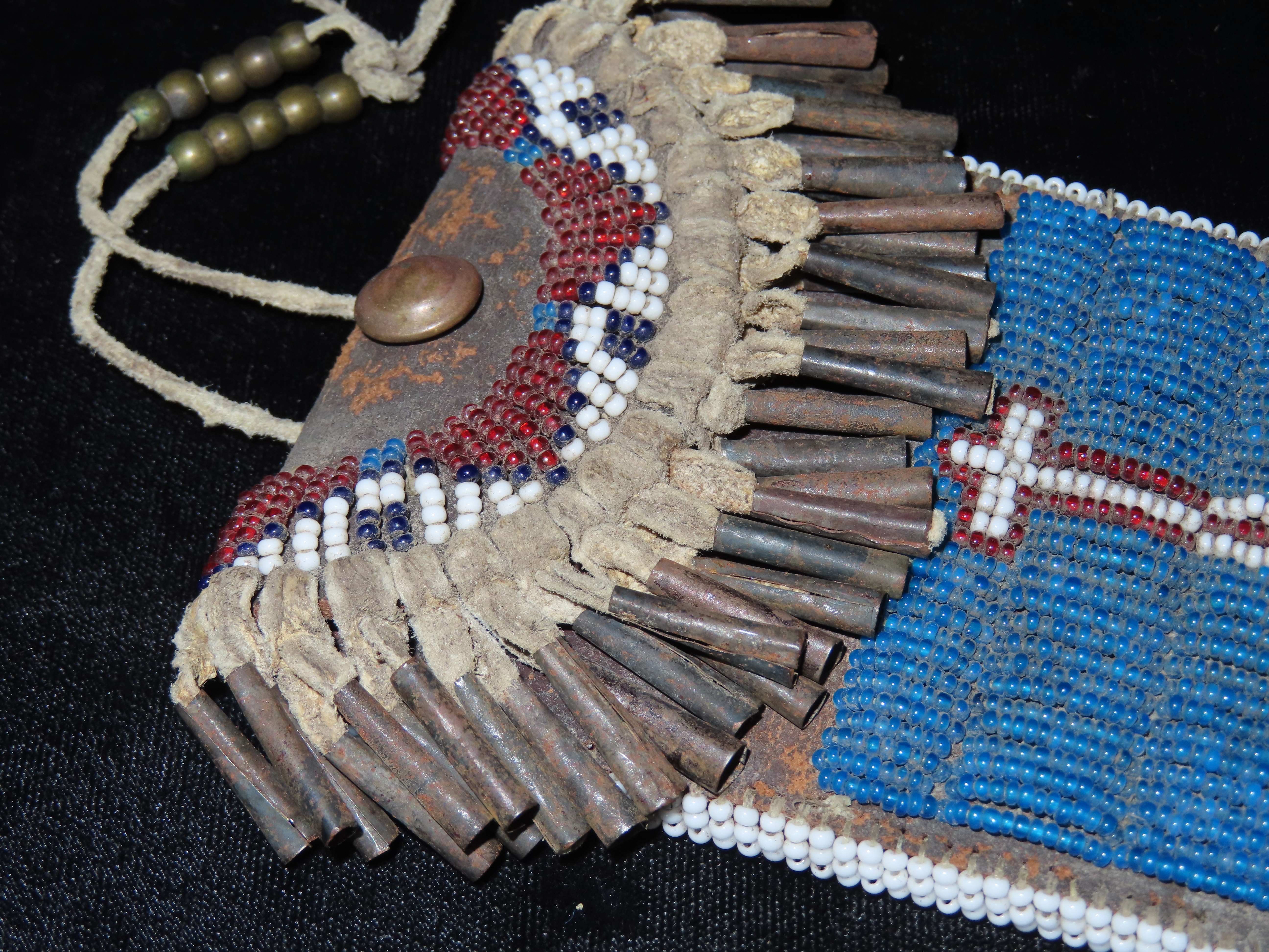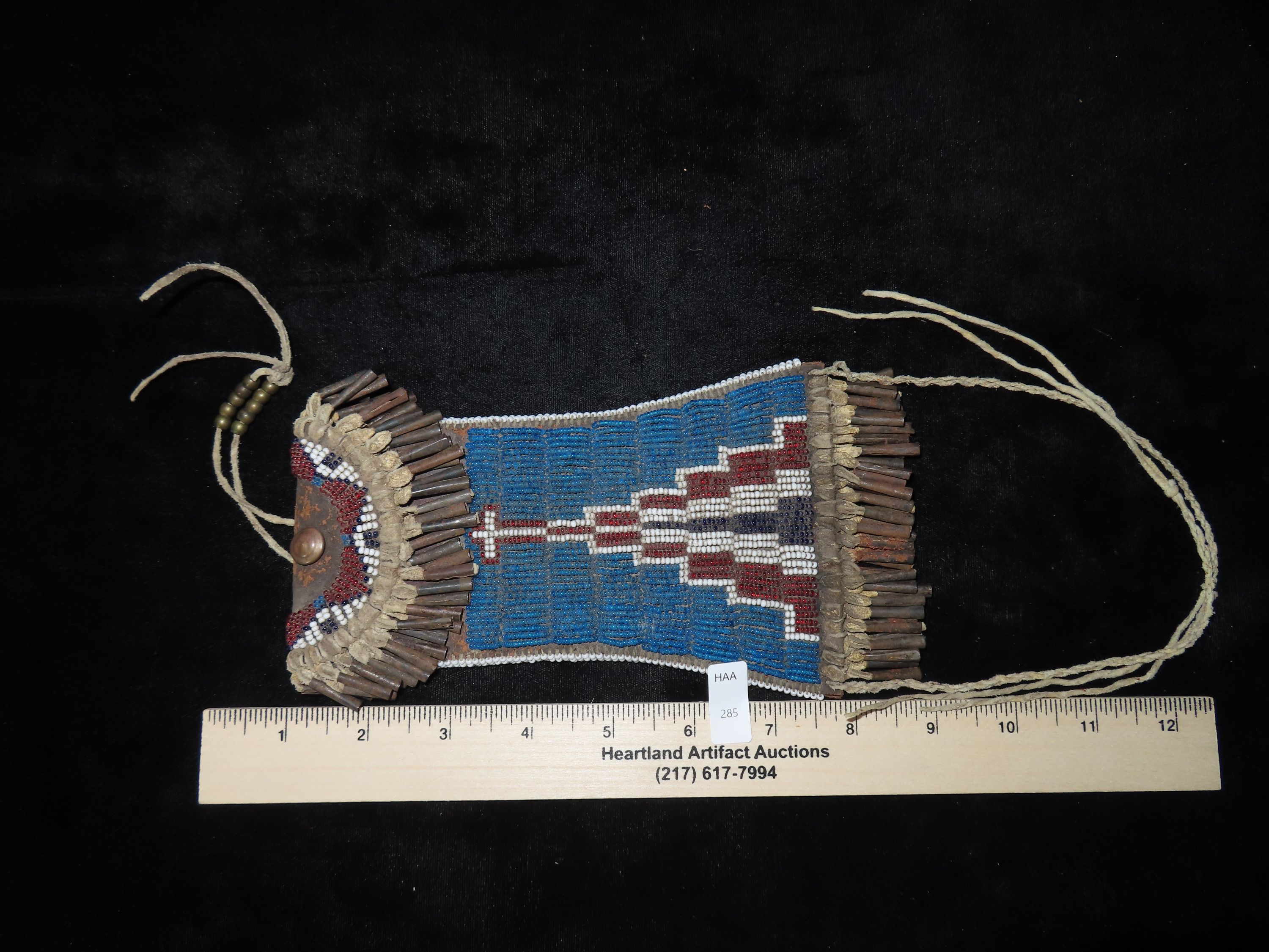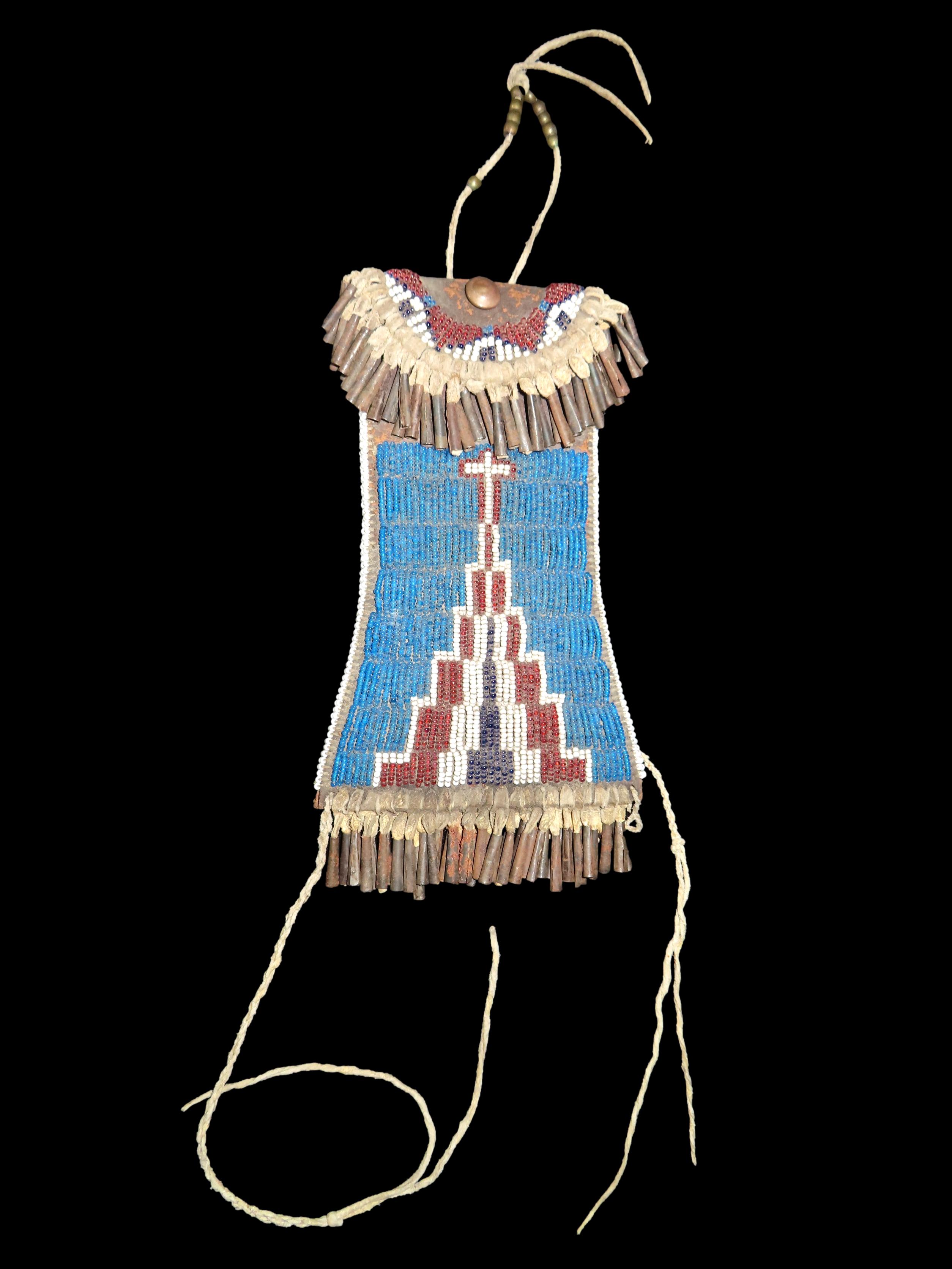 Beaded Kiowa-style Strike-a-Light Bag, no striker, and no beading on reverse side bottom. Lavishly adorned with Metal Cones, and striking Beadwork, highly collectible